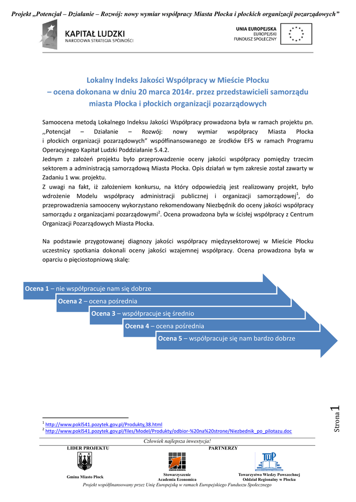 Projekt ,,Potencjał – Działanie – Rozwój: nowy wymiar współpracy Miasta Płocka i płockich organizacji pozarządowych” Lokalny Indeks Jakości Współpracy w Mieście Płocku – ocena dokonana w dniu 20 marca 2014r. przez przedstawicieli samorządu miasta Płocka i płockich organizacji pozarządowych Samoocena metodą Lokalnego Indeksu Jakości Współpracy prowadzona była w ramach projektu pn. ,,Potencjał – Działanie – Rozwój: nowy wymiar współpracy Miasta Płocka i płockich organizacji pozarządowych” współfinansowanego ze środków EFS w ramach Programu Operacyjnego Kapitał Ludzki Poddziałanie 5.4.2. Jednym z założeń projektu było przeprowadzenie oceny jakości współpracy pomiędzy trzecim sektorem a administracją samorządową Miasta Płocka. Opis działań w tym zakresie został zawarty w Zadaniu 1 ww. projektu. Z uwagi na fakt, iż założeniem konkursu, na który odpowiedzią jest realizowany projekt, było wdrożenie Modelu współpracy administracji publicznej i organizacji samorządowej1, do przeprowadzenia samooceny wykorzystano rekomendowany Niezbędnik do oceny jakości współpracy samorządu z organizacjami pozarządowymi2. Ocena prowadzona była w ścisłej współpracy z Centrum Organizacji Pozarządowych Miasta Płocka. Na podstawie przygotowanej diagnozy jakości współpracy międzysektorowej w Mieście Płocku uczestnicy spotkania dokonali oceny jakości wzajemnej współpracy. Ocena prowadzona była w oparciu o pięciostopniową skalę: Ocena 1 – nie współpracuje nam się dobrze Ocena 2 – ocena pośrednia Ocena 3 – współpracuje się średnio Ocena 4 – ocena pośrednia 1 2 http://www.pokl541.pozytek.gov.pl/Produkty,38.html http://www.pokl541.pozytek.gov.pl/files/Model/Produkty/odbior-%20na%20strone/Niezbednik_po_pilotazu.doc Człowiek najlepsza inwestycja! LIDER PROJEKTU Gmina Miasto Płock PARTNERZY Stowarzyszenie Academia Economica Towarzystwo Wiedzy Powszechnej Oddział Regionalny w Płocku Projekt współfinansowany przez Unię Europejską w ramach Europejskiego Funduszu Społecznego Strona 1 Ocena 5 – współpracuje się nam bardzo dobrze Projekt ,,Potencjał – Działanie – Rozwój: nowy wymiar współpracy Miasta Płocka i płockich organizacji pozarządowych” Interpretacja Ocena Obszar Wyniki oceny dokonanej przez uczestników spotkania Tworzenie polityk publicznych Realizacja zadań publicznych Rozwijanie infrastruktury współpracy 3 5 4 Czasem współpracujemy ze sobą, ale nieregularnie. Nie wszystkie polityki (w tym dokumenty, prawo lokalne itp.) podlegają konsultacjom. Programy współpracy, choć istnieją, to nie satysfakcjonują jednej ze stron, są sztampowe – nie do końca odzwierciedlają lokalne potrzeby, nie zawsze przekładają się na realia. Samorząd regularnie prowadzi konkursy dla organizacji pozarządowych, zleca też zadania publiczne w inny sposób. Co więcej, organizacje realizują zadania w bardzo różnych obszarach. W co najmniej kilku z nich istnieje stabilna współpraca, zawiązywane są formalne partnerstwa w różnych sprawach. Organizacje współuczestniczą w ocenie realizacji zadań publicznych „Samorząd raczej inwestuje w rozwój organizacji na swoim terenie. Organizuje dla nich szkolenia, udziela wsparcia merytorycznego (np. porad prawnych), raczej włącza się w organizację konferencji, przedstawiciele administracji czasami uczestniczą w spotkaniach środowisk pozarządowych. Organizacje mogą liczyć na pomoc, gdy chcą rozszerzyć swoją działalność, współpracować z innymi samorządami. Działa lokalna rada pożytku publicznego/zespoły/fora konsultacyjne itp.” Człowiek najlepsza inwestycja! LIDER PROJEKTU Gmina Miasto Płock PARTNERZY Stowarzyszenie Academia Economica Towarzystwo Wiedzy Powszechnej Oddział Regionalny w Płocku Projekt współfinansowany przez Unię Europejską w ramach Europejskiego Funduszu Społecznego Strona Międzysektorowa dyskusja nt. oceny współpracy była dokonywana w kontekście jej trzech najważniejszych aspektów (płaszczyzn) i właściwych dla nich obszarów. Skutkowała zdefiniowaniem następujących wniosków: I. Współpraca organizacji jednostek samorządu terytorialnego i organizacji pozarządowych w zakresie tworzenia polityk publicznych 1. W Mieście Płocku diagnozowanie problemów lokalnych odbywa się każdorazowo przy opracowywaniu dokumentów planistycznych. Nie ma jednak ustalonych zasad uczestnictwa organizacji pozarządowych w procesie diagnozy. Przedstawiciele organizacji pozarządowych zgłosiły potrzebę uczestnictwa w sporządzaniu diagnoz, które wprowadza się do podstawowych dokumentów planistycznych. 2. W zakresie wymiany informacji o obszarach działania organizacji pozarządowych oraz podejmowanych inicjatywach nie ma ustalonej procedury wzajemnego informowania się – 2 Średnia ocena jakości współpracy wyniosła 4. Projekt ,,Potencjał – Działanie – Rozwój: nowy wymiar współpracy Miasta Płocka i płockich organizacji pozarządowych” brak jednolitego systemu wymiany informacji branżowych, zgłoszono potrzebę utworzenia „mapy aktywności” jako narzędzia wymiany informacji a także poznania zalet praktycznego wykorzystania tego narzędzia. 3. W Mieście Płocku funkcjonuje przyjęty uchwałą Rady Miasta tryb konsultowania z organizacjami pozarządowymi projektów aktów prawa miejscowego w dziedzinach dotyczących działalności statutowej tych organizacji. Ponadto organizacje pozarządowe włączane są w prace nad projektami podstawowych dokumentów planistycznych poprzez pracę zespołów tematycznych. Nie ma jednak ujednoliconej procedury tworzenia dokumentów planistycznych, w tym uwzględniających rolę i miejsce NGO w procesach programowania. W mieście brak jest jednolitej procedury tworzenia dokumentów planistycznych, co przekłada się na brak zasad udziału organizacji pozarządowych w procesie ich tworzenia. Ponadto organizacje zgłosiły potrzebę 