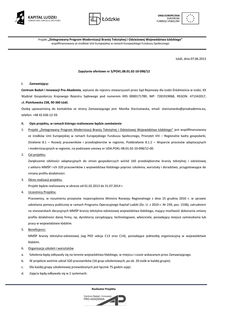 Projekt „Zintegrowany Program Modernizacji Branży Tekstylnej i Odzieżowej Województwa Łódzkiego” współfinansowany ze środków Unii Europejskiej w ramach Europejskiego Funduszu Społecznego Łódź, dnia 07.06.2013 Zapytanie ofertowe nr 5/POKL.08.01.02-10-098/12 I. Zamawiający: Centrum Badań i Innowacji Pro-Akademia, wpisane do rejestru stowarzyszeń przez Sąd Rejonowy dla Łodzi-Śródmieścia w Łodzi, XX Wydział Gospodarczy Krajowego Rejestru Sądowego pod numerem KRS 0000171789, NIP: 7281919068, REGON: 471342017, ul. Piotrkowska 238, 90-360 Łódź. Osobą upoważnioną do kontaktów ze strony Zamawiającego jest: Monika Staniszewska, email: [email protected], telefon: +48 42 636-12-59. II. 1. Opis projektu, w ramach którego realizowane będzie zamówienie Projekt „Zintegrowany Program Modernizacji Branży Tekstylnej i Odzieżowej Województwa Łódzkiego” jest współfinansowany ze środków Unii Europejskiej w ramach Europejskiego Funduszu Społecznego, Priorytet VIII – Regionalne kadry gospodarki, Działanie 8.1 – Rozwój pracowników i przedsiębiorstw w regionie, Poddziałanie 8.1.2 – Wsparcie procesów adaptacyjnych i modernizacyjnych w regionie, na podstawie umowy nr UDA.POKL-08.01.02-10-098/12-00. 2. Cel projektu: Zwiększenie zdolności adaptacyjnych do zmian gospodarczych wśród 160 przedsiębiorstw branży tekstylnej i odzieżowej z sektora MMŚP i ich 320 pracowników z województwa łódzkiego poprzez szkolenia, warsztaty i doradztwo, przygotowujące do zmiany profilu działalności. 3. Okres realizacji projektu: Projekt będzie realizowany w okresie od 01.02.2013 do 31.07.2014 r. 4. Uczestnicy Projektu: Pracownicy, w rozumieniu przepisów rozporządzenia Ministra Rozwoju Regionalnego z dnia 15 grudnia 2010 r. w sprawie udzielania pomocy publicznej w ramach Programu Operacyjnego Kapitał Ludzki (Dz. U. z 2010 r. Nr 239, poz. 1538), zatrudnieni na stanowiskach decyzyjnych MMŚP branży tekstylno-odzieżowej województwa łódzkiego, mający możliwość dokonania zmiany profilu działalności danej firmy, np. dyrektorzy zarządzający, technologowie, właściciele, posiadający miejsce zamieszkania lub pracy w województwie łódzkim. 5. Beneficjenci: MMŚP branży tekstylno-odzieżowej (wg PKD sekcja C13 oraz C14), posiadające jednostkę organizacyjną w województwie łódzkim. 6. Organizacja szkoleń i warsztatów a. Szkolenia będą odbywały się na terenie województwa łódzkiego, w miejscu i czasie wskazanym przez Zamawiającego. b. W projekcie weźmie udział 320 pracowników (16 grup szkoleniowych, po ok. 20 osób w każdej grupie). c. Dla każdej grupy szkoleniowej przewidzianych jest łącznie 75 godzin zajęć. d. Zajęcia będą odbywały się w 2 systemach: Realizator Projektu Projekt „Zintegrowany Program Modernizacji Branży Tekstylnej i Odzieżowej Województwa Łódzkiego” współfinansowany ze środków Unii Europejskiej w ramach Europejskiego Funduszu Społecznego Pierwszy – system podstawowy – zajęcia prowadzone w dni robocze w godzinach 16.30 – 19.45 – w sumie 18 dni szkoleniowych. Drugi – system elastyczny – zajęcia dopasowane do preferencji danej grupy (możliwość łączenia zajęć popołudniowych w tygodniu z 8 godzinnymi zajęciami w weekendy lub tylko zajęcia weekendowe). e. Szkolenia i warsztaty obejmują następujące bloki tematyczne: Nowoczesne technologie dla branży tekstylno-odzieżowej; Nowoczesne formy organizacji produkcji i e-handlu; Finansowanie zmian profilu działalności przedsiębiorstwa. III. Rodzaj zamówienia, Wspólny Słownik Zamówień (CPV) Klasyfikacja zamówienia: 80500000-9 Usługi szkoleniowe. IV. Przedmiot zamówienia 1. Przedmiotem zamówienia jest przygotowanie i przeprowadzenie szkoleń i/lub warsztatów w temacie Umowy handlowokooperacyjne dla Uczestników Projektu w ramach projektu „Zintegrowany Program Modernizacji Branży Tekstylnej i Odzieżowej Województwa Łódzkiego”. 2. Celem ogólnym szkoleń i/lub warsztatów jest podniesienie wiedzy pracowników przedsiębiorstw branży tekstylno-odzieżowej sektora MMŚP z województwa łódzkiego (Uczestników Projektu) w poniższych obszarach tematycznych: a. Blok tematyczny I - Nowoczesne technologie dla branży tekstylno-odzieżowej Celem realizacji szkoleń i warsztatów w przedmiotowym bloku jest przygotowanie firmy do sformułowania strategii dotyczącej możliwości zastosowania nowoczesnych technologii z uwzględnieniem m.in. rozwiązań dla inteligentnych tekstyliów oraz złożenia dokumentów rozszerzających zakres prowadzonej działalności. b. Blok tematyczny II - Nowoczesne formy organizacji produkcji i e-handlu Celem realizacji szkoleń i warsztatów w przedmiotowym bloku jest przygotowanie firmy do sformułowania strategii dotyczącej możliwości zastosowania nowoczesnych form organizacji produkcji i e-handlu oraz złożenia dokumentów rozszerzających zakres prowadzonej działalności. c. Blok tematyczny III - Finansowanie zmiany profilu działalności przedsiębiorstwa Celem bloku jest przygotowanie montażu finansowego uwzględniającego finansowanie inwestycji wskazanych w indywidualnych strategiach przedsiębiorstw powstałych w dwóch powyższych blokach. 3. Przygotowanie szkoleń i/lub warsztatów polega na opracowaniu: konspektu szkolenia, prezentacji w programie Microsoft PowerPoint, testów wiedzy, materiałów dla Uczestników oraz materiałów e-learningowych, zgodnie z zasadami andragogiki i zaleceniami Zamawiającego. 4. Przeprowadzenie szkoleń i/lub warsztatów oznacza realizację zajęć we wskazanym temacie w miejscu i czasie, wyznaczonym przez Zamawiającego z uwzględnieniem czasu trwania przerw między zajęciami. Realizator Projektu Projekt „Zintegrowany Program Modernizacji Branży Tekstylnej i Odzieżowej Województwa Łódzkiego” współfinansowany ze środków Unii Europejskiej w ramach Europejskiego Funduszu Społecznego V. Zakres usług Oferenta w ramach prowadze
