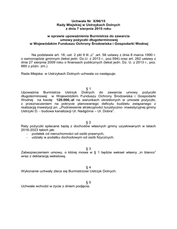 Uchwała Nr X/96/15 Rady Miejskiej w Ustrzykach Dolnych z dnia 7 sierpnia 2015 roku w sprawie upoważnienia Burmistrza do zawarcia umowy pożyczki długoterminowej w Wojewódzkim Funduszu Ochrony Środowiska i Gospodarki Wodnej Na podstawie art. 18, ust. 2 pkt 9 lit „c” ,art. 58 ustawy z dnia 8 marca 1990 r. o samorządzie gminnym (tekst jedn. Dz.U. z 2013 r., poz.594) oraz art. 262 ustawy z dnia 27 sierpnia 2009 roku o finansach publicznych (tekst jedn. Dz. U. z 2013 r., poz. 885 z późn. zm.) Rada Miejska w Ustrzykach Dolnych uchwala co następuje: §1 Upoważnia Burmistrza Ustrzyk Dolnych do zawarcia umowy pożyczki długoterminowej w Wojewódzkim Funduszu Ochrony Środowiska i Gospodarki Wodnej na kwotę 120.000,-zł na warunkach określonych w umowie pożyczki, z przeznaczeniem na pokrycie planowanego deficytu budżetu związanego z realizacją inwestycji pn. „Podniesienie atrakcyjności turystyczno- inwestycyjnej gminy Ustrzyki D. - budowa kanalizacji Ul. Nadgórna – Ul. Dobra”. §2 Raty pożyczki spłacane będą z dochodów własnych gminy uzyskiwanych w latach 2016-2023 takich jak: - podatek od nieruchomości od osób prawnych, - udziały w podatku dochodowym od osób fizycznych. §3 Zabezpieczeniem umowy, o której mowa w § 1 będzie weksel własny „in blanco” wraz z deklaracją wekslową. §4 Wykonanie uchwały zleca się Burmistrzowi Ustrzyk Dolnych. §5 Uchwała wchodzi w życie z dniem podjęcia.