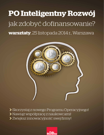 PO Inteligentny Rozwój jak zdobyć dofinansowanie? warsztaty, 25 listopada 2014 r., Warszawa WSkorzystaj z nowego Programu Operacyjnego! WNawiąż współpracę z naukowcami! WZwiększ innowacyjność swej firmy! Jak ugryźć 11 mld zł? Już wiemy, jak będą wyglądać unijne działania w II osi (z pięciu) Programu Operacyjnego Inteligentny Rozwój (POIR) na lata 2014-20. To aż 2,688 mld EUR (11,3 mld zł). Ta potężna kwota zostanie przeznaczona na wsparcie innowacji, czyli inwestycje w firmach. Główny cel nowego instrumentu? Pobudzić innowacyjność, a szczególnie wzmocnić ich współpracę z jednostkami naukowymi, czego efektem ma być wyższy poziom komercjalizacji wyników prac badawczych. →→ Czym nowy Program różni się od dotychczasowego – Innowacyjnej Gospodarki? →→ Jak przygotować projekt badawczo rozwojowy? →→ Jakie są najczęściej popełniane błędy? →→ Gdzie szukać najtańszego finansowania projektu? →→ W jaki sposób skonstruować umowę między jednostką naukową a przedsiębiorstwem? →→ Czego uczelnie oczekują od biznesu? i wreszcie: →→ Dlaczego innowacyjność jest tak ważna dla gospodarki? Te praktyczne informacje otrzymają Państwo podczas naszego wyjątkowego szkolenia. Udało nam się zgromadzić wybitnych ekspertów, przedstawicieli świata finansów, administracji państwowej, funduszy europejskich i nauki, którzy odpowiedzą na wszystkie Państwa pytania! Na warsztat szczególnie zapraszamy: Wwłaścicieli firm i kadrę zarządzającą; Wmenedżerów ds. rozwoju i strategii; Wspecjalistów ds. funduszy europejskich; Wpełnomocników ds. finansowania projektów; Wprzedstawicieli świata nauki; Woraz wszystkich, którzy chcą podnieść swoje kwalifikacje w zakresie finansowania funduszami europejskimi! Warsztat dla wszystkich, którzy kiedykolwiek rozważali finansowanie firmy z funduszy unijnych! W imieniu Pulsu Biznesu, serdecznie zapraszam! Marcin Dobrowolski O nas „Puls Biznesu” wydawany jest przez spółkę Bonnier Business (Polska) Sp. z o.o. należącą do szwedzkiego koncernu Bonnier Group. To jedyny dziennik na polskim rynku poświęcony wyłącznie gospodarce. „Puls Biznesu” stara się być źródłem właściwych decyzji dla czytelników, rzecznikiem biznesu i przedsiębiorczości. „Puls Biznesu” jest również organizatorem licznych konferencji dla środowiska biznesowego. Umożliwiając polskim biznesmenom spotkania ze światowymi autorytetami, wydawca nie zapomina o promocji rodzimych firm. Dla nich organizujerankingi i plebiscyty – Gazele Biznesu, Filary Polskiej Gospodarki czy Giełdowa Spółka Roku. Puls Biznesu” jest częścią grupy Bonnier, koncernu medialnego łączącego od ponad 200 lat wiedzę i doświadczenie 175 firm w 16 krajach. Organizator Patroni medialni KONTAKT Marcin Dobrowolski – Project Manager T +48 22 333 9777, F +48 22 333 9778 [email protected] PROGRAM - 25 listopada 2014 r. 08:30 Rejestracja, poranna kawa 08:55 Powitanie i przedstawienie agendy Marcin Dobrowolski, Puls Biznesu; 09:00 Czas na POIR - co trzeba wiedzieć? Łukasz Małecki, kierujący zespołem ds. programowania, Ministerstwo Infrastruktury i Rozwoju; →→ →→ →→ →→ →→ Perspektywa finansowa 2014-2020; Podstawowe informacje nt PO IR; Cele i beneficjenci; Zakres wsparcia; Komplementarność z innymi programami. →→ Zapewnienie przedsiębiorcom dostępu do finansowania działalności o wysokim i podwyższonym ryzyku przy wykorzystaniu gwarancji. 12:15 Oczami nauki. Jak uniknąć problemów relacji biznesowych środowiska akademickiego z przedsiębiorcami? Krzysztof Wieczorek, główny specjalista pełnomocnik Rektora ds. inżynierii finansowania projektów, Politechnika Warszawska; 13:00 Przerwa na obiad 09:45 Wsparcie na projekty badawczo-rozwojowe Bogusława Mazurek, senior manager, Crido Taxand; 14:00 Wsparcie na inwestycje (duże firmy, MSP) Szymon Żółciński, partner w Crido Taxand, Dział Doradztwa Europejskiego; →→ Nowe kierunki w zakresie kreowania rynku B+R →→ Pomoc publiczna na projekty B+R – najważniejsze zasady →→ Koszty kwalifikowane →→ Jak przygotować projekt B+R pod kątem wymogów programu wsparcia – praktyczne wskazówki →→ Wybrane programy wsparcia z PO IR →→ Nowe zasady pomocy publicznej dla projektów inwestycyjno-wdrożeniowych →→ Koszty kwalifikowane, ważne definicje →→ Jak przygotować projekt inwestycyjno-wdrożeniowy pod kątem wymogów programu wsparcia – praktyczne wskazówki →→ Wybrane programy wsparcia z PO IR 10:30 Jak obudzić innowacyjność? Aleksander Kwiatkowski, menedżer, specjalista w zakresie finansowania innowacyjnych projektów biznesowych; →→ Czym jest innowacyjność? Jak zdobyć finansowanie na innowacyjne projekty? Jakie rozwiązania dominują w Polsce, a jakie za granicą? 11:15 Przerwa kawowa 11:30 Formy wsparcia innowacji przez Bank Gospodarstwa Krajowego Dr Piotr Kuszewski, prezes, TFI BGK Podczas prelekcji omówione będą m.in. następujące instrumenty: →→ Fundusz funduszy dokonujący inwestycji kapitałowych i quasi-kapitałowych w fundusze podwyższonego ryzyka w celu zwiększenia aktywności inwestorów prywatnych w zakresie dokonywania inwestycji w MŚP realizujące innowacyjne projekty o dużym potencjale rynkowym. →→ Kredyt na innowacje technologiczne – częściowo spłacany przez BGK w formie premii z Funduszu Kredytu Technologicznego – wspierający inwestycje MSP w zakresie wdrożeń nowych technologii i uruchamiania na ich podstawie produkcji / świadczenia nowych lub znacząco ulepszonych produktów lub usług. 14:45 Prawne formy ochrony własności intelektualnej Norbert Walasek, adwokat w praktyce ochrony własności intelektualnej, Wardyński i Wspólnicy; →→ Czym jest ochrona patentowa wynalazków, wzorów użytkowych, wzorów przemysłowych; czym różni się ochrona polska od europejskiej; →→ Jak przebiega proces ochrony własności intele