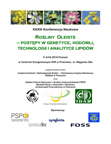 XXXIII Konferencja Naukowa ROŚLINY OLEISTE – POSTĘPY W GENETYCE, HODOWLI, TECHNOLOGII I ANALITYCE LIPIDÓW 5–6.04.2016 Poznań w Centrum Kongresowym IOR w Poznaniu, ul. Węgorka 20a organizowana przez Instytut Hodowli i Aklimatyzacji Roślin – Państwowy Instytut Badawczy Oddział w Poznaniu oraz Zakład Chemii Żywności i Analizy Instrumentalnej ITŻPR Wydział Nauk o Żywności i Żywieniu Uniwersytet Przyrodniczy w Poznaniu Sponsorzy: PATRONAT HONOROWY prof. dr hab. Edward Arseniuk — dyrektor IHAR – PIB prof. dr hab. Jan Pikul — prorektor Uniwersytetu Przyrodniczego w Poznaniu KOMITET NAUKOWY Przewodniczące: Członkowie: prof. dr hab. Iwona Bartkowiak-Broda IHAR – PIB dr hab. Magdalena Rudzińska UP w Poznaniu prof. dr hab. Teresa Cegielska-Taras, IHAR – PIB dr hab. Marzena Gawrysiak-Witulska UP w Poznaniu dr Dorota Klensporf-Pawlik UE w Poznaniu dr Dominik Kmiecik UP w Poznaniu prof. dr hab. Jan Krzymański dr hab. Katarzyna Mikołajczyk, IHAR – PIB dr Krzysztof Michalski, IHAR – PIB dr Katarzyna Ratusz SGGW w Warszawie dr hab. Michał Starzycki prof. nadzw. dr Tadeusz Wałkowski, IHAR – PIB dr hab. Marek Wójtowicz, IHAR – PIB KOMITET ORGANIZACYJNY prof. dr hab. Iwona Bartkowiak-Broda dr hab. Magdalena Rudzińska Katarzyna Frąckowiak dr Katarzyna Gacek dr hab. Marzena Gawrysiak-Witulska mgr Maria Ogrodowczyk mgr Maria Wawrzyniak ADRES: Instytut Hodowli i Aklimatyzacji Roślin – PIB, ul. Strzeszyńska 36, 60-479 Poznań Telefon: E-mail: 61 823 37 21, 61 846 42 32, Fax: 61 823 38 71 [email protected] — sprawy organizacyjne [email protected] — wydawnictwo XXXIII Konferencja Naukowa „Rośliny Oleiste – postępy w genetyce, hodowli, technologii i analityce lipidów” Prezentacja plakatów Organizatorzy przygotują tablice plakatowe o wymiarach: szerokość 150 cm × wysokość 108 cm, na których będą umieszczone numery zgłoszonych plakatów – zgodne z numerami podanymi w programie Konferencji. Spotkanie towarzyskie odbędzie się 5 kwietnia 2016 r. o godzinie 1900 w Kolegium Rungego przy Uniwersytecie Przyrodniczym w Poznaniu. Po zakończeniu sesji plenarnej autokary przewiozą uczestników konferencji, a po spotkaniu zainteresowanych przewiozą do hotelu. Wydawnictwa Pełne teksty prac można zgłosić do druku w czasopismach: • Rośliny Oleiste – Oilseed Crops (w języku angielskim lub polskim) • Acta Scientiarum Polonorum Technologia Alimentaria (w języku angielskim) • Nauka Przyroda Technologie (w języku polskim) Osoby zainteresowane opublikowaniem prac proszone są o przygotowanie artykułów zgodnie z instrukcją redakcji: http://www.ihar.poznan.pl/wskazowki.html http: //www.food.actapol.net/pl/dla autorów http://www.npt.up-poznan.net/pl/wskazowki dla autorów Koszt druku artykułu ponoszą autorzy w wysokości wskazanej przez poszczególne czasopisma. Opłata opłata konferencyjna za udział — 600 zł + 23% VAT opłata dla członków Sekcji Chemii i Technologii Tłuszczów — 450 zł + 23% VAT opłata dla doktorantów — 250 zł + 23% VAT Opłata konferencyjna obejmuje: • udział w obradach, • koszty organizacyjne, • „Materiały Konferencyjne” oraz 35 i 36 tom rocznika „ROŚLINY OLEISTE – OILSEED CROPS”, • lunch, kawa, herbata w przerwie, • udział w spotkaniu towarzyskim w dniu 5.04.2016 r. Opłatę prosimy dokonać przelewem na konto: Instytut Hodowli i Aklimatyzacji Roślin – PIB, Oddział w Poznaniu Bank Millennium, konto nr 48 1160 2202 0000 0000 5809 8187 z dopiskiem „Konferencja 2016” i podaniem nazwisk osób, za które zapłacono.