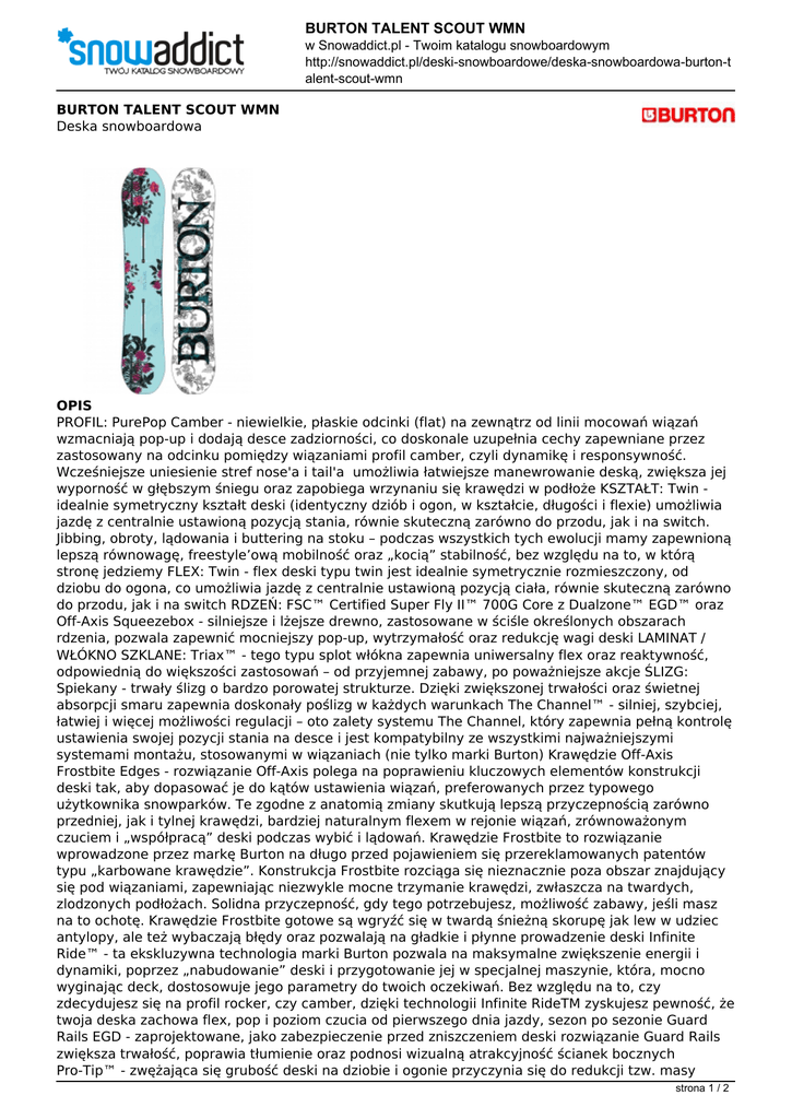 BURTON TALENT SCOUT WMN w Snowaddict.pl - Twoim katalogu snowboardowym http://snowaddict.pl/deski-snowboardowe/deska-snowboardowa-burton-t alent-scout-wmn BURTON TALENT SCOUT WMN Deska snowboardowa OPIS PROFIL: PurePop Camber - niewielkie, płaskie odcinki (flat) na zewnątrz od linii mocowań wiązań wzmacniają pop-up i dodają desce zadziorności, co doskonale uzupełnia cechy zapewniane przez zastosowany na odcinku pomiędzy wiązaniami profil camber, czyli dynamikę i responsywność. Wcześniejsze uniesienie stref nose'a i tail'a umożliwia łatwiejsze manewrowanie deską, zwiększa jej wyporność w głębszym śniegu oraz zapobiega wrzynaniu się krawędzi w podłoże KSZTAŁT: Twin idealnie symetryczny kształt deski (identyczny dziób i ogon, w kształcie, długości i flexie) umożliwia jazdę z centralnie ustawioną pozycją stania, równie skuteczną zarówno do przodu, jak i na switch. Jibbing, obroty, lądowania i buttering na stoku – podczas wszystkich tych ewolucji mamy zapewnioną lepszą równowagę, freestyle’ową mobilność oraz „kocią” stabilność, bez względu na to, w którą stronę jedziemy FLEX: Twin - flex deski typu twin jest idealnie symetrycznie rozmieszczony, od dziobu do ogona, co umożliwia jazdę z centralnie ustawioną pozycją ciała, równie skuteczną zarówno do przodu, jak i na switch RDZEŃ: FSC™ Certified Super Fly II™ 700G Core z Dualzone™ EGD™ oraz Off-Axis Squeezebox - silniejsze i lżejsze drewno, zastosowane w ściśle określonych obszarach rdzenia, pozwala zapewnić mocniejszy pop-up, wytrzymałość oraz redukcję wagi deski LAMINAT / WŁÓKNO SZKLANE: Triax™ - tego typu splot włókna zapewnia uniwersalny flex oraz reaktywność, odpowiednią do większości zastosowań – od przyjemnej zabawy, po poważniejsze akcje ŚLIZG: Spiekany - trwały ślizg o bardzo porowatej strukturze. Dzięki zwiększonej trwałości oraz świetnej absorpcji smaru zapewnia doskonały poślizg w każdych warunkach The Channel™ - silniej, szybciej, łatwiej i więcej możliwości regulacji – oto zalety systemu The Channel, który zapewnia pełną kontrolę ustawienia swojej pozycji stania na desce i jest kompatybilny ze wszystkimi najważniejszymi systemami montażu, stosowanymi w wiązaniach (nie tylko marki Burton) Krawędzie Off-Axis Frostbite Edges - rozwiązanie Off-Axis polega na poprawieniu kluczowych elementów konstrukcji deski tak, aby dopasować je do kątów ustawienia wiązań, preferowanych przez typowego użytkownika snowparków. Te zgodne z anatomią zmiany skutkują lepszą przyczepnością zarówno przedniej, jak i tylnej krawędzi, bardziej naturalnym flexem w rejonie wiązań, zrównoważonym czuciem i „współpracą” deski podczas wybić i lądowań. Krawędzie Frostbite to rozwiązanie wprowadzone przez markę Burton na długo przed pojawieniem się przereklamowanych patentów typu „karbowane krawędzie”. Konstrukcja Frostbite rozciąga się nieznacznie poza obszar znajdujący się pod wiązaniami, zapewniając niezwykle mocne trzymanie krawędzi, zwłaszcza na twardych, zlodzonych podłożach. Solidna przyczepność, gdy tego potrzebujesz, możliwość zabawy, jeśli masz na to ochotę. Krawędzie Frostbite gotowe są wgryźć się w twardą śnieżną skorupę jak lew w udziec antylopy, ale też wybaczają błędy oraz pozwalają na gładkie i płynne prowadzenie deski Infinite Ride™ - ta ekskluzywna technologia marki Burton pozwala na maksymalne zwiększenie energii i dynamiki, poprzez „nabudowanie” deski i przygotowanie jej w specjalnej maszynie, która, mocno wyginając deck, dostosowuje jego parametry do twoich oczekiwań. Bez względu na to, czy zdecydujesz się na profil rocker, czy camber, dzięki technologii Infinite RideTM zyskujesz pewność, że twoja deska zachowa flex, pop i poziom czucia od pierwszego dnia jazdy, sezon po sezonie Guard Rails EGD - zaprojektowane, jako zabezpieczenie przed zniszczeniem deski rozwiązanie Guard Rails zwiększa trwałość, poprawia tłumienie oraz podnosi wizualną atrakcyjność ścianek bocznych Pro-Tip™ - zwężająca się grubość deski na dziobie i ogonie przyczynia się do redukcji tzw. masy strona 1 / 2 BURTON TALENT SCOUT WMN w Snowaddict.pl - Twoim katalogu snowboardowym http://snowaddict.pl/deski-snowboardowe/deska-snowboardowa-burton-t alent-scout-wmn rotującej, czyli ciężaru w miejscach, które mają duże znaczenie dla ułatwienia manewrowania deską Hardcore’owa, o niewyparzonej gębie – tak można by scharakteryzować tę pełną dynamiki deskę, gdyby była człowiekiem. A skoro nie jest, wystarczy powiedzieć, że w jej walorach – jak choćby w profilu PurePop Camber – można się zakochać od pierwszej jazdy Musisz wiedzieć, że misją deski Talent Scout jest zapewnienie Ci jak największej progresji podczas sesji w snowparkach. W tym celu, bazując na podstawach konstrukcyjnych rodem z modelu Deja Vu, dodano profil PurePop Camber, który wzmacnia energię wybicia, niezbędną do ewolucji typu ollie, poprzez zapewnienie tradycyjnej dla tego profilu reaktywności, połączonej z zachęcającą do zabawy charakterystyką. Zaprojektowany tak, aby pasował jak sprawdzona rękawiczka, Talent Scout wykorzystuje technologię Off-Axis, aby odpowiednio dostosować konstrukcję profilu rdzenia Squeezebox oraz krawędzi Frostbite Edges. Oferuje też typową dla freestylerów wielkość stance’u, co pozwala uzyskać naturalny flex deski oraz zapewnić solidne trzymanie krawędzi i lepszą kontrolę, niezbędną do płynnego wykonywania butterów GRAFIKA / ARTYSTA: Josie Furchgott Sourdiffe [www.feistyink.wordpress.com] - pochodząca z Burlington w stanie Vermont (tak jak I Burton) print maker, malarka oraz tatuażystka, Josie Furchgott Sourdiffe, jest podziwiana za jej pełne emocji grafiki. Równoważąc motyw zagłady z miłością lub mroczne klimaty z żywymi kolorami, tworzy jedne z najpiękniejszych grafik na nasze deski 
