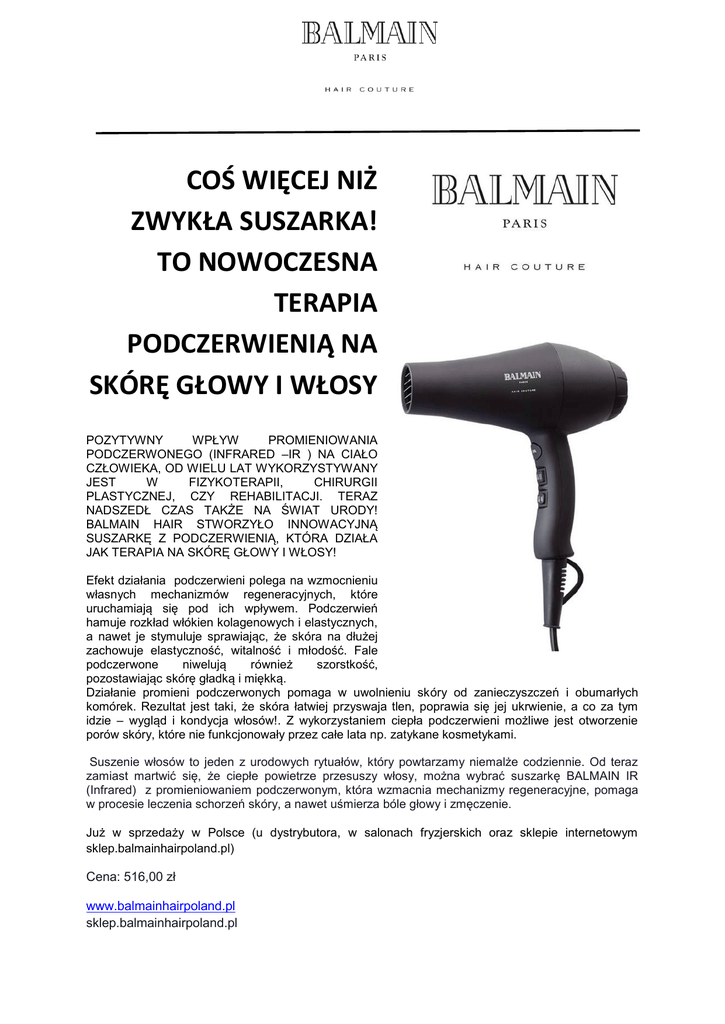 COŚ WIĘCEJ NIŻ ZWYKŁA SUSZARKA! TO NOWOCZESNA TERAPIA PODCZERWIENIĄ NA SKÓRĘ GŁOWY I WŁOSY POZYTYWNY WPŁYW PROMIENIOWANIA PODCZERWONEGO (INFRARED –IR ) NA CIAŁO CZŁOWIEKA, OD WIELU LAT WYKORZYSTYWANY JEST W FIZYKOTERAPII, CHIRURGII PLASTYCZNEJ, CZY REHABILITACJI. TERAZ NADSZEDŁ CZAS TAKŻE NA ŚWIAT URODY! BALMAIN HAIR STWORZYŁO INNOWACYJNĄ SUSZARKĘ Z PODCZERWIENIĄ, KTÓRA DZIAŁA JAK TERAPIA NA SKÓRĘ GŁOWY I WŁOSY! Efekt działania podczerwieni polega na wzmocnieniu własnych mechanizmów regeneracyjnych, które uruchamiają się pod ich wpływem. Podczerwień hamuje rozkład włókien kolagenowych i elastycznych, a nawet je stymuluje sprawiając, że skóra na dłużej zachowuje elastyczność, witalność i młodość. Fale podczerwone niwelują również szorstkość, pozostawiając skórę gładką i miękką. Działanie promieni podczerwonych pomaga w uwolnieniu skóry od zanieczyszczeń i obumarłych komórek. Rezultat jest taki, że skóra łatwiej przyswaja tlen, poprawia się jej ukrwienie, a co za tym idzie – wygląd i kondycja włosów!. Z wykorzystaniem ciepła podczerwieni możliwe jest otworzenie porów skóry, które nie funkcjonowały przez całe lata np. zatykane kosmetykami. Suszenie włosów to jeden z urodowych rytuałów, który powtarzamy niemalże codziennie. Od teraz zamiast martwić się, że ciepłe powietrze przesuszy włosy, można wybrać suszarkę BALMAIN IR (Infrared) z promieniowaniem podczerwonym, która wzmacnia mechanizmy regeneracyjne, pomaga w procesie leczenia schorzeń skóry, a nawet uśmierza bóle głowy i zmęczenie. Już w sprzedaży w Polsce (u dystrybutora, w salonach fryzjerskich oraz sklepie internetowym sklep.balmainhairpoland.pl) Cena: 516,00 zł www.balmainhairpoland.pl sklep.balmainhairpoland.pl