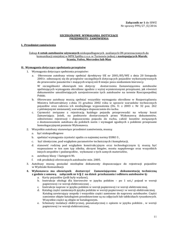 Załącznik nr 1 do SIWZ Nr sprawy PPU/27 /Z/2016 SZCZEGÓŁOWE WYMAGANIA DOTYCZĄCE PRZEDMIOTU ZAMÓWIENIA I. Przedmiot zamówienia Zakup 4 sztuk autobusów używanych niskopodłogowych zasilanych ON przeznaczonych do komunikacji miejskiej w MPK Spółka z o.o. w Tarnowie jednej z nastepujących Marek: Scania, Volvo, Mercedes lub Man II. Wymagania dotyczące spełniania przepisów 1. Wymagania dotyczące spełnienia przepisów: a. Oferowane autobusy winny spełniać dyrektywy UE nr 2001/85/WE z dnia 20 listopada 2001r. odnoszącej się do przepisów szczególnych dotyczących pojazdów wykorzystywanych do przewozów pasażerów i mających więcej niż 8 miejsc poza siedzeniem kierowcy. W szczególności obowiązek ten dotyczy dostarczenia Zamawiającemu autobusów spełniających wymagania określone zgodnie z wyżej wymienionymi przepisami, jak również dokumentów umożliwiających zarejestrowanie tych autobusów na terenie Rzeczpospolitej Polski. b. Oferowane autobusy muszą spełniać wszystkie wymagania określone w Rozporządzeniu Ministra Infrastruktury z dnia 31 grudnia 2002 roku w sprawie warunków technicznych pojazdów oraz zakresu ich niezbędnego wyposażenia (Dz. U. z 2003 r. Nr 32 poz. 262 z późniejszymi zmianami), warunkujące dopuszczenie do ruchu. c. Czynności związane z rejestracją każdego pojazdu przeprowadzi na własny koszt Zamawiający. Jeżeli, na podstawie dostarczonych przez Wykonawcę dokumentów, odmówiono rejestracji i dopuszczenia pojazdu do ruchu, całość kosztów związanych z dostosowaniem autobusu do polskich norm i wymagań zgodnych z polskimi przepisami homologacyjnymi poniesie Wykonawca. 2. Wszystkie autobusy stanowiące przedmiot zamówienia, muszą: a. być niskopodłogowe b. spełniać wymagania czystości spalin co najmniej normy EURO 3 , c. być identyczne, pod względem parametrów technicznych i kompletacji, d. stanowić rodzinę pod względem konstrukcyjnym oraz technologicznym tj. muszą być wyposażone w ten sam typ silnika, skrzyni biegów, mostu napędowego oraz wszystkich innych zespołów i podzespołów, wykonane z tych samych materiałów, e. autobusy klasy I kategorii M3 f. rok produkcji oferowanych autobusów min. 2005. 3. Autobusy muszą posiadać niezbędne dokumenty dopuszczające do rejestracji pojazdów w Wydziale Komunikacji. 4. Wykonawca ma obowiązek dostarczyć Zamawiającemu dokumentację techniczną z godnie z umową załącznik nr 6 § 2 na dzień przekazania i odbioru autobusów tj: a. Karty pojazdów (jeśli były wydane), b. Instrukcje obsługi dla kierowców w języku polskim – po 1 szt./ pojazd w wersji papierowej i w wersji elektronicznej , c. Instrukcje napraw w języku polskim w wersji papierowej i w wersji elektronicznej, d. Katalog części zamiennych języku polskim w wersji papierowej i w wersji elektronicznej. Katalog zawierający zespoły i wszystkie części zamienne do naprawy autobusów. Części zamienne objęte katalogiem przedstawione są na zdjęciach lub tabliczkach rysunkowych. Wszystkie części są objęte nr katalogowym. e. Schematy instalacji elektrycznej, pneumatycznej z opisem w języku polskim , w wersji papierowej i w wersji elektronicznej, 11 f. Dokumentację obsługowo-naprawczą w języku polskim ze szczególnym uwzględnieniem specyfikacji obsług technicznych dla oferowanej kompletacji w wersji papierowej i w wersji elektronicznej, g. Wszystkie instrukcje i katalogi muszą być tożsame z wersją oferowanych autobusów . III. Wymagania dotyczące parametrów technicznych autobusów lp. cecha, parametr minimalna liczba miejsc pasażerskich: 1. siedzących siedzących i stojących ogółem drzwi pasażerskie: spełniające wymagania 2. 3. wielkość liczba drzwi pasażerskich układ drzwi pasażerskich 30 90 ( razem z miejscem dla kierowcy) 3 2-2-2 lub 2-2-1 ukształtowanie podłogi: autobus niskopodłogowy, podłoga pokryta wykładziną antypoślizgową 4. całkowita szerokość autobusu 2,50 ÷ 2,55 [m] 5. całkowita wysokość autobusu Max: 3,27 [m] 6. całkowita długość autobusu 11,80 ÷ 12,10 [m] IV. Wymagania dotyczące kompletacji autobusów lp. 1. 2. zespół, instalacja Przebieg Silnik wymagania 3. Zbiornik paliwa 4. Skrzynia biegów 5. Układ kierowniczy do 900 000 km 6 – cio cylindrowy o zapłonie samoczynnym ,czterosuwowy, rzędowy, wysokoprężny, chłodzony cieczą - spełniający normę emisji spalin co najmniej EURO 3, o pojemności 8-9 dcm³. Układ turbodoładowania z chłodzeniem powietrza doładowującego. Umiejscowiony z tyłu pojazdu. moc od 160 kW. złącze diagnostyczne umożliwiające diagnozowanie silnika z zewnętrznego urządzenia diagnostycznego. sprawny wskaźnik zanieczyszczenia filtra powietrza 1 zbiornik paliwa wykonany z materiału odpornego na korozje i utlenianie o pojemności minimum 250 dcm³ lub 2 zbiorniki po 150 dcm³ automatyczna z przekładnią hydrokinetyczną wielobiegowa + bieg wsteczny ze zintegrowanym zwalniaczem hydraulicznym uruchamianym pedałem hamulca. ze wspomaganiem hydraulicznym 12 lp. 6. zespół, instalacja Układ pneumatyczny wymagania obwód przygotowania powietrza wyposażony m. in. w: - sprężarkę dwucylindrową o wydatku wymaganym w eksploatacji w ruchu miejskim - osuszacz powietrza zbiorniki powietrza – odporne na korozję: stopy aluminium, stal nierdzewna schemat układu pneumatycznego z uwzględnieniem , ECAS, MTS 7. Układ hamulcowy 8. 9. System EBS lub ABS/ASR Zawieszenie wyposażony w: hamulce tarczowe na przedniej oraz tylnej osi pojazdu hamulec przystankowy uruchamiany automatycznie, gdy którekolwiek drzwi pasażerskie są otwarte, system uniemożliwiający otwarcie drzwi podczas ruchu pojazdu wymagany system ABS 10. Ogumienie 11. Układ ogrzewania i chłodzenia 12. Rury układu ogrzewania i chłodzenia Wentylacja przestrzeni pasażerskiej 13. 14. 15. 16. Urządzenie klimatyzacyjne kabiny kierowcy i przestrzeni pasażerskiej Osie Sterowanie drzwiami pasażerskimi pneumatyczne, z możliwością 