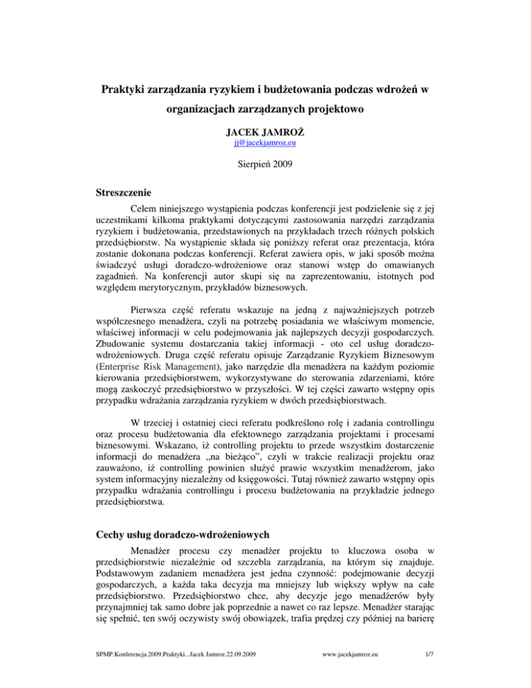 Praktyki zarządzania ryzykiem i budżetowania podczas wdrożeń w organizacjach zarządzanych projektowo JACEK JAMROŻ [email protected] Sierpień 2009 Streszczenie Celem niniejszego wystąpienia podczas konferencji jest podzielenie się z jej uczestnikami kilkoma praktykami dotyczącymi zastosowania narzędzi zarządzania ryzykiem i budżetowania, przedstawionych na przykładach trzech różnych polskich przedsiębiorstw. Na wystąpienie składa się poniższy referat oraz prezentacja, która zostanie dokonana podczas konferencji. Referat zawiera opis, w jaki sposób można świadczyć usługi doradczo-wdrożeniowe oraz stanowi wstęp do omawianych zagadnień. Na konferencji autor skupi się na zaprezentowaniu, istotnych pod względem merytorycznym, przykładów biznesowych. Pierwsza część referatu wskazuje na jedną z najważniejszych potrzeb współczesnego menadżera, czyli na potrzebę posiadania we właściwym momencie, właściwej informacji w celu podejmowania jak najlepszych decyzji gospodarczych. Zbudowanie systemu dostarczania takiej informacji - oto cel usług doradczowdrożeniowych. Druga część referatu opisuje Zarządzanie Ryzykiem Biznesowym (Enterprise Risk Management), jako narzędzie dla menadżera na każdym poziomie kierowania przedsiębiorstwem, wykorzystywane do sterowania zdarzeniami, które mogą zaskoczyć przedsiębiorstwo w przyszłości. W tej części zawarto wstępny opis przypadku wdrażania zarządzania ryzykiem w dwóch przedsiębiorstwach. W trzeciej i ostatniej cieci referatu podkreślono rolę i zadania controllingu oraz procesu budżetowania dla efektownego zarządzania projektami i procesami biznesowymi. Wskazano, iż controlling projektu to przede wszystkim dostarczenie informacji do menadżera „na bieżąco”, czyli w trakcie realizacji projektu oraz zauważono, iż controlling powinien służyć prawie wszystkim menadżerom, jako system informacyjny niezależny od księgowości. Tutaj również zawarto wstępny opis przypadku wdrażania controllingu i procesu budżetowania na przykładzie jednego przedsiębiorstwa. Cechy usług doradczo-wdrożeniowych Menadżer procesu czy menadżer projektu to kluczowa osoba w przedsiębiorstwie niezależnie od szczebla zarządzania, na którym się znajduje. Podstawowym zadaniem menadżera jest jedna czynność: podejmowanie decyzji gospodarczych, a każda taka decyzja ma mniejszy lub większy wpływ na całe przedsiębiorstwo. Przedsiębiorstwo chce, aby decyzje jego menadżerów były przynajmniej tak samo dobre jak poprzednie a nawet co raz lepsze. Menadżer starając się spełnić, ten swój oczywisty swój obowiązek, trafia prędzej czy później na barierę SPMP.Konferencja.2009.Praktyki...Jacek Jamroz.22.09.2009 www.jacekjamroz.eu 1/7 braku odpowiedniej informacji, która utrudnia mu podejmowanie decyzji. I właśnie to jest zadnie dla doradcy (konsultanta). Usługa doradczo-wdrożeniowa ma na celu spowodować trwałą zmianę w przedsiębiorstwie, polegającą na zbudowaniu systemu dostarczania właściwej informacji, właściwym menadżerom, we właściwym czasie. Informacja dostarczana menadżerowi może mieć wieloraki charakter: jako szeroki zbiór danych do analizy; jako zagregowane, najważniejsze lub najbardziej zmieniające się dane lub jako sugestie co do możliwych do podjęcia decyzji wraz z opisem ich konsekwencji. W zakresie zarządzania ryzykiem mogą to być najważniejsze lub najbardziej zmieniające się ryzyka (grupy ryzyk) oraz możliwe scenariusze reakcji na konkretne ryzyka. W obszarze budżetowania podstawową wymaganą informacją są stopnie wykorzystania budżetów i to nie tylko na poziomie kosztów stałych ale również w trudniejszym obszarze - kosztów zmiennych (np. projektów). Sugestie decyzji są również zalecane np. autor ostatnio wskazał swojemu klientowi: „Sugeruje się wstrzemięźliwość w zakresie inwestycji do czasu ….” Pierwszym niezbędnym krokiem dla nawiązania współpracy pomiędzy doradcą a przedsiębiorstwem (organizacją, klientem) jest wyznaczenie, po stronie przedsiębiorstwa, koordynatora (menadżera ryzyka, controllera itp.) - tj. osoby odpowiedzialnej za koordynację projektu zmian i proces funkcjonowania nowego systemu informacyjnego. Nie musi, choć może, być to osoba decyzyjna lub odpowiedzialna za powodzenie zmiany w przedsiębiorstwie. Ale niezbędne jest aby taka osoba pełniła funkcje stałego punktu dostępu dla doradcy do organizacji oraz stałego punktu informacyjnego wewnątrz przedsiębiorstwa. Przedsiębiorstwo przedstawia doradcy swoją potrzebę, opisując problem z własnej perspektywy. Doświadczony konsultant jednak wie, iż rzeczywista potrzeba jest dużo bardziej złożona. Często zlokalizowana gdzie indziej, a prawie zawsze na początku nie do końca widoczna. Definiowanie potrzeby klienta jest to wspólne działanie klienta i doradcy, które ma na celu sprecyzowanie zakresu potrzebnych zmian w organizacji klienta. Odbywa się to poprzez analizę dokumentacji, wywiady a przede wszystkim poprzez cykl warsztatów. Kolejny krok wdrożenia to wyznaczenie mierzalnego celu usługi. Cel taki należy opisać dwojako: jako stan docelowy po zmianie oraz jako harmonogram dojścia do stanu docelowego. W praktyce określa się ilość procesów i projektów biznesowych w przedsiębiorstwie objętych usługą doradczą. Można zaczynać „od dołu” albo „od góry”. „Od dołu” oznacza wybór jednego lub więcej projektów (lub procesów) biznesowych działalności operacyjnej lub pomocniczej i poprzez promocję sukcesu tu osiągniętego, rozprzestrzenienie systemu na całą organizację. Tak też to się odbyło na jednym z przykładów opisanych w dalszej części referatu. „Od góry” oznacza rozpoczęcie prac doradczych na poziomie zarządu. Tutaj przeważnie można wytypować modelowo cztery procesy biznesowe: finanse i administracja, działalność podstawowa, działalność pomocnicza oraz działa