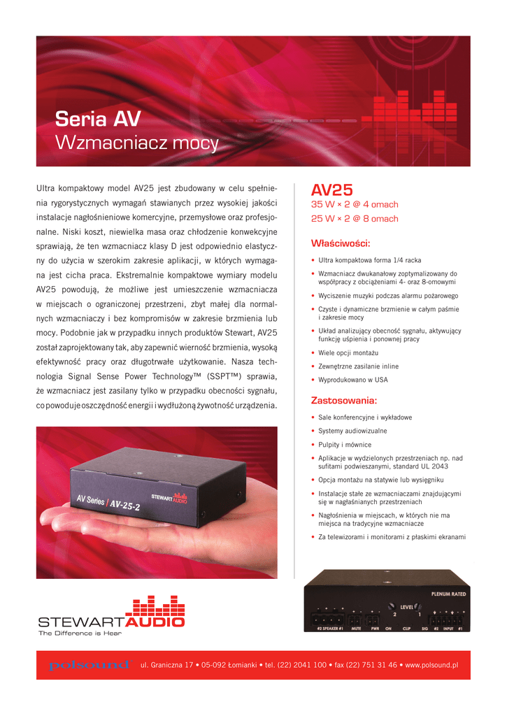 Seria AV Wzmacniacz mocy Ultra kompaktowy model AV25 jest zbudowany w celu spełnienia rygorystycznych wymagań stawianych przez wysokiej jakości instalacje nagłośnieniowe komercyjne, przemysłowe oraz profesjo- AV25 35 W × 2 @ 4 omach 25 W × 2 @ 8 omach nalne. Niski koszt, niewielka masa oraz chłodzenie konwekcyjne sprawiają, że ten wzmacniacz klasy D jest odpowiednio elastycz- Właściwości: ny do użycia w szerokim zakresie aplikacji, w których wymaga- • Ultra kompaktowa forma 1/4 racka na jest cicha praca. Ekstremalnie kompaktowe wymiary modelu • Wzmacniacz dwukanałowy zoptymalizowany do współpracy z obciążeniami 4- oraz 8-omowymi AV25 powodują, że możliwe jest umieszczenie wzmacniacza w miejscach o ograniczonej przestrzeni, zbyt małej dla normalnych wzmacniaczy i bez kompromisów w zakresie brzmienia lub mocy. Podobnie jak w przypadku innych produktów Stewart, AV25 został zaprojektowany tak, aby zapewnić wierność brzmienia, wysoką efektywność pracy oraz długotrwałe użytkowanie. Nasza technologia Signal Sense Power Technology™ (SSPT™) sprawia, że wzmacniacz jest zasilany tylko w przypadku obecności sygnału, co powoduje oszczędność energii i wydłużoną żywotność urządzenia. • Wyciszenie muzyki podczas alarmu pożarowego • Czyste i dynamiczne brzmienie w całym paśmie i zakresie mocy • Układ analizujący obecność sygnału, aktywujący funkcję uśpienia i ponownej pracy • Wiele opcji montażu • Zewnętrzne zasilanie inline • Wyprodukowano w USA Zastosowania: • Sale konferencyjne i wykładowe • Systemy audiowizualne • Pulpity i mównice • Aplikacje w wydzielonych przestrzeniach np. nad sufitami podwieszanymi, standard UL 2043 • Opcja montażu na statywie lub wysięgniku • Instalacje stałe ze wzmacniaczami znajdującymi się w nagłaśnianych przestrzeniach • Nagłośnienia w miejscach, w których nie ma miejsca na tradycyjne wzmacniacze • Za telewizorami i monitorami z płaskimi ekranami ul. Graniczna 17 • 05-092 Łomianki • tel. (22) 2041 100 • fax (22) 751 31 46 • www.polsound.pl AV25 Dane techniczne 35 W × 2 @ 4 omach 25 W × 2 @ 8 omach Moc @ 4 omach, stereo - - - - - - - - - - - - - - - - - - - - - - - - - 35 W Moc @ 8 omach, stereo - - - - - - - - - - - - - - - - - - - - - - - - - 25 W Charakterystyka częstotliwościowa (+0, -3 dB, 1 W) - - - - - - 30 Hz – 20 kHz Zakres częstotliwości pracy (+3, -3 dB)- - - - - - - - - - - - - - - 30 Hz – 30 kHz THD+N - - - - - - - - - - - - - - - - - - - - - - - - - - - - - - - - - - - - <0,1% przy pełnej mocy Stosunek sygnał/szum - - - - - - - - - - - - - - - - - - - - - - - - - - >100 dB Zewnętrzne wyciszenie- - - - - - - - - - - - - - - - - - - - - - - - - - 5-12 V DC Szybkość reakcji - - - - - - - - - - - - - - - - - - - - - - - - - - - - - - 30 V / mikrosekundę Czułość wejściowa- - - - - - - - - - - - - - - - - - - - - - - - - - - - - 0,5 V (-3 dBV) Standardowe wzmocnienie napięciowe - - - - - - - - - - - - - - - 28× (26,5 dB) Impedancja wejściowa (symetrycznie/niesymetrycznie)- - - - - 20 kOhm / 10 kOhm Uśpienie / bezczynność / 1/8 mocy (pobór prądu)- - - - - - - - 0,005 / 0,01 / 0,15 ampera Klasa wzmacniacza - - - - - - - - - - - - - - - - - - - - - - - - - - - - D Złącza wejściowe- - - - - - - - - - - - - - - - - - - - - - - - - - - - - - Euro Block Złącza wyjściowe- - - - - - - - - - - - - - - - - - - - - - - - - - - - - - Euro Block Zasilanie - - - - - - - - - - - - - - - - - - - - - - - - - - - - - - - - - - - Zewnętrzne typu in-line 48 VDC (w zestawie) Chłodzenie- - - - - - - - - - - - - - - - - - - - - - - - - - - - - - - - - - Konwekcyjne (bez wentylatorów) Kontrolery- - - - - - - - - - - - - - - - - - - - - - - - - - - - - - - - - - - Level – poziom wzmocnienia sygnału Wskaźniki LED - - - - - - - - - - - - - - - - - - - - - - - - - - - - - - - Power, Signal Present oraz Clip Konstrukcja obudowy- - - - - - - - - - - - - - - - - - - - - - - - - - - Aluminium Wymiary (wysokość, szerokość, głębokość)- - - - - - - - - - - - - 3,2 × 11,1 × 8,1 cm (1,25” × 4,35” × 3,2”) Masa- - - - - - - - - - - - - - - - - - - - - - - - - - - - - - - - - - - - - - 0,16 kg (<0,37 funta) Gwarancja - - - - - - - - - - - - - - - - - - - - - - - - - - - - - - - - - - 3 lata Wskaźniki dla zastosowań „Plenum”- - - - - - - - - - - - - - - - - Atest UL 2043 Specyfikacja dla architektów oraz inżynierów Wzmacniacz mocy powinien posiadać dwa kanały. Model AV25 powinien zapewniać moc przynajmniej 25 W przy 8 omach oraz 35 W przy 4 omach, przy pracy obydwu kanałów, z pasmem pracy 30 Hz – 30 kHz i zniekształceniami THD <0,1%. Wzmacniacz powinien być chłodzony powietrzem, bez wykorzystywania wentylatorów. Wzmacniacze wykorzystujące chłodzenie wentylatorami nie będą akceptowane. Wzmacniacz powinien posiadać technologię SSPT™, która zapewnia zasilanie urządzenia tylko po wykryciu sygnału audio. Wzmacniacz powinien posiadać układy zabezpieczające, chroniące go oraz głośniki przed zwarciami na wyjściu, prądem stałym na wyjściu oraz przegrzaniem. Wzmacniacz powinien mieć wzmocnienie napięciowe 28× (26,5 dB) oraz czułość wejściową 0,5 V dla mocy nominalnej przy 8 omach. Wzmacniacz powinien posiadać zewnętrzny zasilacz typu in-line. Wewnętrzny zasilacz nie jest dozwolony. Charakterystyka częstotliwościowa powinna być większa niż 30 Hz do 20 kHz, +0, -3 dB dla mocy nominalnej. Na ścianie tylnej powinny znajdować się wskaźniki LED Clip dla każdego kanału, obecności sygnału audio oraz zasilania. Na ścianie tylnej powinny być umieszczone złącza blokowe typu Phoenix zasilania, sygnału wejściowego, wyjściowego, funkcji wyciszenia/alarmu pożarowego, a także kontrolery poziomu wzmocnienia w specjalnych zagłębieniach obudowy. Wzmacniacz AV25 powinien ważyć 0,16 kg (0,37 funta) i powinien mieć wymiary 11,1 cm (4,35”) szerokość, 3,2 cm (1,25”) wysokość oraz