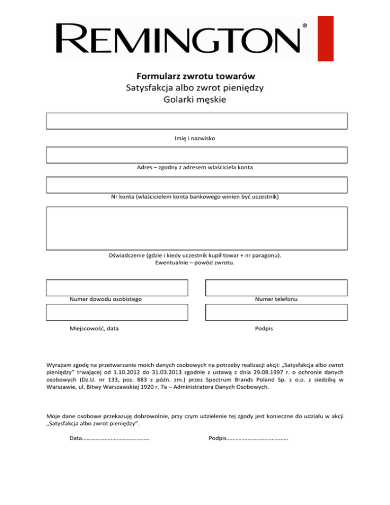 Formularz zwrotu towarów Satysfakcja albo zwrot pieniędzy Golarki męskie Imię i nazwisko Adres – zgodny z adresem właściciela konta Nr konta (właścicielem konta bankowego winien być uczestnik) Oświadczenie (gdzie i kiedy uczestnik kupił towar + nr paragonu). Ewentualnie – powód zwrotu. Numer dowodu osobistego Numer telefonu Miejscowość, data Podpis Wyrażam zgodę na przetwarzanie moich danych osobowych na potrzeby realizacji akcji: „Satysfakcja albo zwrot pieniędzy” trwającej od 1.10.2012 do 31.03.2013 zgodnie z ustawą z dnia 29.08.1997 r. o ochronie danych osobowych (Dz.U. nr 133, poz. 883 z późn. zm.) przez Spectrum Brands Poland Sp. z o.o. z siedzibą w Warszawie, ul. Bitwy Warszawskiej 1920 r. 7a – Administratora Danych Osobowych. Moje dane osobowe przekazuję dobrowolnie, przy czym udzielenie tej zgody jest konieczne do udziału w akcji „Satysfakcja albo zwrot pieniędzy”. Data……………………………………… Podpis…………………………………..