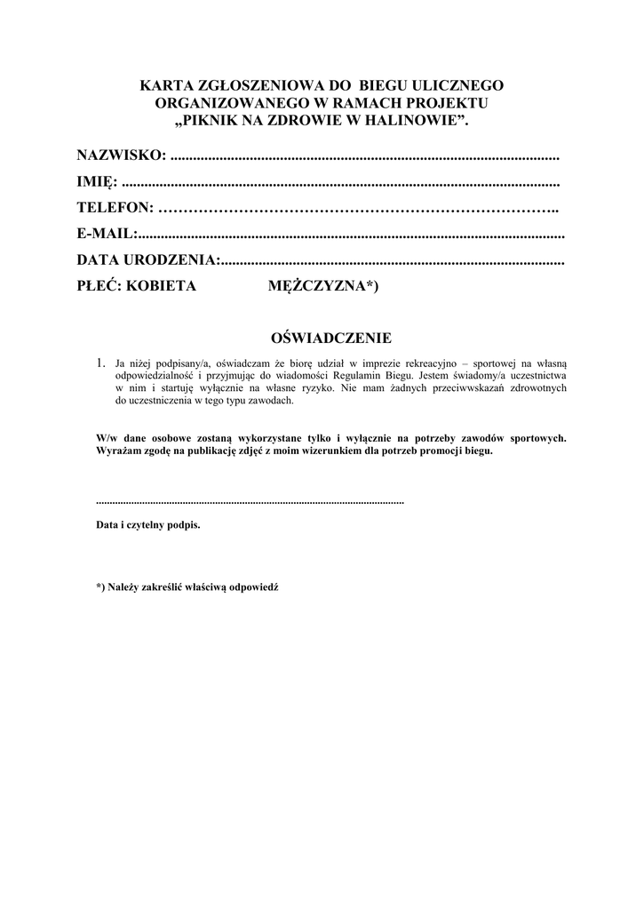 KARTA ZGŁOSZENIOWA DO BIEGU ULICZNEGO ORGANIZOWANEGO W RAMACH PROJEKTU „PIKNIK NA ZDROWIE W HALINOWIE”. NAZWISKO: ....................................................................................................... IMIĘ: .................................................................................................................... TELEFON: …………………………………………………………………….. E-MAIL:................................................................................................................. DATA URODZENIA:........................................................................................... PŁEĆ: KOBIETA MĘŻCZYZNA*) OŚWIADCZENIE 1. Ja niżej podpisany/a, oświadczam że biorę udział w imprezie rekreacyjno – sportowej na własną odpowiedzialność i przyjmując do wiadomości Regulamin Biegu. Jestem świadomy/a uczestnictwa w nim i startuję wyłącznie na własne ryzyko. Nie mam żadnych przeciwwskazań zdrowotnych do uczestniczenia w tego typu zawodach. W/w dane osobowe zostaną wykorzystane tylko i wyłącznie na potrzeby zawodów sportowych. Wyrażam zgodę na publikację zdjęć z moim wizerunkiem dla potrzeb promocji biegu. .................................................................................................................. Data i czytelny podpis. *) Należy zakreślić właściwą odpowiedź