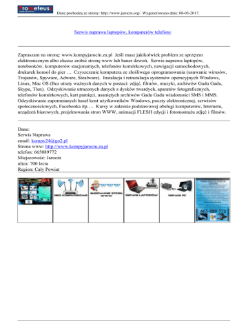 Dane pochodzą ze strony: http://www.jarocin.org/. Wygenerowano dnia: 08-03-2017. Serwis naprawa laptopów, komputerów telefony Zapraszam na stronę: www.kompyjarocin.za.pl Jeśli masz jakikolwiek problem ze sprzętem elektronicznym albo chcesz zrobić stronę www lub baner dzwoń. Serwis naprawa laptopów, notebooków, komputerów stacjonarnych, telefonów komórkowych, nawigacji samochodowych, drukarek konsol do gier … Czyszczenie komputera ze złośliwego oprogramowania (usuwanie wirusów, Trojanów, Spyware, Adware, Stealware). Instalacja i reinstalacja systemów operacyjnych Windows, Linux, Mac OS (Bez utraty ważnych danych w postaci: zdjęć, filmów, muzyki, archiwów Gadu Gadu, Skype, Tlen). Odzyskiwanie utraconych danych z dysków twardych, aparatów fotograficznych, telefonów komórkowych, kart pamięci, usuniętych archiwów Gadu Gadu wiadomości SMS i MMS. Odzyskiwanie zapomnianych haseł kont użytkowników Windows, poczty elektronicznej, serwisów społecznościowych, Facebooka itp…. Kursy w zakresie podstawowej obsługi komputerów, Internetu, urządzeń biurowych, projektowania stron WWW, animacji FLESH edycji i fotomontażu zdjęć i filmów. Dane: Serwis Naprawa email: [email protected] Strona www: http://www.kompyjarocin.za.pl telefon: 665089772 Miejscowość: Jarocin ulica: 700 lecia Region: Cały Powiat