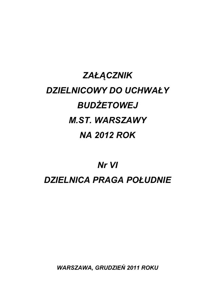 ZAŁĄCZNIK DZIELNICOWY DO UCHWAŁY BUDŻETOWEJ M.ST. WARSZAWY NA 2012 ROK Nr VI DZIELNICA PRAGA POŁUDNIE WARSZAWA, GRUDZIEŃ 2011 ROKU Budżet miasta stołecznego Warszawy na 2012 r. – PRAGA POŁUDNIE SPIS TREŚCI 1. WPROWADZENIE ........................................................................................................................................................... 5 2. ZAŁĄCZNIK DZIELNICOWY ......................................................................................................................................... 17 2.1. INFORMACJE OBOWIĄZKOWE...................................................................................................................... 19 A. ŚRODKI PRZEZNACZONE DO DYSPOZYCJI DZIELNICY NA REALIZACJĘ INWESTYCJI I ZADAŃ WŁASNYCH ......................................................................................................................................... 21 A.1. Dochody m. st. Warszawy wg źródeł.......................................................................................... 21 A.2. Dochody m. st. Warszawy wg działów klasyfikacji budżetowej ................................................... 22 B. PLAN WYDATKÓW .............................................................................................................................. 23 C. SPIS ZADAŃ INWESTYCYJNYCH ....................................................................................................... 39 D. PRZYCHODY I KOSZTY ZAKŁADU BUDŻETOWEGO – Ośrodek Sportu i Rekreacji .......................... 40 E. PLAN DOCHODÓW GROMADZONYCH NA WYDZIELONYCH RACHUNKACH JEDNOSTEK BUDŻETOWYCH PROWADZĄCYCH DZIAŁALNOŚĆ OKREŚLONĄ W USTAWIE O SYSTEMIE OŚWIATY I WYDATKÓW NIMI FINANSOWANYCH............................................................................. 41 E.1. Oświata i wychowanie................................................................................................................ 41 E.1.1. Szkoły podstawowe .................................................................................................... 42 E.1.2. Przedszkola ................................................................................................................ 43 E.1.3. Przedszkola specjalne ................................................................................................ 44 E.1.4. Gimnazja .................................................................................................................... 45 E.1.5. Zespoły obsługi ekonomiczno-administracyjnej szkół .................................................. 46 E.1.6. Licea ogólnokształcące ............................................................................................... 47 E.1.7. Szkoły zawodowe ....................................................................................................... 48 E.1.8. Centra kształcenia ustawicznego i praktycznego oraz ośrodki dokształcania zawodowego .............................................................................................................. 49 E.2. Edukacyjna opieka wychowawcza ............................................................................................. 50 E.2.1. Poradnie psychologiczno-pedagogiczne, w tym poradnie specjalistyczne ................... 51 E.2.2. Placówki wychowania pozaszkolnego ......................................................................... 52 2.2. INFORMACJE UZUPEŁNIAJĄCE .................................................................................................................... 53 2.2.1. Plan wydatków na zadania z zakresu administracji rządowej i innych zadań zleconych ustawami ...... 55 2.2.2. Wydatki na projekty realizowane ze środków pochodzących z Unii Europejskiej i środków pochodzących z innych źródeł zagranicznych – wyciąg dla dzielnicy .................................................. 57 3. 4. TABLICE ZBIORCZE..................................................................................................................................................... 59 3.1. WYDATKI W UKŁADZIE ZADAŃ ..................................................................................................................... 61 3.2. WYDATKI BIEŻĄCE W UKŁADZIE ZADAŃ ..................................................................................................... 63 3.3. WYDATKI INWESTYCYJNE W UKŁADZIE ZADAŃ......................................................................................... 67 OBJAŚNIENIA W UKŁADZIE ZADAŃ........................................................................................................................... 69 4.1. DOCHODY MIASTA STOŁECZNEGO WARSZAWY ....................................................................................... 71 4.2. CHARAKTERYSTYKA WYDATKÓW BIEŻĄCYCH W UKŁADZIE ZADAŃ....................................................... 79 4.2.1. Transport i komunikacja...................................................................................................................... 79 4.2.2. Ład przestrzenny i gospodarka nieruchomościami.............................................................................. 80 4.2.3. Gospodarka komunalna i ochrona środowiska.................................................................................... 84 4.2.4 Edukacja ............................................................................................................................................ 87 4.2.5. Ochrona zdrowia i pomoc społeczna .................................................................................................. 97 4.2.6. Kultura i ochrona dziedzictwa kulturowego ........................................................................................103 4.2.7. Rekreacja, sport i turystyka................................................................................................................105 4.