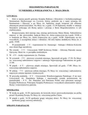 OGŁOSZENIA PARAFIALNE VI NIEDZIELA WIELKANOCNA 1 MAJA 2016 R. LITURGIA 1. Dziś w naszej parafii gościmy Księdza Rektora i Kleryków z Archidiecezjalnego Seminarium Duchownego we Lwowie, którzy podziela się z nami sytuacją ich Seminarium i Diecezji, a po Mszy św. będziemy mogli wesprzeć ich ofiarami zbieranymi przed kościołem. Na Mszy św. o godz. 12:30 będziemy modlić w intencji Strażaków polecając ich Bożej opiece i prosząc o Boże błogosławieństwo w ich ciężkiej pracy. 2. Rozpoczynamy dziś miesiąc maj, miesiąc poświecony Matce Bożej. Nabożeństwa majowe w dni powszednie będą po Mszy św., która rozpoczyna się o godz. 18:00, a w niedziele po Mszy św., która rozpoczyna się o godz. 16:00. Zapraszamy na nie wszystkich, a szczególnie dzieci i młodzież. Od dziś będzie dodatkowa Msza św. o godz. 19:00. 3. W poniedziałek – 1 V – wspomnienie św. Atanazego – biskupa i Doktora Kościoła oraz dzień flagi narodowej. 4. We wtorek – 3 V – Uroczystość NMP Królowej Polski – Głównej Patronki naszej Ojczyzny. Msze św. w porządku niedzielnym. 5. W – 4 V – środę wspomnienie św. Floriana. 6. W czwartek – 5 V – pierwszy czwartek miesiąca. Spowiedź od godz. 17:30. Po Mszy św. wieczornej nabożeństwo majowe i adoracja Najświętszego Sakramentu do godz. 21:00. 7. W piątek – 6 V – pierwszy piątek miesiąca. Spowiedź od godz. 17:00. Mszy św. wieczornej nabożeństwo majowe. 8. W sobotę – 7 V – pierwsza sobota miesiąca. Po Mszy św. wieczornej i nabożeństwie majowym zmiana tajemnic różańcowych 9. W przyszłą niedzielę – 8 V – Uroczystość Wniebowstąpienia Pańskiego. Z tej racji Uroczystość św. Stanisława biskupa i męczennika została przeniesiona na poniedziałek – 9 V. Św. Stanisław jest Patronem Polski oraz patronem naszego Księdza Proboszcza. Polecajmy Księdza Proboszcza i wszystkich solenizantów opiece Bożej i wstawiennictwu patrona. SPOTKANIA 1. W środę na godz. 16:30 zapraszamy do kościoła dzieci pierwszokomunijne na próbę przed I Komunią Świętą. Po Mszy św. wieczornej próba Chóru. 2. W piątek o godz. 16:30 spotkanie grupy misyjnej dzieci. Po Mszy św. wieczornej spotkanie grupy oazowej młodzieży. SPRAWY PARAFIALNE 1. W tym tygodniu ofiary na sprzątanie i wystrój kościoła skład grupa Pani Zofii Cieszyńskiej. 2. W przyszłą niedzielę – 14 II – w domu parafialnym przyjmowane będą wpłaty na Stowarzyszenie Przyjaciół Seminarium, Przyjaciół KULu i Radia „Via”. Zapowiedzi przedślubne 1. Dominik Józef Bojda s. Józefa i Haliny Sierżęga ur. 1986 r. Rzeszów, par. św. Rocha i Monika Małgorzata Molisak c. +Adama i Jolanty Rogińskiej ur. 1985 r. par. Chrystusa Króla w Łańcucie. 2. Marcin Piotr Kostka s. Stanisława i Haliny Ciryt ur. 1992 r. Leżajsk, par. św. Rocha i Edyta Natalia Duda c. Jacka i Marii Kołodziej ur. 1987 r. Leżajsk, par. św. Rocha 3. Michał Krzysztof Kuśnierz s. Tadeusza i Ewy ur. 1992 r. Rzeszów, par. św. Rocha i Magdalena Anna Walaszek c. Artura i Hanny ur. 1993 r. Puławy, par. Ryki