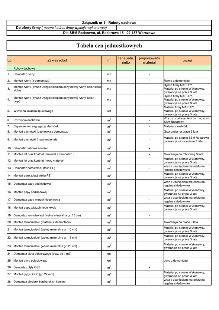 Załącznik nr 1 - Roboty dachowe Do oferty firmy ( nazwa i adres firmy-wpisuje wykonawca) Dla SBM Radarowa, ul. Radarowa 15 , 02-137 Warszawa Tabela cen jednostkowych Lp. Zakres robót jm. cena jedn. netto proponowany materiał uwagi I Roboty dachowe 1. Demontaż rynny mb - 2. Montaż rynny (z demontażu) mb - 3. Montaż rynny (wraz z uwzglednieniem ceny nowej rynny, kolor stare złoto) mb 4. Montaż rynny (wraz z uwzglednieniem ceny nowej rynny, kolor brąz) mb 5. Wymiana kolanka spustowego szt 6. Rozbiórka dachówki m2 - m 2 - Materiał z rozbiórki 2 - Gwarancja na prace 3 lata Materiał po stronie SBM Radarowa gwarancja na robociznę 3 lata 7. Czyszczenie i segregacja dachówki Rynna z demontażu Rynna firmy MARLEY, Materiał po stronie Wykonawcy, gwarancja na prace 3 lata Rynna firmy MARLEY, Materiał po stronie Wykonawcy, gwarancja na prace 3 lata Materiał firmy MARLEY, Materiał po stronie Wykonawcy, gwarancja na prace 3 lata Wraz z przekazaniem do magazynu SBM Radarowa 8. Montaż dachówki (dachówka z demontażu) m 9. Montaż dachówki (nowy materiał) m2 - m2 - m 2 - Gwarancja na robociznę 3 lata 12. Montaż łat oraz kontrłat (nowy materiał) m 2 13. Demontaż paroizolacji (folia PE) m2 - 14. Montaż paroizolacji (folia PE) m2 Materiał po stronie Wykonawcy, gwarancja na prace 3 lata wraz z usunięciem materiału na legalne składowisko Materiał po stronie Wykonawcy, gwarancja na prace 3 lata 15. Demontaż papy podkładowej m - wraz z usunięciem materiału na legalne składowisko 16. Montaż papy podkładowej m2 17. Demontaż papy wierzchniego krycia m2 18. Montaż papy wierzchniego krycia m2 19. Demontaż termoizolacji (wełna mineralna gr. 15 cm) m2 20. Montaż termoizolacji (materiał z demontażu) m2 Gwarancja na prace 3 lata 21. Montaż termoizolacji (wełna mineralna gr. 10 cm) m2 Materiał po stronie Wykonawcy, gwarancja na prace 3 lata 22. Montaż termoizolacji (wełna mineralna gr. 15 cm) m2 Materiał po stronie Wykonawcy, gwarancja na prace 3 lata 23. Montaż termoizolacji (wełna mineralna gr. 20 cm) m 2 Materiał po stronie Wykonawcy, gwarancja na prace 3 lata 24. Demontaż okna połaciowego (pow. do 1 m2) kpl. - 25. Montaż okna połaciowego kpl. - 26. Demontaż płyty OSB m2 - 27. Montaż płyty OSB3 (gr. 22 mm) m2 28. Demontaż obróbek blacharskich komina m2 10. Demontaż łat oraz kontrłat 11. Montaż łat oraz kontrłat (materiał z demontażu) 2 - Materiał po stronie Wykonawcy, gwarancja na prace 3 lata wraz z usunięciem materiału na legalne składowisko Materiał po stronie Wykonawcy, gwarancja na prace 3 lata - - okno z demontażu Materiał po stronie Wykonawcy, gwarancja na prace 3 lata wraz z usunięciem materiału na legalne składowisko 29. Montaż obróbek blacharskich komina m2 30. Demontaż obróbek (blacha miedziana gr. 0,57 mm) m 2 31. Montaż obróbek (blacha miedziana gr. 0,57 mm) m 2 32. Uszczelnienie koszy konstrukcji dachowej taśmą (np. Soudal Soudaband) mb 34. Montaż gąsiora mb Kompleksowa naprawa konstrukcji dachowej: - demontaż dachówki - demontaż łat oraz kontrłat - demontaż paroizolacji (folia PE) - demontaż wełny mineralnej 35. - montaż wełny mineralnej gr. 15 cm - montaż paroizolacji (folia PE) - montaż łat oraz kontrłat - montaż dachówki (materiał po stronie SBM Radarowa) - koszt niezbędnych uszczelek, obróbek - koszt niebędnych rusztowań m Koszt niezbędnych rusztowań, zabezpieczeń w celu wykonania niezbędnych robót Materiał po stronie Wykonawcy, gwarancja na prace 3 lata Materiał po stronie Wykonawcy, gwarancja na prace 3 lata mb 33. Demontaż gąsiora 36. Materiał po stronie Wykonawcy, gwarancja na prace 3 lata 2 m2 Materiał po stronie Wykonawcy, gwarancja na prace 3 lata Materiał po stronie Wykonawcy, gwarancja na prace 3 lata Usunięcie materiału z demontażu na legalne składowisko Montaż, postojowe rusztowań, demontaż rusztowań