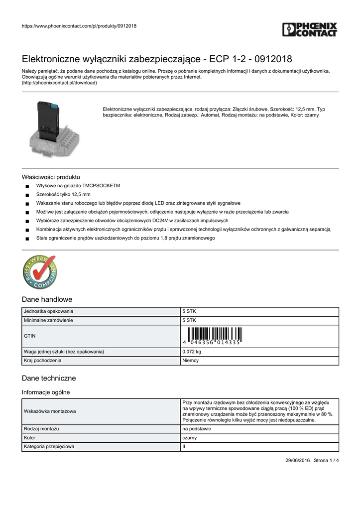 https://www.phoenixcontact.com/pl/produkty/0912018 Elektroniczne wyłączniki zabezpieczające - ECP 1-2 - 0912018 Należy pamiętać, że podane dane pochodzą z katalogu online. Proszę o pobranie kompletnych informacji i danych z dokumentacji użytkownika. Obowiązują ogólne warunki użytkowania dla materiałów pobieranych przez Internet. (http://phoenixcontact.pl/download) Elektroniczne wyłączniki zabezpieczające, rodzaj przyłącza: Złączki śrubowe, Szerokość: 12,5 mm, Typ bezpiecznika: elektroniczne, Rodzaj zabezp.: Automat, Rodzaj montażu: na podstawie, Kolor: czarny Właściwości produktu ■ ■ ■ ■ ■ ■ ■ Wtykowe na gniazdo TMCPSOCKETM Szerokość tylko 12,5 mm Wskazanie stanu roboczego lub błędów poprzez diodę LED oraz zintegrowane styki sygnałowe Możliwe jest załączanie obciążeń pojemnościowych, odłączenie następuje wyłącznie w razie przeciążenia lub zwarcia Wybiórcze zabezpieczenie obwodów obciążeniowych DC24V w zasilaczach impulsowych Kombinacja aktywnych elektronicznych ograniczników prądu i sprawdzonej technologii wyłączników ochronnych z galwaniczną separacją Stałe ograniczenie prądów uszkodzeniowych do poziomu 1,8 prądu znamionowego Dane handlowe Jednostka opakowania 5 STK Minimalne zamówienie 5 STK GTIN Waga jednej sztuki (bez opakowania) 0.072 kg Kraj pochodzenia Niemcy Dane techniczne Informacje ogólne Wskazówka montażowa Przy montażu rzędowym bez chłodzenia konwekcyjnego ze względu na wpływy termiczne spowodowane ciągłą pracą (100 % ED) prąd znamionowy urządzenia może być przenoszony maksymalnie w 80 %. Połączenie równoległe kilku wyjść mocy jest niedopuszczalne. Rodzaj montażu na podstawie Kolor czarny Kategoria przepięciowa II 29/06/2016 Strona 1 / 4 https://www.phoenixcontact.com/pl/produkty/0912018 Elektroniczne wyłączniki zabezpieczające - ECP 1-2 - 0912018 Dane techniczne Informacje ogólne Materiał izolacyjny PPS Klasa palności wg UL 94 V0 Dane elektryczne Bezpiecznik elektroniczne Rodzaj zabezp. Automat Znamionowe napięcie udarowe 0,5 kV Napięcie robocze 24 V DC 18 V DC ... 32 V DC Prąd znamionowy IN 1 A (nastawny) 2 A (nastawny) Wymagany bezpiecznik poprzedzający Nie jest wymagane, zintegrowany element Fail-Safe Wytrzymałość napięciowa 1000 V AC (Obszar uruchamiania) 500 V AC (Zakres montażu) 500 V AC (Styk sygnalizacyjny obwodu obciążającego) Stopień zabrudzenia 2 Kategoria przepięciowa II Grupa materiału izolacyjnego IIIa Zdolność łączeniowa ICN aktywne ograniczenie prądu Prąd spoczynkowy I0 typ. 13 mA Wymiary Wysokość 60 mm Szerokość 12,5 mm Głębokość 70 mm wysokość NS 35/7,5 144 mm wysokość NS 35/15 151,5 mm Wysokość modułu kompletnego 115 mm Szerokość modułu kompletnego 38 mm Głębokość modułu kompletnego 147,5 mm Warunki środowiskowe Stopień ochrony IP30 (Obszar uruchamiania) Temperatura otoczenia (praca) 0 °C ... 50 °C (bez kondensacji) Dane przyłączeniowe Rodzaj przyłącza Złączki śrubowe Rysunki 29/06/2016 Strona 2 / 4 https://www.phoenixcontact.com/pl/produkty/0912018 Elektroniczne wyłączniki zabezpieczające - ECP 1-2 - 0912018 Schemat blokowy punkt wyłączenia typ. 1,1 x l N LINE (+) SC On/Off 14 12 2 LOAD czas załączenia w sekundach GND (-) Control Unit 1 11 13 LINE Wykres SO SI LOAD (L+) 10 10 1,8 x l N 4 3 10 2 10 5 1 0,1 0,01 0 1 2 IK 3 wielokrotność w IN rysunek funkcyjny Wej./Wyj. Stan rob. GN/OG Rodczyt 3A 6A Prąd znam. IN SO SI SC Wyjście sygnału Pomiar prądu WysteroZwarc./ Przeciążenie wanie LINE (+) DC 24 V Elektronika sterująca Schemat LOAD (+) GND (-) Wyjście obciążenia 1 = Selektywn wyłącznik ochronny 2 = Element końcowy złącza podstaw 3 = Podstawa modułowa 4 = Element końcowy złącza podstaw Klasyfikacje eCl@ss eCl@ss 4.0 27141116 eCl@ss 4.1 27141116 eCl@ss 5.0 27141116 eCl@ss 5.1 27141116 eCl@ss 6.0 27141116 eCl@ss 7.0 27141116 eCl@ss 8.0 27141116 eCl@ss 9.0 27141116 ETIM ETIM 2.0 EC000899 29/06/2016 Strona 3 / 4 https://www.phoenixcontact.com/pl/produkty/0912018 Elektroniczne wyłączniki zabezpieczające - ECP 1-2 - 0912018 Klasyfikacje ETIM ETIM 3.0 EC000899 ETIM 4.0 EC000899 ETIM 5.0 EC000899 UNSPSC UNSPSC 6.01 30211812 UNSPSC 7.0901 39121411 UNSPSC 11 39121411 UNSPSC 12.01 39121411 UNSPSC 13.2 39121411 Phoenix Contact 2016 © - all rights reserved http://www.phoenixcontact.com 29/06/2016 Strona 4 / 4