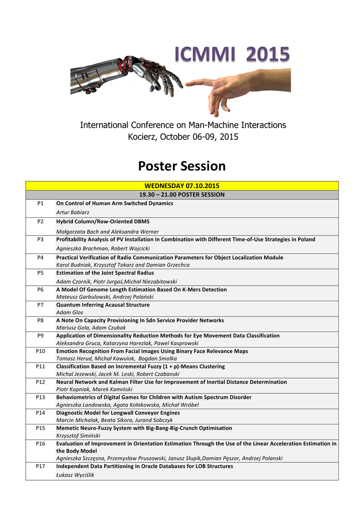 ICMMI 2015 International Conference on Man-Machine Interactions Kocierz, October 06-09, 2015 Poster Session WEDNESDAY 07.10.2015 19.30 – 21.00 POSTER SESSION P1 On Control of Human Arm Switched Dynamics Artur Babiarz P2 Hybrid Column/Row-‐Oriented DBMS Małgorzata Bach and Aleksandra Werner P3 Profitability Analysis of PV Installation in Combination with Different Time-‐of-‐Use Strategies in Poland Agnieszka Brachman, Robert Wojcicki P4 Practical Verification of Radio Communication Parameters for Object Localization Module Karol Budniak, Krzysztof Tokarz and Damian Grzechca Estimation of the Joint Spectral Radius Adam Czornik, Piotr Jurgaś,Michał Niezabitowski A Model Of Genome Length Estimation Based On K-‐Mers Detection Mateusz Garbulowski, Andrzej Polański Quantum Inferring Acausal Structure Adam Glos A Note On Capacity Provisioning In Sdn Service Provider Networks Mariusz Gola, Adam Czubak Application of Dimensionality Reduction Methods for Eye Movement Data Classification Aleksandra Gruca, Katarzyna Harezlak, Pawel Kasprowski Emotion Recognition From Facial Images Using Binary Face Relevance Maps Tomasz Herud, Michał Kawulok, Bogdan Smolka Classification Based on Incremental Fuzzy (1 + p)-‐Means Clustering Michal Jezewski, Jacek M. Leski, Robert Czabanski Neural Network and Kalman Filter Use for Improvement of Inertial Distance Determination Piotr Kopniak, Marek Kamiński Behaviometrics of Digital Games for Children with Autism Spectrum Disorder Agnieszka Landowska, Agata Kołakowska, Michał Wróbel Diagnostic Model for Longwall Conveyor Engines Marcin Michalak, Beata Sikora, Jurand Sobczyk Memetic Neuro-‐Fuzzy System with Big-‐Bang-‐Big-‐Crunch Optimisation Krzysztof Simiński Evaluation of Improvement in Orientation Estimation Through the Use of the Linear Acceleration Estimation in the Body Model Agnieszka Szczęsna, Przemysław Pruszowski, Janusz Słupik,Damian Pęszor, Andrzej Polanski Independent Data Partitioning in Oracle Databases for LOB Structures Łukasz Wyciślik P5 P6 P7 P8 P9 P10 P11 P12 P13 P14 P15 P16 P17