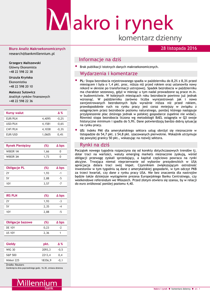 28 listopada 2016 Biuro Analiz Makroekonomicznych [email protected] Informacje na dziś Grzegorz Maliszewski Główny Ekonomista +48 22 598 22 38 Brak publikacji istotnych danych makroekonomicznych. Wydarzenia i komentarze Urszula Kryńska Ekonomistka +48 22 598 20 10 PL: Stopa bezrobocia rejestrowanego spadła w październiku do 8,2% z 8,3% przed miesiącem i była o 1,4 pkt. proc. niższa niż przed rokiem oraz ustanowiła nowy rekord w okresie po transformacji ustrojowej. Spadek bezrobocia w październiku ma charakter sezonowy, gdyż w miesiąc u tym nadal prowadzone są prace m.in. w budownictwie. W kolejnych miesiącach roku bezrobocie powinno już jednak wzrosnąć. W październiku zarówno liczba wyrejestrowań jak i nowo zarejestrowanych bezrobotnych była wyraźnie niższa niż przed rokiem, prawdopodobnie ruch na rynku pracy jest coraz mniejszy w związku z osiągnięciem przez bezrobocie poziomu naturalnego, poniżej którego następuje przyśpieszenie płac (którego jednak w polskiej gospodarce zupełnie nie widać). Również stopa bezrobocia liczona wg metodologii BAEL osiągnęła w Q3 swoje historyczne minimum i spadła do 5,9%. Dane potwierdzają bardzo dobrą sytuację na rynku pracy. US: Indeks PMI dla amerykańskiego sektora usług obniżył się nieznacznie w listopadzie do 54,7 pkt. z 54,8 pkt. szacowanych pierwotnie. Wskaźnik utrzymuje się powyżej granicy 50 pkt., wskazując na rozwój sektora. Mateusz Sutowicz Analityk rynków finansowych +48 22 598 22 36 Kursy walut Δ% EUR/PLN 4,4095 -0,2% USD/PLN 4,1581 -0,6% CHF/PLN 4,1038 -0,3% EUR/USD 1,0605 0,4% Rynek Pieniężny (%) Δ bps WIBOR 1M 1,66 0 WIBOR 3M 1,73 0 Obligacje PL (%) Δ bps 2Y 1,93 -1 5Y 2,88 -5 10Y 3,57 -7 IRS PLN (%) Δ bps 2Y 1,93 -3 5Y 2,35 -4 10Y 2,88 -5 Obligacje bazowe (%) Δ bps DE 10Y 0,23 -2 US 10Y 2,36 1 Giełdy pkt. Δ% WIG 30 2093,3 -0,5 S&P 500 2213,4 0,4 Nikkei 225 18356,9 -0,1 Rynki na dziś Początek nowego tygodnia rozpoczyna się od korekty dotychczasowych trendów tj. dolar traci na wartości, waluty emerging markets nieznacznie zyskują, wśród obligacji przewagę zyskali sprzedający, a kapitał częściowo powraca na rynki akcyjne. Trwająca niemal nieprzerwanie od wyborów prezydenckich w USA aprecjacja dolara traci swój impet. Czynnikiem zwiększającym ostrożność inwestorów w tym tygodniu są dane z amerykańskiej gospodarki, w tym odczyt PKB za trzeci kwartał, czy dane z rynku pracy USA. Nie bez znaczenia dla nastrojów będzie także dzisiejsze wystąpienie prezesa Europejskiego Banku Centralnego, czy weekendowe referendum we Włoszech. Przed złotym otwiera się szansa, by w relacji do euro zniżkować poniżej poziomu 4,40. Źródło: Reuters Zamknięcia dnia poprzedniego godz. 16.30, zmiana dzienna `Makro i rynek komentarz dzienny str. 1 Rynek krajowy Kursy walutowe EUR/PLN i EUR/USD 4,50 1,14 4,45 1,12 4,40 1,10 4,35 1,08 4,30 1,06 4,25 1,04 EURPLN EURUSD /prawa skala/ Źródło: Reuters Końcówka minionego tygodnia przyniosła nieznaczne umocnienie złotego. Zmienność na rynku była niewielka, choć w ciągu dnia kurs EUR/PLN zmierzał stopniowo w kierunku 4,40 i na zamknięciu notowany był na poziomie 4,4070, tj. blisko 1 grosz niżej w stosunku do czwartkowego zamknięcia. Nieco więcej złoty zyskał także względem dolara i franka szwajcarskiego. Podobnie jak w dniach poprzednich złoty pozostawał pod dominującym wpływem czynników globalnych i w piątek wsparciem dla złotego była zwyżka eurodolara na rynkach bazowych. Poprawa nastrojów zauważalna była także na rynku papierów skarbowych. Polskie obligacje zyskiwały na wartości, co przy stabilnych notowaniach na bazowych rynkach długu doprowadziło do zawężenia speadów pomiędzy papierami Polski, a obligacjami Niemiec i USA. Najwięcej na wartości zyskała 10-latka, której rentowność obniżyła się o 7 bps do 3,57%. W tym samym czasie dochodowość 5-latki spadła o 5 bps do 2,88%. Względnie stabilne były natomiast notowania 2-latek, czemu sprzyjało mocne przekonanie rynku co do stabilizacji stóp procentowych w perspektywie najbliższych kwartałów. Rynki zagraniczne Rentowności polskich obligacji [%] Piątek zakończył się próbą odreagowania spadkowego trendu w notowaniach eurodolara, a kurs EUR/USD zawrócił nieznacznie z okolic najniższego od piętnastu lat poziomu tj.1,0515. Zmienność notowań była zbliżona do centa i nie odbiegała znacząco w stosunku do wahań obserwowanych w poprzednich dniach. Odwrót od dolara widoczny był także w notowaniach pozostałych, głównych par walutowych, w tym USD/JPY, czy GBP/USD. Spokojny przebieg miały piątkowe notowania obligacji na bazowych rynkach długu. Dochodowość niemieckiego długu zmalała o 2 bps do 0,23%, a amerykańska 10-latka wzrosła w dochodowości o 1 bps do 2,36%. 3,8 3,4 3,0 2,6 2,2 1,8 1,4 Spread PL 10Y vs. DE 10Y 2Y 5Y 10Y Źródło: Reuters Rentowności obligacji USA i Niemiec [%] 2,50 2,00 1,50 1,00 0,50 0,00 -0,50 10Y DE 10Y US Źródło: Reuters Ceny surowców [USD] 1350 55 1300 50 1250 45 1200 1150 40 Złoto /lewa skala/ Ropa naftowa Brent Źródło: Reuters `Makro i rynek komentarz dzienny str. 2 Kalendarium Data Godz. Wskaźnik/Wydarzenie Kraj Okres Poprzednie dane Konsensus (prognoza Millenium) Aktualne dane 11/18 08:00 Inflacja PPI r/r Niemcy Październik -1.4% -0.4% -0.9% 11/18 10:00 Saldo rachunku bieżącego SA EU Wrzesień 29.7b 25.3b 11/18 14:00 Płace r/r Polska Październik 3.9% 3.6% 4.2% 11/18 14:00 Zatrudnienie r/r Polska Październik 3.2% 3.1% 3.1% 11/21 14:00 Produkcja sprzedana przemysłu r/r Polska Październik 3.2% -1.3% 1.0% (1.1%) 11/21 14:00 Inflacja PPI r/r Polska Październik 0.2% 0.6% 0.4% (0.3%) 11/21 14:00 Sprzedaż detaliczna r/r Polska Październik 4.8% 3.7% 4.2% (5.2%) 11/22 16:00 Sprzedaż domów na rynku wtórnym USA Październik 5.49m 5.60m 5.43m 11/23 09:30 Wstępny PMI w przemyśle Niemcy Listopad 55.0 54.4 54.9 11/23 09:30 Wstępny PMI w usługach Niemcy Li