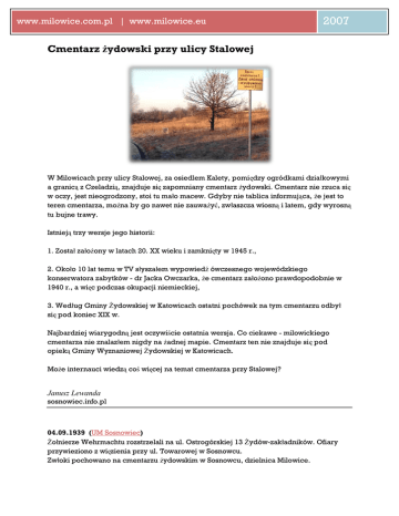 www.milowice.com.pl | www.milowice.eu 2007 Cmentarz żydowski przy ulicy Stalowej W Milowicach przy ulicy Stalowej, za osiedlem Kalety, pomiędzy ogródkami działkowymi a granicą z Czeladzią, znajduje się zapomniany cmentarz żydowski. Cmentarz nie rzuca się w oczy, jest nieogrodzony, stoi tu mało macew. Gdyby nie tablica informująca, że jest to teren cmentarza, można by go nawet nie zauważyć, zwłaszcza wiosną i latem, gdy wyrosną tu bujne trawy. Istnieją trzy wersje jego historii: 1. Został założony w latach 20. XX wieku i zamknięty w 1945 r., 2. Około 10 lat temu w TV słyszałem wypowiedź ówczesnego wojewódzkiego konserwatora zabytków - dr Jacka Owczarka, że cmentarz założono prawdopodobnie w 1940 r., a więc podczas okupacji niemieckiej, 3. Według Gminy Żydowskiej w Katowicach ostatni pochówek na tym cmentarzu odbył się pod koniec XIX w. Najbardziej wiarygodną jest oczywiście ostatnia wersja. Co ciekawe - milowickiego cmentarza nie znalazłem nigdy na żadnej mapie. Cmentarz ten nie znajduje się pod opieką Gminy Wyznaniowej Żydowskiej w Katowicach. Może internauci wiedzą coś więcej na temat cmentarza przy Stalowej? Janusz Lewanda sosnowiec.info.pl 04.09.1939 (UM Sosnowiec) Żołnierze Wehrmachtu rozstrzelali na ul. Ostrogórskiej 13 Żydów-zakładników. Ofiary przywieziono z więzienia przy ul. Towarowej w Sosnowcu. Zwłoki pochowano na cmentarzu żydowskim w Sosnowcu, dzielnica Milowice. www.milowice.com.pl | www.milowice.eu 2007 www.milowice.com.pl | www.milowice.eu Zdjęcia: Janusz Lewanda sosnowiec.info.pl Mapka 2007 www.milowice.com.pl | www.milowice.eu 2007 www.milowice.com.pl | www.milowice.eu 2007