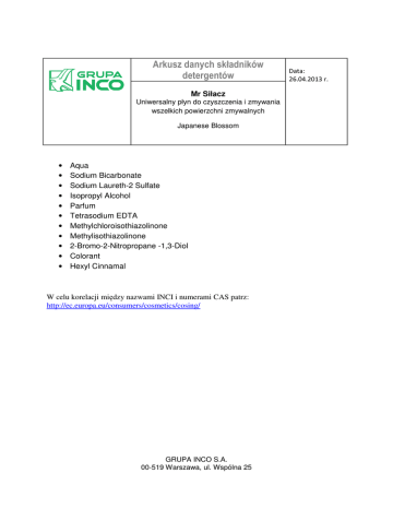 Arkusz danych składników detergentów Mr Siłacz Uniwersalny płyn do czyszczenia i zmywania wszelkich powierzchni zmywalnych Japanese Blossom • • • • • • • • • • • Aqua Sodium Bicarbonate Sodium Laureth-2 Sulfate Isopropyl Alcohol Parfum Tetrasodium EDTA Methylchloroisothiazolinone Methylisothiazolinone 2-Bromo-2-Nitropropane -1,3-Diol Colorant Hexyl Cinnamal W celu korelacji między nazwami INCI i numerami CAS patrz: http://ec.europa.eu/consumers/cosmetics/cosing/ GRUPA INCO S.A. 00-519 Warszawa, ul. Wspólna 25 Data: 26.04.2013 r.
