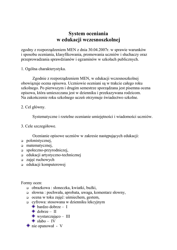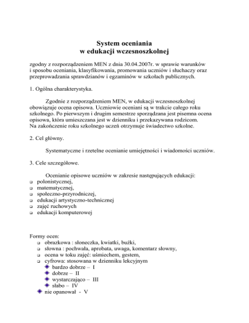 System oceniania w edukacji wczesnoszkolnej zgodny z rozporządzeniem MEN z dnia 30.04.2007r. w sprawie warunków i sposobu oceniania, klasyfikowania, promowania uczniów i słuchaczy oraz przeprowadzania sprawdzianów i egzaminów w szkołach publicznych. 1. Ogólna charakterystyka. Zgodnie z rozporządzeniem MEN, w edukacji wczesnoszkolnej obowiązuje ocena opisowa. Uczniowie oceniani są w trakcie całego roku szkolnego. Po pierwszym i drugim semestrze sporządzana jest pisemna ocena opisowa, która umieszczana jest w dzienniku i przekazywana rodzicom. Na zakończenie roku szkolnego uczeń otrzymuje świadectwo szkolne. 2. Cel główny. Systematyczne i rzetelne ocenianie umiejętności i wiadomości uczniów. 3. Cele szczegółowe. Ocenianie opisowe uczniów w zakresie następujących edukacji: polonistycznej, matematycznej, społeczno-przyrodniczej, edukacji artystyczno-technicznej zajęċ ruchowych edukacji komputerowej Formy ocen: obrazkowa : słoneczka, kwiatki, buźki, słowna : pochwała, aprobata, uwaga, komentarz słowny, ocena w toku zajęć: uśmiechem, gestem, cyfrowa: stosowana w dzienniku lekcyjnym bardzo dobrze – I dobrze – II wystarczająco – III słabo – IV nie opanował - V Zasady oceniania postępów edukacyjnych w klasach I – III 1. Nauczyciele klas I-III mają obowiązek sporządzania opisowej śródrocznej i rocznej oceny klasyfikacyjnej z zajęć edukacyjnych. Realizując program zintegrowanej edukacji wczesnoszkolnej wykluczają niepowodzenia dydaktyczne oraz ograniczają zjawisko drugoroczności. Konsekwentnie realizują założenie, że każde dziecko rozwija się na miarę swoich możliwości i w odpowiednim dla siebie tempie. Ocena ma charakter opisowy i dotyczy nie tylko postępów w nauce, ale ogólnego poziomu rozwoju konkretnego dziecka. 2. Przyjmuje się trzy rodzaje oceniania każdego dziecka: ocenianie bieżące, podczas każdego zajęcia W ocenie bieżącej uczeń otrzymuje potwierdzenie tego, co poprawnie wykonał, co osiągnął, w czym jest dobry oraz wskazówki - co poprawić, natomiast nauczyciel otrzymuje informacje o trafności i efektywności stosowanych metod, środków i organizacji zajęć, a w razie miernych wyników - sygnał, że należy je modyfikować, zmieniać oraz jak powinien dalej się uczyć. Dziecko otrzymuje ocenę w trakcie wykonywania zadania, bądź tuż po jego wykonaniu. Eksponuje się w niej osiągnięcia indywidualne dziecka w porównaniu do stanu poprzedniego, ale nie porównuje z osiągnięciami innych dzieci. Ocena może być słowna, bądź opisowa lub symboliczna. ocenianie śródroczne, na półrocze Ocenianie śródroczne ma bardziej ogólny charakter i pełniej informuje o aktywności dziecka, o postępach w nabywaniu kompetencji, o specjalnych uzdolnieniach, o specjalnych trudnościach, o stanach wewnętrznych przeżyć dziecka i sposobach ich ujawniania. Ocena śródroczna nie wiedzie do postępów całej klasy, lecz ujmuje postępy i rozwój konkretnego ucznia. Ocena śródroczna winna mieć charakter diagnostyczno - informacyjny i jest przydatna nauczycielowi i rodzicom, by mogli wspomagać dziecko w jego rozwoju, z drugiej strony powinna być motywującoafirmacyjna, zachęcająca dziecko do samorozwoju. Przyjmuje się, że śródroczna ocena ucznia będzie przekazywana rodzicom (prawnym opiekunom) w formie pisemnej na zebraniu klasowym po przeprowadzonej klasyfikacji. ocenianie roczne, na koniec kolejnych lat edukacji. Roczna ocena opisowa podkreśla zmiany zachodzące w rozwoju dziecka, wynikające ze stosowania wskazówek zawartych w ocenie okresowej. Winna mieć charakter diagnostycznoinformacyjny tak, by rodzic po przeczytaniu tej oceny mógł jak najlepiej wspomagać dziecko w dalszym rozwoju. 3. Przyjmuje się następujący sposób notowania spostrzeżeń w dziennikach lekcyjnych: I - bardzo dobrze: Uczeń posiada pełen zakres wiedzy określonej programem nauczania i samodzielnie potrafi się nią posługiwać w podejmowanych zadaniach dydaktycznych. Rozwiązuje problemy, planuje i organizuje swój warsztat pracy. Jest aktywy i zaangażowany, chętnie podejmuje dodatkowe zadania. II – dobrze: Uczeń w dobrym stopniu opanował zakres materiału objęty programem nauczania i posiada umiejętności zastosowania go w praktyce. Rozwiązuje zadania problemowe przy pomocy nauczyciela, nie zawsze jest samodzielny i aktywny na lekcjach. III - wystarczająco: Uczeń w podstawowym stopniu opanował zakres materiału objęty programem nauczania i nie posiada umiejętności zastosowania go w praktyce. Przy pomocy nauczyciela rozwiązuje proste zadania problemowe. Jest mało aktywny na lekcjach. IV– słabo: Uczeń w stopniu minimalnym opanował zakres wiedzy objęty programem nauczania, nie posiada umiejętności samodzielnego jej zastosowania. Wykazuje chęć do współpracy i odpowiednio umotywowany jest w stanie z pomocą nauczyciela wykonać proste zadania dydaktyczne. V – nie opanował: Uczeń ma bardzo duże braki w zakresie podstawowej wiedzy, nie rozumie poleceń, nie jest w stanie ich wykonać nawet przy pomocy nauczyciela. Wykazuje się brakiem chęci do współpracy i nauki. W zakresie edukacji polonistycznej a) Bardzo dobrze ( I poziom) otrzymuje uczeń, który: opanował pełny zakres wiedzy i umiejętności określony programem nauczania czyta płynnie, poprawnie i wyraziście, z łatwością wyszukuje potrzebne informacje dostrzega ukryty sens utworu ma bogate słownictwo swobodnie wypowiada się na tematy bliskie dziecku formułuje własne opinie bezbłędnie pisze z pamięci wyrazy, zdania i krótkie teksty w zakresie poznanego słownictwa samodzielnie i chętnie czyta lekturę i czasopisma dziecięce b) Dobrze ( II poziom) otrzymuje uczeń, który: w dobrym stopniu opanował pełny zakres programowy czyta sprawnie krótkie teksty literackie opracowane podczas lekcji chętnie wypowiada się na tematy bliskie dziecku rozwiązuje typowe zadania z elementami problemowymi wyróżnia po
