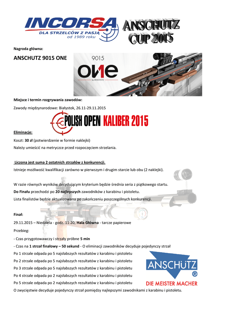 Nagroda główna: ANSCHUTZ 9015 ONE Miejsce i termin rozgrywania zawodów: Zawody międzynarodowe: Białystok, 26.11-29.11.2015 Eliminacje: Koszt: 30 zł (potwierdzenie w formie naklejki) Należy umieścić na metryczce przed rozpoczęciem strzelania. Liczona jest suma 2 ostatnich strzałów z konkurencji. Istnieje możliwość kwalifikacji zarówno w pierwszym i drugim starcie lub obu (2 naklejki). W razie równych wyników decydującym kryterium będzie średnia seria z piątkowego startu. Do Finału przechodzi po 20 najlepszych zawodników z karabinu i pistoletu. Lista finalistów będzie aktualizowana po zakończeniu poszczególnych konkurencji. Finał: 29.11.2015 – Niedziela - godz. 11:20, Hala Główna - tarcze papierowe Przebieg: - Czas przygotowawczy i strzały próbne 5 min - Czas na 1 strzał finałowy – 50 sekund - O eliminacji zawodników decyduje pojedynczy strzał Po 1 strzale odpada po 5 najsłabszych rezultatów z karabinu i pistoletu Po 2 strzale odpada po 5 najsłabszych rezultatów z karabinu i pistoletu Po 3 strzale odpada po 5 najsłabszych rezultatów z karabinu i pistoletu Po 4 strzale odpada po 2 najsłabszych rezultatów z karabinu i pistoletu Po 5 strzale odpada po 2 najsłabszych rezultatów z karabinu i pistoletu O zwycięstwie decyduje pojedynczy strzał pomiędzy najlepszymi zawodnikami z karabinu i pistoletu.