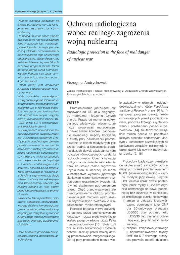 Wspó³czesna Onkologia (2003) vol. 7; 10 (791–793) Obecna sytuacja polityczna na œwiecie uœwiadamia nam, ¿e istnieje realne zagro¿enie u¿ycia broni nuklearnej. Od ponad 50 lat na ca³ym œwiecie trwaj¹ badania nad rol¹ aktywnego tlenu w uszkodzeniach wywo³anych promieniowaniem jonizuj¹cym, oraz ocen¹ zdolnoœci przeciwutleniaczy do zmniejszania jego szkodliwego oddzia³ywania. Walter Reed Army Institute of Research przez 30 lat finansowa³ program rozwoju leków ochraniaj¹cych przed promieniowaniem. Podczas tych badañ zsyntetyzowano i przebadano ponad 4 tys. substancji. Celem pracy jest omówienie zwi¹zków o w³aœciwoœciach radioochronnych. Wiele zwi¹zków zawieraj¹cych w swej budowie grupê tiolow¹ posiada w³aœciwoœci antymutagenne i antyrakotwórcze, chroni przed letalnoœci¹ wywo³an¹ promieniowaniem. Najbardziej znacz¹cym osi¹gniêciem by³o opracowanie zwi¹zku WR – 2721 (kwas S-2-(3-aminopropyloamino)etylofosforotiowy). W wielu pracach udowodnione jest dzia³anie ochronne zwi¹zków zawartych w surowcach naturalnych. Chroni¹ jedynie przed ni¿szymi dawkami promieniowania lub przed promieniowaniem o ni¿szej czêstotliwoœci. Zalet¹ naturalnych przeciwutleniaczy mo¿e byæ niska toksycznoœæ oraz zwiêkszone korzyœci wynikaj¹ce z mo¿liwoœci d³u¿szego ich stosowania. Podkreœla siê ich oddzia³ywanie antymutagenne. Naturalne antyoksydanty czêsto wykazuj¹ d³ugie „okienko” ochrony, tzn. wykazuj¹ pewien stopieñ ochrony wówczas, gdy zostan¹ podane na kilka godzin przed lub po ekspozycji na promieniowanie. Wiele leków, takich jak kofeina, nimodypina, propranolol, oprócz podstawowego dzia³ania farmakologicznego ma dodatkowo w³aœciwoœci antyoksydacyjne. Wszystkie wymienione zwi¹zki mog¹ znaleŸæ zastosowanie jako œrodki chroni¹ce przed promieniowaniem. S³owa kluczowe: promieniowanie jonizuj¹ce, ochrona radiologiczna, antyoksydanty. Ochrona radiologiczna wobec realnego zagro¿enia wojn¹ nuklearn¹ Radiologic protection in the face of real danger of nuclear war Grzegorz Andryskowski Zak³ad Farmakologii i Terapii Monitorowanej z Oddzia³em Chorób Wewnêtrznych, Uniwersytet Medyczny w £odzi WSTÊP Promieniowanie jonizuj¹ce jest stosowane od 100 lat w diagnostyce medycznej i leczeniu ró¿nych chorób. Prawie od momentu odkrycia jego w³aœciwoœci wiadomo, ¿e mo¿e wywo³ywaæ mutagenezê, a nawet œmieræ komórek. Zachowanie równowagi miêdzy korzyœci¹ a strat¹ przy dawkowaniu promieniowania w celach medycznych jest czêsto trudne, a koniecznoœæ podania du¿ych dawek uœwiadamia nam potrzebê równoczesnego dzia³ania radioochronnego. Obecna sytuacja polityczna na œwiecie uœwiadamia nam, ¿e istnieje realne zagro¿enie u¿ycia broni nuklearnej, co mo¿e w nastêpstwie wybuchu j¹drowego skutkowaæ napromieniowaniem bezpoœrednim organizmów ¿ywych, jak równie¿ ska¿eniem popromiennym terenu. Chêæ przeciwstawienia siê niszczycielskiemu obliczu promieniowania jest motorem wyszukiwania najró¿niejszych zwi¹zków o w³aœciwoœciach radioprotekcyjnych. Pierwsze badania in vivo dotycz¹ce ochrony przed promieniowaniem jonizuj¹cym przez przeciwutleniacze zosta³o przeprowadzone przez Patta i wspó³pracowników [13]. Stwierdzili oni, ¿e kwas tioloaminowy i cysteina ochroni³ szczury przed letaln¹ dawk¹ promieniowania rentgenowskiego. Do tej pory przebadano bardzo wie- le zwi¹zków w ró¿nych modelach doœwiadczalnych. Walter Reed Army Institute of Research przez 30 lat finansowa³ program rozwoju leków ochraniaj¹cych przed promieniowaniem, podczas którego zsyntetyzowano i przebadano ponad 4 tys. zwi¹zków [14]. Skutecznoœæ zwi¹zków mo¿na oceniæ na podstawie ró¿nych procedur badawczych. Jednym z parametrów pozwalaj¹cych na porównanie zwi¹zków jest czynnik redukcji dawki lub czynnik modyfikuj¹cy dawkê [9, 16]. Procedury badawcze, okreœlaj¹ce skutecznoœæ zwi¹zków ochraniaj¹cych przed promieniowaniem: DMF (dose modifing factor) – czynnik modyfikuj¹cy dawkê. Czynnik DMF okreœla iloraz dawki poch³oniêtej przez myszy z u¿yciem czynnika ochronnego do dawki poch³oniêtej bez czynnika w odniesieniu do okreœlonego punktu koñcowego: 1) zmian w uk³adzie krwiotwórczym, ocenionym jako DMF dla 30-dniowego prze¿ycia LD50/30 przy podaniu leku i LD50/30 bez czynnika ochraniaj¹cego, jedynie napromieniowanego, 2) zespo³u ¿o³¹dkowo-jelitowego u napromieniowanych myszy. DMF dla 6–7-dniowego prze¿ycia pozwala oceniæ dzia³anie Wspó³czesna Onkologia (2003) vol. 7; 10 (791–793) The present political situation in the world makes us aware of the real danger of the use of nuclear weapons. For over 50 years research has been conducted on the role of active oxygen in ionizing radiationinduced damage and on the estimation of antioxidants’ ability to decrease its harmful effect. For 30 years Walter Reed Army Institute of Research financed the program of development of radioprotective drugs. More than 4000 substances were synthetized and investigated. The aim of this study is to discuss compounds with radioprotective properties. Numerous compounds including a thiol group in their structure have antimutagenic and anticarcinogenic properties and protect against radiation-induced lethality. Developing WR-2721 (S-2-(3-aminopropylamino)ethylphosphorothioic acid) was the most significant achievement. Protective action of compounds found in natural raw materials has been proved in numerous studies. They protect only against lower doses of radiation or against radiation of lower frequency. The advantage of natural antioxidants may be low toxicity and increased benefits resulting from the possibility of their longer application. Their antimutagenic effect is emphasized. Natural antioxidants frequently demonstrate a certain degree of protection when applied a few hours prior to or after exposure to radiation. Many drugs such as caffeine, nimodipine, propranolol, besides their basic pharmacologic 