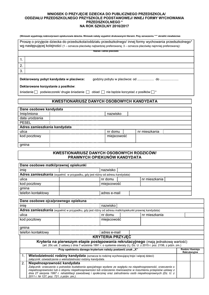 WNIOSEK O PRZYJĘCIE DZIECKA DO PUBLICZNEGO PRZEDSZKOLA/ ODDZIAŁU PRZEDSZKOLNEGO PRZYSZKOLE PODSTAWOWEJ/ INNEJ FORMY WYCHOWANIA PRZEDSZKOLNEGO * NA ROK SZKOLNY 2016/2017 (Wniosek wypełniają rodzice/prawni opiekunowie dziecka. Wniosek należy wypełnić drukowanymi literami. Przy oznaczeniu ”*” skreślić niewłaściwe Proszę o przyjęcie dziecka do przedszkola/oddziału przedszkolnego/ innej formy wychowania przedszkolnego* wg następującej kolejności (1 – oznacza placówkę najbardziej preferowaną; 3 – oznacza placówkę najmniej preferowaną): Nazwa i adres placówki 1. 2. 3. Deklarowany pobyt kandydata w placówce: godziny pobytu w placówce: od ................... do ..................... Deklarowane korzystanie z posiłków: śniadanie podwieczorek/ drugie śniadanie obiad nie będzie korzystać z posiłków * KWESTIONARIUSZ DANYCH OSOBOWYCH KANDYDATA Dane osobowe kandydata Imię/imiona data urodzenia PESEL Adres zamieszkania kandydata ulica kod pocztowy nazwisko nr domu miejscowość nr mieszkania gmina KWESTIONARIUSZ DANYCH OSOBOWYCH RODZICÓW/ PRAWNYCH OPIEKUNÓW KANDYDATA Dane osobowe matki/prawnej opiekunki imię nazwisko Adres zamieszkania (wypełnić w przypadku, gdy jest różny od adresu kandydata) ulica nr domu kod pocztowy miejscowość gmina telefon kontaktowy adres e-mail nr mieszkania Dane osobowe ojca/prawnego opiekuna imię nazwisko Adres zamieszkania (wypełnić w przypadku, gdy jest różny od adresu matki/opiekunki prawnej kandydata) ulica nr domu nr mieszkania kod pocztowy miejscowość gmina telefon kontaktowy adres e-mail KRYTERIA PRZYJĘĆ Kryteria na pierwszym etapie postępowania rekrutacyjnego (mają jednakową wartość) (art. 20c ust. 2 ustawy z dnia 7 września 1991 r. o systemie oświaty (t.j. Dz. U. z 2015 r. poz. 2156, z późn. zm.) Rodzic/ Komisja Przy spełnieniu danego kryterium należy postawić znak „X” Rekrutacyjna 1. Wielodzietność rodziny kandydata 2. Niepełnosprawność kandydata (oznacza to rodzinę wychowującą troje i więcej dzieci) załącznik: oświadczenie o wielodzietności rodziny kandydata. Załącznik: orzeczenie o potrzebie kształcenia specjalnego wydane ze względu na niepełnosprawność, orzeczenie o niepełnosprawności lub o stopniu niepełnosprawności lub orzeczenie równoważne w rozumieniu przepisów ustawy z dnia 27 sierpnia 1997 r. rehabilitacji zawodowej i społecznej oraz zatrudnianiu osób niepełnosprawnych (Dz. U. z 2011 r. Nr 127, poz. 721, z późn. zm.). 3. Niepełnosprawność jednego z rodziców kandydata Załącznik: orzeczenie o niepełnosprawności lub o stopniu niepełnosprawności lub orzeczenie równoważne w rozumieniu przepisów ustawy z dnia 27 sierpnia 1997 r. rehabilitacji zawodowej i społecznej oraz zatrudnianiu osób niepełnosprawnych (Dz. U. z 2011 r. Nr 127, poz. 721, z późn. zm.). 4. Niepełnosprawność obojga rodziców kandydata Załącznik: orzeczenie o niepełnosprawności lub o stopniu niepełnosprawności lub orzeczenie równoważne w rozumieniu przepisów ustawy z dnia 27 sierpnia 1997 r. rehabilitacji zawodowej i społecznej oraz zatrudnianiu osób niepełnosprawnych (Dz. U. z 2011 r. Nr 127, poz. 721, z późn. zm.). 5. Niepełnosprawność rodzeństwa kandydata 6. Załącznik: orzeczenie o potrzebie kształcenia specjalnego wydane ze względu na niepełnosprawność, orzeczenie o niepełnosprawności lub o stopniu niepełnosprawności lub orzeczenie równoważne w rozumieniu przepisów ustawy z dnia 27 sierpnia 1997 r. rehabilitacji zawodowej i społecznej oraz zatrudnianiu osób niepełnosprawnych (Dz. U. z 2011 r. Nr 127, poz. 721, z późn. zm.). Samotne wychowywanie kandydata w rodzinie (oznacza to wychowywanie dziecka przez pannę, kawalera, wdowę, wdowca, osobę pozostającą w separacji orzeczonej prawomocnym wyrokiem sądu, osobę rozwiedzioną, chyba że osoba taka wychowuje wspólnie co najmniej jedno dziecko z jego rodzicem) Załącznik: prawomocny wyrok sądu rodzinnego orzekający rozwód lub separację lub akt zgonu oraz oświadczenie o samotnym wychowywaniu dziecka oraz niewychowywaniu żadnego dziecka wspólnie z jego rodzicem). 7. Objęcie kandydata pieczą zastępczą Załącznik: dokument potwierdzający objęcie dziecka pieczą zastępczą zgodnie z ustawą z dnia 9 czerwca 2011 r. o wspieraniu rodziny i systemie pieczy zastępczej (Dz. U. z 2013 r. poz.135). Kryteria na drugim etapie postępowania rekrutacyjnego (mają nw. wartość) (zgodnie z Uchwałą Nr XVIII/135/16 Rady Miejskiej w Rabce-Zdroju z dnia 27 stycznia 2016 r. w sprawie: określenia kryteriów wraz z liczbą punktów na drugim etapie postępowania rekrutacyjnego do publicznych przedszkoli, publicznych oddziałów przedszkolnych, publicznych innych form wychowania przedszkolnego oraz w postępowaniu rekrutacyjnym do klas pierwszych publicznych szkół podstawowych, publicznych gimnazjów, dla których Gmina Rabka-Zdrój jest organem prowadzącym oraz określenia dokumentów niezbędnych do potwierdzenia tych kryteriów – Dz. Urz. Woj. Małopolskiego poz. 771 z dnia 28.01.2016 r.). Rodzic/ Komisja Przy spełnieniu danego kryterium należy wstawić odpowiednią liczbę punktów Rekrutacyjna 1. Kandydat podlegający obowiązkowi odbycia rocznego przygotowania przedszkolnego – 37 pkt Załącznik: oświadczenie o podleganiu przez kandydata obowiązkowi odbycia rocznego przygotowania przedszkolnego 2. Kandydat mający prawo do korzystania z wychowania przedszkolnego –37 pkt Załącznik: oświadczenie o prawie kandydata do korzystania z wychowania przedszkolnego 3. Kandydat obojga rodziców (prawnych opiekunów) pracujących/ wykonujących rolniczą lub pozarolniczą działalność gospodarczą/ studiujących lub uczących się w systemie dziennym albo kandydat, którego jeden z rodziców (prawnych opiekunów) pracuje/ wykonuje rolniczą lub pozarolniczą działalność gospodarczą / studiuje lub uczy się w systemie dziennym albo kandydat pracującego / wykonującego r