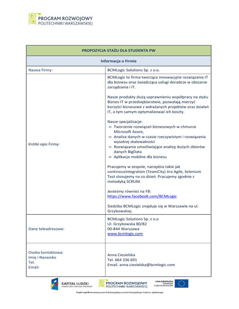 PROPOZYCJA STAŻU DLA STUDENTA PW Informacja o Firmie Nazwa Firmy: BCMLogic Solutions Sp. z o.o. BCMLogic to firma tworząca innowacyjne rozwiązania IT dla biznesu oraz świadcząca usługi doradcze w obszarze zarządzania i IT. Nasze produkty służą usprawnieniu współpracy na styku Biznes-IT w przedsiębiorstwie, pozwalają mierzyć korzyści biznesowe z wdrażanych projektów oraz działań IT, a tym samym optymalizować ich koszty. Krótki opis Firmy: Nasze specjalizacje: • Tworzenie rozwiązań biznesowych w chmurze Microsoft Azure, • Analiza danych w czasie rzeczywistym i rozwiązania wysokiej skalowalności • Rozwiązania umożliwiające analizę dużych zbiorów danych BigData • Aplikacje mobilne dla biznesu Pracujemy w zespole, narzędzia takie jak continousintegration (TeamCity) Jira Agile, Selenium Test stosujemy na co dzień. Pracujemy zgodnie z metodyką SCRUM. Jesteśmy również na FB: https://www.facebook.com/BCMLogic Siedziba BCMLogic znajduje się w Warszawie na ul. Grzybowskiej. Dane teleadresowe: Osoba kontaktowa: Imię i Nazwisko Tel. Email: BCMLogic Solutions Sp. z o.o Ul. Grzybowska 80/82 00-844 Warszawa www.bcmlogic.com Anna Ciesielska Tel. 664 336 691 Email. [email protected] Propozycja dla studenta Nazwa stanowiska lub ewentualnie opis obszaru w jakim staż miałby się odbywać: Dostępne stanowiska: • Programista .NET Podczas stażu kandydat dołącza do zespołu programistów i pracuje nad wybranym fragmentem oprogramowania, uczestniczy w spotkaniach SCRUM. Ma możliwość poznania wykorzystywanych narzędzi, poznania od strony praktycznego użycia wzorców i modeli projektowych (DDD, BDD, CQRS). Zapraszamy również osoby stojące przed wyborem tematu pracy inżynierskiej/magisterskiej - wspólnie znajdziemy dobry temat i zapewnimy wsparcie merytoryczne. • Analityk IT W ramach stażu kandydat dołączy do zespołu analityków uczestniczących w projektowaniu, analizie i testowaniu aplikacji. Poznaje narzędzia wspierające oraz wzorce pełnego cyklu wytwarzania oprogramowania. Jeśli chcesz stać się częścią naszego skontaktuj się z nami. Branża stanowiska: Informatyka 1 Proponowany termin stażu : Nabór ciągły. 1 Staż powinien trwać 3 miesiące (min. 15 godzin tygodniowo).