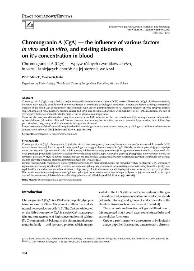 PRACE POGLĄDOWE/REVIEWS Endokrynologia Polska/Polish Journal of Endocrinology Tom/Volume 61; Numer/Number 4/2010 ISSN 0423–104X Chromogranin A (CgA) — the influence of various factors in vivo and in vitro, and existing disorders on it’s concentration in blood Chromogranina A (CgA) — wpływ różnych czynników in vivo, in vitro i istniejących chorób na jej stężenia we krwi Piotr Glinicki, Wojciech Jeske Department of Endocrinology, The Medical Centre of Postgraduate Education, Warsaw, Poland Abstract Chromogranin A (CgA) is regarded as a major, nonspecific neuroendocrine tumour (NET) marker. The results of CgA blood concentration, however, may actually be influenced by various factors or coexisting pathological conditions. Among the factors causing a substantial increase of the blood CgA concentration are: treatment with proton-pump inhibitors or H2 -receptor blockers, chronic atrophic gastritis (type A), impaired renal function, prostate cancer and BPH, and rheumatoid arthritis with high level of RF IgM. In addition, the sort of investigated biological material (whether it is serum or plasma) is of importance. There are also many conditions which may have a moderate or little influence on the concentration of CgA, among them are: inflammatory bowel disease (ulcerative colitis and Crohn’s disease), deteriorating liver function, untreated essential hypertension, heart failure, hypercortisolism, pregnancy, and, in some subjects, ingestion of a meal. Proper assessment of the CgA results requires detailed knowledge about various factors, drugs, and pathological conditions influencing its concentration in blood. (Pol J Endocrinol 2010; 61 (4): 384–387) Key words: chromogranin A, neuroendocrine tumours Streszczenie Chromogranina A (CgA, chromogranin A) jest obecnie uznana jako główny, niespecyficzny marker guzów neuroendokrynnych (NET, neuroendocrine tumours). Liczne czynniki i stany patologiczne mogą wpływać na stężenie CgA. Wśród czynników powodujących największy wzrost stężenia CgA wymienić należy: leki z grupy inhibitorów pompy protonowej i antagonistów receptorów H2, zaś spośród różnych patologii: przewlekłe zanikowe zapalenie błony śluzowej żołądka typu A (atrophic gastritis), postępująca niewydolność nerek, rak i przerost prostaty. Wpływ na wynik oznaczenia CgA ma także rodzaj użytego materiału biologicznego (czy jest to surowica czy osocze) oraz na przykład obecność czynnika reumatoidalnego (RF) w klasie IgM. Istnieje również wiele czynników i stanów patologicznych, które mają umiarkowany lub niewielki wpływ na stężenie CgA, wśród nich wymienia się: choroby zapalne jelit (wrzodziejące zapalenie jelita grubego, choroba Leśniowskiego-Crohna), niewydolność wątroby, niewydolność serca, nieleczone nadciśnienie tętnicze, hiperkortyzolemia, ciąża oraz, u niektórych pacjentów, wcześniejsze spożycie posiłku. Dla prawidłowej interpretacji oznaczeń CgA niezbędna jest dobra znajomość potencjalnego wpływu na jej stężenie we krwi różnych czynników, stosowanych leków lub współistniejących schorzeń. (Endokrynol Pol 2010; 61 (4): 384–387) Słowa kluczowe: chromogranina A, guzy neuroendokrynne Introduction Chromogranin A (CgA) is a 49-kDa hydrophilic glycoprotein composed of 439 aa. It is present in all normal and abnormal neuroendocrine cells [1, 2]. The CgA gene is located on the 14th chromosome. CgA is a major Ca²+ storage protein and can aggregate at high concentrations of calcium [3]. Chromogranin A belongs to the chromogranin/secretogranin family — acid secretory proteins which are pre- sented in the DES (diffuse endocrine system) in the gastrointestinal tract, respiratory system, and endocrine glands (adrenals, pituitary) and groups of endocrine cells in the glandular tissues such as pancreas and thyroid [4]. The exact role and function of CgA is still unknown. It is suggested that it could exert some intracellular and extracellular functions: — CgA as a pro-hormone is a precursor of biologically active peptides (vasostatin, pancreastatin, chromo- Glinicki M. Sc., Department of Endocrinology, The Medical Centre of Postgraduate Education, Bielanski Hospital, 80 Cegłowska St., Piotr 01–809 Warsaw, Poland, tel.: +48 22 56 90 293/168, e-mail: [email protected] 384 statin) which have autocrine, paracrine, and endocrine functions; — It plays a role in the production, storage, transport, and regulatory functions of peptide hormones [5-7]. CgA — circulating tumour marker Chromogranin A is a major, nonspecific NET marker. The expression of CgA depends on the cell type and on the number of secretory granules present in the cells [8]. Chromogranin A is physiologically released by exocytosis and may be detected in blood as a circulating tumour marker. CgA is a universal marker of neuroendocrine tissues and tumours, such as: GEP NET (gastroentero-pancreatic neuroendocrine tumours), carcinoid, pheochromocytoma, thyroid medullary carcinoma, parathyroid adenoma, MEN 1 syndrome, neuroblastoma, small cell lung cancer, bronchopulmonary NETs, and others [9, 10]. Measurement of CgA levels in blood can also be used for monitoring the progression or regression of neuroendocrine tumors during treatment. The sensitivity of this tumour marker in NETs fluctuates between 10 and 100% and its specificity between 68 and 100% [10]. In patients with metastatic disease, CgA has a sensitivity of 60–100% and its level may increase even 100–1000 times. The highest values are observed in carcinoid tumours with liver metastases [11]. In small tumours (except gastrinoma) such as: insulinoma, paraganglioma, small bronchi carcinoids, and pituitary tumours, the levels of CgA may be in the normal range. [12]. The highest sensitivity of CgA measurement was noted in gastrinoma (100%), pheochromocytoma (89%), carcinoid tumours (80%), non-functioning tumours of the endocrine pancreas (69%), and medullary thyroid carcinoma (5