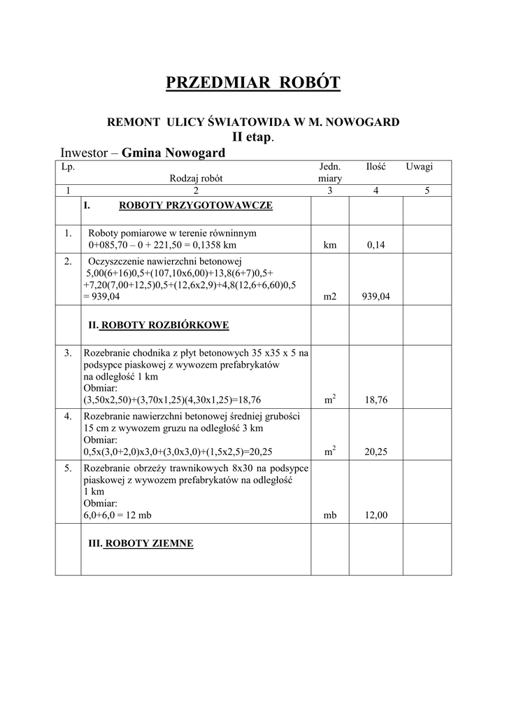PRZEDMIAR_ROBÓT REMONT ULICY ŚWIATOWIDA W M. NOWOGARD II etap. Inwestor – Gmina Nowogard Jedn. miary 3 Ilość km 0,14 m2 939,04 Rozebranie chodnika z płyt betonowych 35 x35 x 5 na podsypce piaskowej z wywozem prefabrykatów na odległość 1 km Obmiar: (3,50x2,50)+(3,70x1,25)(4,30x1,25)=18,76 m2 18,76 Rozebranie nawierzchni betonowej średniej grubości 15 cm z wywozem gruzu na odległość 3 km Obmiar: 0,5x(3,0+2,0)x3,0+(3,0x3,0)+(1,5x2,5)=20,25 m2 20,25 Rozebranie obrzeży trawnikowych 8x30 na podsypce piaskowej z wywozem prefabrykatów na odległość 1 km Obmiar: 6,0+6,0 = 12 mb mb 12,00 Lp. 1 I. 1. 2. Rodzaj robót 2 ROBOTY PRZYGOTOWAWCZE Roboty pomiarowe w terenie równinnym 0+085,70 – 0 + 221,50 = 0,1358 km Oczyszczenie nawierzchni betonowej 5,00(6+16)0,5+(107,10x6,00)+13,8(6+7)0,5+ +7,20(7,00+12,5)0,5+(12,6x2,9)+4,8(12,6+6,60)0,5 = 939,04 4 II. ROBOTY ROZBIÓRKOWE 3. 4. 5. III. ROBOTY ZIEMNE Uwagi 5 6. Ukop z transportem ziemi z odległości 3km i wbudowanie w nasyp. Obmiar: 0,50x(4,50x5,00)+3,0x(3,00+1,50)x0,5+0,50(5,x13)+ +(5x2,50)+1,50x28,00x2+1,0(4+4+4+)+(20x0,50)+ +(100x0,50)+(37,50X0,50)=166,15 166,16x0,15=24,92 m3 7. 8. 24,92 Formowanie nasypów z ziemi dostarczonej. Obmiar z poz. 6 m3 24,92 m3 24,92 m2 109,40 m2 204,89 Zagęszczenie nasypów. Obmiar z poz. nr 6 IV. KORYTO I PODBUDOWA 9. Wykonanie koryta średniej głębokości 35 cm pod parking +zjazd w km 0+110 Obmiar: 16,10x5,00=80,50 ( 4,64x6,00)+0,5(1,0x1,0)x2=28,90 Razem: 80,50+28,90=109,40 10. Wykonanie warstwy podsypkowej z piasku średniej grubości 10 cm. Obmiar z poz.22: a/ parking obmiar z poz.8 = 80,50 b/ zjazd w km 0+110 str.P (4,64x6,00)+0,5(1,0x1,0)x2=28,90 c/ chodnik z płyt betonowych 35x35x5 w km 0+192-0+220 str.L. 2,20x28,0+1,5x(2,0+2,3)0,5+1,5(2,0+3,0)x0,50+ +(2,0x1,0)+(0,50x1,50)=69,98 d/ pod chodniki w km 0+117,00,0+128,50,0+168,50,0+199,00 Obmiar z poz. 2 = 18,76 18,76+3,0x(2,0+2,5)0,50+25,45 Razem: 80,50+28,90+69,98+25,51=204,89 11. Wykonanie podbudowy z kruszywa łamanego grubości warstwy 25 cm na parkingu + zjazd w km 0+110 Obmiar z poz.9 109,40 m2 109,40 12. Cięcie piła nawierzchni betonowych na gł.5 cm- wykonanie szczelin dylatacyjnych pozornych głębokości 5 cm( 2 szczeliny na płytę, mijankowo na pasach ruchu) średnio 6 szczelin na 10 mb ulicy 136:10x 6 =81,6 x 3,0=244,8 mb 244,80 13. Wyrównanie nawierzchni mieszanką mineralnobitumiczną w ilości 150 kg/m2 – skrzyżowanie z ul.Gryfitów w km 0+089,30 Obmiar: 0,5(7,00+6,00)x 1,50+6,00x6,00 = 45,75 45,75x0,150=6,86 mg 6,86 14. Wyrównanie istniejącej podbudowy betonowej betonem B 7,5 MPa Obmiar: a/ załącznik Nr 1.3 60,03 b/ zasypywanie ubytków w podbudowie 30% powierzchni na głębokości średnio 7 cm. 0+105-0+220=115mb 115x6,00x0,30 =207 m2 207x0,07=14,49 c/ pod chodnik w km 0+105-0+127,50 średnio grubości 10 cm 2,20x(18+20)0,5+(2,00x4,50)= 50,80 50,80x0,10=5,08 d/ skrzyżowanie w km 0+089,30 z ul.Gryfitów średnio 12 cm 5,0x(16+6)0,5 = 55,00x 0,12+ 6,60 Razem:60,03+14,49+5,08+6,60=86,20 m3 86,20 m2 6,70 m3 23,14 KANALIZACJA DESZCZOWA 15. Rozebranie istniej. nawierzchni betonowej grubości 20cm z wywozem gruzu na odległość 3 km (7x0,9)+ (0,5x0,8) = 6,70 16. Wykop z załadunkiem ręcznym z wywozem na odleg. 1 km (7x0,9+4x0,9)x 1,6+(4,65x0,3x0,4) +(4x0,9x) +(1,0x1,0)x2,50 +(0,5x0,8)x1,60= 23,14 17. Ułożenie rurociągu z rur PCV fi 150mm 7+4=11 mb 11 18. Ustawienie studni ściekowej o średnicy fi 500mm z osadnikiem bez syfonu 1 szt.. 1 19. Wykonanie odwodnienia liniowego 4,60 mb 4,60 20. Ustawienie studni rewizyjnej z kręgów betonowych o średnicy 1200 mm 1 szt. 1 21. Zasypanie pospółką wykopów o ścianach pionowych o szer. 0,8 w gruncie kat. III 1,6x(7,00+4,00)=17,60 m3 17,60 22. Wykonanie podbudowy z betonu B 15 grubości 20 cm 7x0,9=6,30 m2 6,30 23. Ustawienie krawężnika 30 x 15 na ławie betonowej zwykłej. Obmiar: a/ km 0+106 - 0+221,50 110+40+97+5=252 b/ zjazd w km 0+110 str.P 1,5+1,5+6+6=15,00 c/ parking 5+5+16,10=26,10 d/ chodnik str.L 27,50 +6 Razem: 252+15+26,10+27,50+6= 311,6 mb 311,6 24. Ustawienie obrzeży trawnikowych na podsypce piaskowej. Obmiar: (9+9)+(3+3)x3=36 mb 36,00 25. Przełożenie obrzeży trawnikowych 28+28+1,5+1,5=59 mb 59,00 m2 28,90 V. KRAWĘŻNIK I OBRZEŻA VI. CHODNIKI 26. Przełożenie chodnika z kostki betonowej typu POLBRUK grubości 8 cm na podsypce cementowo – piaskowej grubości 3 cm Zjazd w km 0+110 str.P Obmiar: (4,64x6,00)+0,5(1,0x1,0)x2=28,90 27. Ułożenie chodnika z kostki betonowej typu POLBRUK grubości 6 cm na podsypce cementowo – piaskowej grubości 5 cm. Kostka kolorowa – 30% powierzchni Chodnik w km 0+105-0+127,50 str.L 2,20x(18+20)0,5+(2,00x4,50)= 50,80 - chodniki w km 0+117,00,0+128,50,0+168,50,0+199,00 Obmiar z poz. 2 = 18,76 Razem:50,80+18,78 = 69,58 69,58x0,3=20,87 28. Ułożenie chodnika z kostki betonowej typu POLBRUK grubości 6 cm na podsypce cementowo – piaskowej grubości 5 cm. Kostka szara – 70% całkowitej powierzchni 69,58x0,7=48,71 m2 20,87 m2 48,71 m2 69,98 m2 36,81 29. Przełożenie chodnika z płyt betonowych 35x35x5 na podsypce cementowo – piaskowej grubości 5 cm w km 0+192-0+220 str.L. 2,20x28,0+1,5x(2,0+2,3)0,5+1,5(2,0+3,0)x0,50+ +(2,0x1,0)+(0,50x1,50)=69,98 30. Wykonanie nawierzchni betonowej grubości 15 cm z betonu B 15 a/ w chodniku w km 0+219,50-0+221,50 str.L 10x2,00=20,00 b/ w śmietniku 4,10x4,10=16,81 Razem:20+16,81=36,81 V. NAWIERZCHNIA 31. Frezowanie nawierzchni bitumicznej średniej grubości 5,00 cm Obmiar: 0+126-0+150=24x0,80x0,5=9,50 0+092-0+110= 18x1,5x0,5=13,50 0+206-0+221=15x0,5x3+3x7,0xx0,5=33 Skrzyżowanie z ul.Gryfitów 0,50x7,00x6,00=21 Razem:9,60+13,50+33+21=77,10 m2 32. Wykonanie warstwy ścieralnej z kostki brukowej betonowej grubości 8 cm szarej na podsypce cementowo-piaskowej 1:4 grubości warstwy 3 cm obmiar z poz.2 - 939,04 parking 5,00x16,10=80,50 Razem 939,04+80,50=1.019,54 m2 77,10 m2 1.019,54 szt. 3 szt. 2 m2 166,15 m2 138,00 VI. ROBOTY WYKOŃCZENIOWE 33. Regulacja studni urządzeń podzie