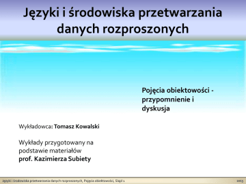 Języki i środowiska przetwarzania danych rozproszonych Pojęcia obiektowości przypomnienie i dyskusja Wykładowca: Tomasz Kowalski Wykłady przygotowany na podstawie materiałów prof. Kazimierza Subiety Języki i środowiska przetwarzania danych rozproszonych, Pojęcia obiektowości, Slajd 1 2013 Co to jest obiektowość? W ostatnich latach termin „obiektowy” (object-oriented) stał się bardzo popularnym określeniem narzędzi i technologii informatycznych. Równie popularne stały się pojęcia charakteryzujące obiektowość, takie jak: obiekt, tożsamość, klasa, typ, powiązanie, interfejs, metoda, komunikat, dziedziczenie, hermetyzacja, polimorfizm. Centralnym motywem obiektowości jest dopasowanie modeli komputerowych do własności ludzkich zmysłów i mózgu – mechanizmów percepcji, wyobrażeń i rozumienia świata. • Świat jest postrzegany przez ludzi jako mnogość obiektów, powiązań pomiędzy obiektami oraz zachowania się obiektów. • Obiekty świata rzeczywistego podlegają klasyfikacji na podstawie ich podobieństwa. Mnogość poglądów oraz bardzo różnych koncepcji obiektowości. Po wyjaśnieniu podstaw koncepcyjnych obiektowości będziemy starali się przedstawić nasze formalne spojrzenie na obiektowość, które umożliwi precyzyjne definiowanie własności obiektowych języków zapytań. Języki i środowiska przetwarzania danych rozproszonych, Pojęcia obiektowości, Slajd 2 2013 Uporządkowanie pojęć (w wykładach prof. K. Subiety) Obiekt – tożsamość, identyfikator i jego trwałość, nazwa, stan, atrybuty, metody, … Obiekty złożone, Zasada relatywizmu obiektu, Zasada wewnętrznej identyfikacji. Powiązania pomiędzy obiektami, obiekty pointerowe, wyrażenia ścieżkowe, powiązania binarne i n-arne, problem aktualizacji powiązań Hermetyzacja – ortodoksyjna i ortogonalna. Komunikat, a: procedura, zdarzenie, asynchroniczne przetwarzanie. Klasa, Zasada "otwarta-zamknięta", interfejs, dziedziczenie, wielodziedziczenie, obywatelstwo klasy, ekstensja klasy, Zasada zamienialności (LSP), abstrakcyjny typ danych (ADT). Polimorfizm, przesłanianie, przeciążanie. Kolekcje, wartości zerowe, warianty (unie), dane pół-strukturalne Trwałość i jej rodzaje, ortogonalna trwałość Moduły Języki i środowiska przetwarzania danych rozproszonych, Pojęcia obiektowości, Slajd 3 2013 Obywatelstwo klasy W językach programowania obywatelem pierwszej kategorii nazywa się taki byt programistyczny, którym można manipulować w czasie wykonania. Obywatelem drugiej kategorii nazywa się ten byt, który istnieje tylko w tekście źródłowym programu - nie istnieje lub jest niedostępny podczas wykonania. Klasa może być obywatelem pierwszej (Smalltalk) lub drugiej kategorii (C++). W zależności od kategorii obywatelstwa są możliwe lub niemożliwe niektóre operacje na klasie, takie jak: • • • • Wysłanie komunikatu do klasy (jako obiektu); Zmiana nazwy obiektu; Dynamiczna zmiana zestawu lub typu atrybutów obiektów ; Dynamiczna zmiana zestawu metod znajdujących się wewnątrz klasy. Jeżeli klasy są obywatelami pierwszej kategorii, to mogą one być traktowane na takich samych zasadach jak normalne obiekty programistyczne lub obiekty bazy danych. Języki i środowiska przetwarzania danych rozproszonych, Pojęcia obiektowości, Slajd 4 2013 Ekstensja klasy extent Jest to nazwany zbiór obiektów aktualnie należących do danej klasy. OSOBA Nazwisko Kowalska RokUr 1975 Ekstensja klasy OSOBA OSOBA Nazwisko Nowak RokUr 1951 OSOBA Nazwisko Abacki RokUr 1948 PRACOWNIK Nazwisko Nowak RokUr 1951 Zarobek 2000 Dział zabawki PRACOWNIK Nazwisko Abacki RokUr 1948 Zarobek 2500 Dział zabawki OSOBA Nazwisko RokUr Wiek() OSOBA Nazwisko Babacki RokUr 1940 PRACOWNIK Nazwisko Babacki RokUr 1940 Zarobek 3000 Dział sprzedaż PRACOWNIK Zarobek Dział ZarobekNetto() ZmieńZarobek(...) Ekstensja klasy PRACOWNIK Różne ekstensje mogą mieć wspólne części, co może być powodem trudności semantycznych. Stąd pojęcie ekstensji jest kontrowersyjne. Jest ona uważana za wątpliwe "dziedzictwo" modelu relacyjnego. Języki i środowiska przetwarzania danych rozproszonych, Pojęcia obiektowości, Slajd 5 2013 Kolekcje collections Kolekcje są zestawami danych o podobnej strukturze. Rozmiaru kolekcji nie można przewidzieć ani ograniczyć. Do kolekcji zaliczane są zbiory, relacje, wielozbiory, sekwencje, listy, drzewa, itp. • Popularne języki programowania nie wprowadzają pojęcia kolekcji lub silnie je ograniczają (np. Java - sekwencja referencji). • Brak kolekcji w językach programowania jest powodem niezgodności impedancji pomiędzy językiem programowania i językiem zapytań. • Brak kolekcji jest powodem konieczności używania sterty (heap), co np. prowadzi do wyciekania pamięci. Kolekcje mogą być zagnieżdżone (co jest najczęściej ignorowane przez teorie dotyczące obiektowych baz danych, np. obiektowe algebry). • Relacje z modelu relacyjnego są przypadkiem kolekcji. Brak możliwości zagnieżdżania relacji jest utrudnieniem dla modelowania pojęciowego, ale zdaniem adwokatów modelu relacyjnego, upraszcza struktury danych i daje możliwość zastosowania matematyki. Są to poglądy kontrowersyjne. Języki i środowiska przetwarzania danych rozproszonych, Pojęcia obiektowości, Slajd 6 2013 Trwałość persistence Byt programistyczny jest trwały, jeżeli żyje dłużej niż trwa czas działania programu, który go używa • Wszystko, co zawierają bazy danych, jest trwałe. Trwałą zmienną jest zmienna programistyczna, która ma wszystkie własności normalnej zmiennej, ale której wartość przy nowym uruchomieniu programu jest taka sama, jak przy zakończeniu poprzedniego uruchomienia programu. Popularne języki programowania (C, C++, Smalltalk, Pascal, Java,...) nie mają trwałych zmiennych / trwałych obiektów. Istnieją prototypowe języki/systemy z trwałością (DBPL, Napier88, PSAlgol, Galileo, Fibonacci