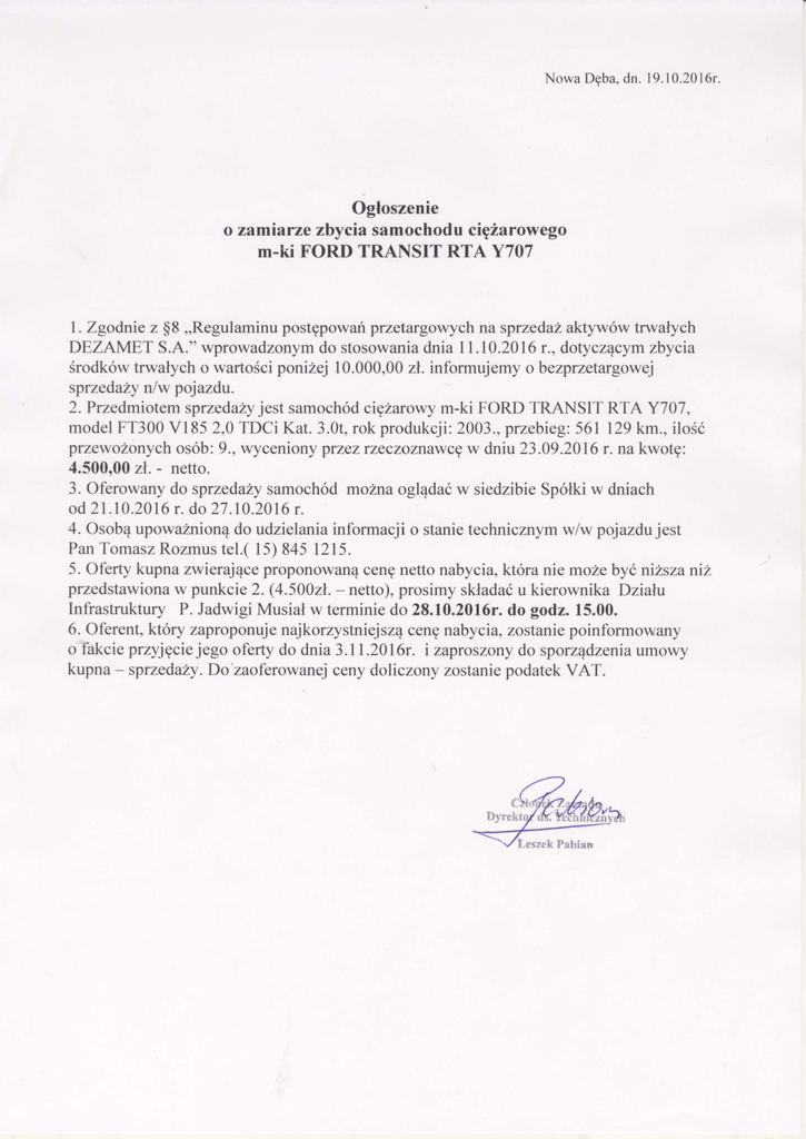 NowaDgba,dn. 19.10.2016r. Ogloszenie o zamiarze zbycia samochoducigiarowego m-ki FORD TRANSIT RTA Y707 l. Zgodnie z $8 ,,Regulaminupostgpowahprzetargowychna sprzedazaktyw6w trwatych DEZAMET S.A." wprowadzonymdo stosowaniadnia I 1. 10.2016 r., dotycz1cymzbycia Srodk6wtrwatych o wartoSciponiZej 10.000,00zl. informujemy o bezprzetargowej sprzeda?yn/w pojazdu. jest samoch6dcig2arowym-ki FORD TRANSIT RTA Y707, 2. Przedmiotemsprzedairy modelFT300 Vl85 2,0 TDCi Kat. 3.0t,rok produkcji:2003.,przebieg:561 129km., iloSi przewozonychos6b:9., wyceniony przezrzeczoznawcg w dniu 23.09.2016r. na kwotg: 4.500,00zl. netto. 3. Oferowany do sprzeduly samoch6d mohnaogl4da6w siedzibie Sp6lki w dniach o d 2 1 . 1 0 . 2 0 1r 6 . d o 2 7 . 1 0 . 2 0 1r 6 . 4. Osob4upowaZnion4do udzielaniainformacji o stanietechnicznymw/w pojazdujest PanTomaszRozmustel.( 15) 845 1215. 5. Oferty kupna zwieraj4ceproponowanqcengnetto nabycia,kt6ra nie moze byl ni2szani| przedstawionaw punkcie 2. (4.50021.- netto),prosimy skladadu kierownika Dzialu Infrastruktury P. Jadwigi Musial w terminie do 28.10.2016r.do godz. 15.00. 6. Oferent,kt6ry zaproponujenajkorzystniejsz4cengnabycia,zostaniepoinformov(any o fakcie przyjgciejego oferty do dnia 3.11.2016r.i zaproszonydo sporzqdzenia umowy kupna - sprzeda|y.Do'zaoferowanejceny doliczony zostaniepodatekVAT.