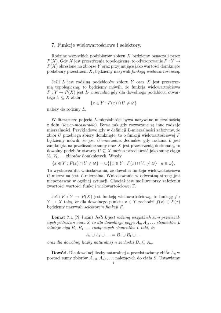 Selektor funkcji wielowartościowej F określimy jako granicę jednostajną ciągu f0 , f1 , . . . funkcji L-mierzalnych określonych na sumie ∪L