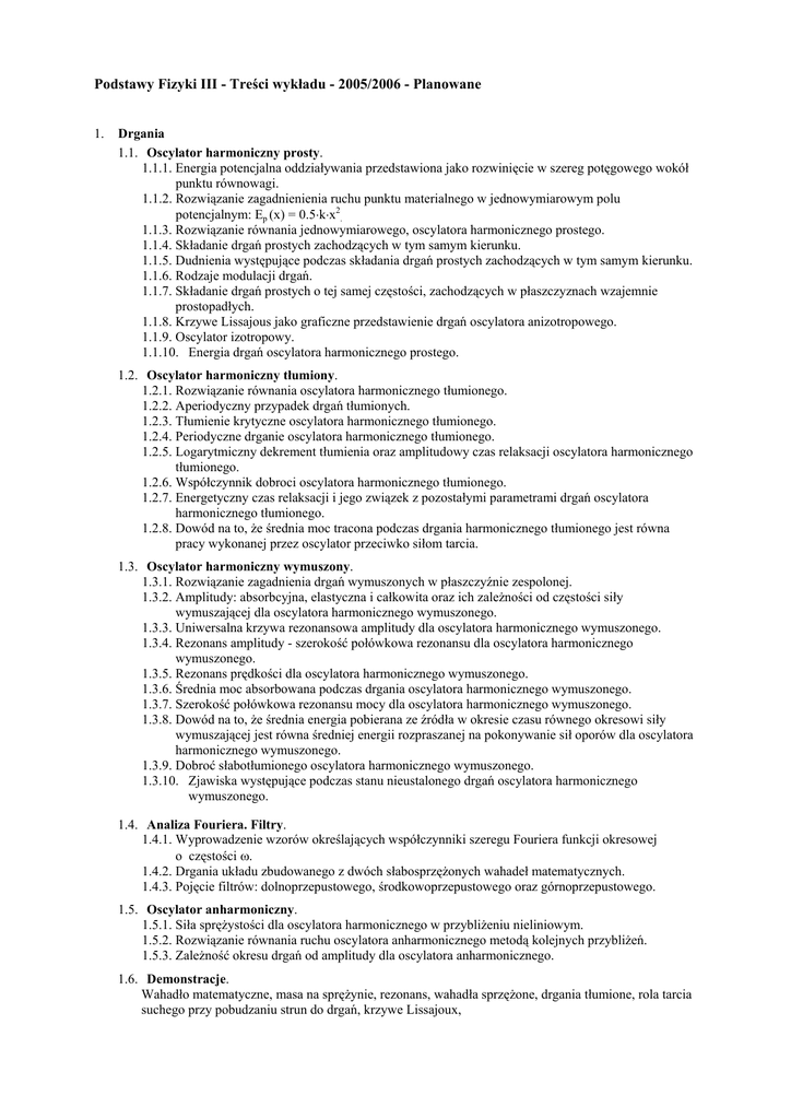 Podstawy Fizyki III - Treści wykładu - 2005/2006 - Planowane 1. Drgania 1.1. Oscylator harmoniczny prosty. 1.1.1. Energia potencjalna oddziaływania przedstawiona jako rozwinięcie w szereg potęgowego wokół punktu równowagi. 1.1.2. Rozwiązanie zagadnienienia ruchu punktu materialnego w jednowymiarowym polu potencjalnym: Ep (x) = 0.5⋅k⋅x2. 1.1.3. Rozwiązanie równania jednowymiarowego, oscylatora harmonicznego prostego. 1.1.4. Składanie drgań prostych zachodzących w tym samym kierunku. 1.1.5. Dudnienia występujące podczas składania drgań prostych zachodzących w tym samym kierunku. 1.1.6. Rodzaje modulacji drgań. 1.1.7. Składanie drgań prostych o tej samej częstości, zachodzących w płaszczyznach wzajemnie prostopadłych. 1.1.8. Krzywe Lissajous jako graficzne przedstawienie drgań oscylatora anizotropowego. 1.1.9. Oscylator izotropowy. 1.1.10. Energia drgań oscylatora harmonicznego prostego. 1.2. Oscylator harmoniczny tłumiony. 1.2.1. Rozwiązanie równania oscylatora harmonicznego tłumionego. 1.2.2. Aperiodyczny przypadek drgań tłumionych. 1.2.3. Tłumienie krytyczne oscylatora harmonicznego tłumionego. 1.2.4. Periodyczne drganie oscylatora harmonicznego tłumionego. 1.2.5. Logarytmiczny dekrement tłumienia oraz amplitudowy czas relaksacji oscylatora harmonicznego tłumionego. 1.2.6. Współczynnik dobroci oscylatora harmonicznego tłumionego. 1.2.7. Energetyczny czas relaksacji i jego związek z pozostałymi parametrami drgań oscylatora harmonicznego tłumionego. 1.2.8. Dowód na to, Ŝe średnia moc tracona podczas drgania harmonicznego tłumionego jest równa pracy wykonanej przez oscylator przeciwko siłom tarcia. 1.3. Oscylator harmoniczny wymuszony. 1.3.1. Rozwiązanie zagadnienia drgań wymuszonych w płaszczyźnie zespolonej. 1.3.2. Amplitudy: absorbcyjna, elastyczna i całkowita oraz ich zaleŜności od częstości siły wymuszającej dla oscylatora harmonicznego wymuszonego. 1.3.3. Uniwersalna krzywa rezonansowa amplitudy dla oscylatora harmonicznego wymuszonego. 1.3.4. Rezonans amplitudy - szerokość połówkowa rezonansu dla oscylatora harmonicznego wymuszonego. 1.3.5. Rezonans prędkości dla oscylatora harmonicznego wymuszonego. 1.3.6. Średnia moc absorbowana podczas drgania oscylatora harmonicznego wymuszonego. 1.3.7. Szerokość połówkowa rezonansu mocy dla oscylatora harmonicznego wymuszonego. 1.3.8. Dowód na to, Ŝe średnia energia pobierana ze źródła w okresie czasu równego okresowi siły wymuszającej jest równa średniej energii rozpraszanej na pokonywanie sił oporów dla oscylatora harmonicznego wymuszonego. 1.3.9. Dobroć słabotłumionego oscylatora harmonicznego wymuszonego. 1.3.10. Zjawiska występujące podczas stanu nieustalonego drgań oscylatora harmonicznego wymuszonego. 1.4. Analiza Fouriera. Filtry. 1.4.1. Wyprowadzenie wzorów określających współczynniki szeregu Fouriera funkcji okresowej o częstości ω. 1.4.2. Drgania układu zbudowanego z dwóch słabosprzęŜonych wahadeł matematycznych. 1.4.3. Pojęcie filtrów: dolnoprzepustowego, środkowoprzepustowego oraz górnoprzepustowego. 1.5. Oscylator anharmoniczny. 1.5.1. Siła spręŜystości dla oscylatora harmonicznego w przybliŜeniu nieliniowym. 1.5.2. Rozwiązanie równania ruchu oscylatora anharmonicznego metodą kolejnych przybliŜeń. 1.5.3. ZaleŜność okresu drgań od amplitudy dla oscylatora anharmonicznego. 1.6. Demonstracje. Wahadło matematyczne, masa na spręŜynie, rezonans, wahadła sprzęŜone, drgania tłumione, rola tarcia suchego przy pobudzaniu strun do drgań, krzywe Lissajoux, 2. Ruch falowy. 2.1. Zjawiska falowe. 2.1.1. Równanie jednowymiarowej fali biegnącej. 2.1.2. Trójwymiarowe fale biegnące. 2.1.3. Wielkości charakteryzujące falę. Pojęcie prędkości fazowej. Czoło fali. 2.1.4. Ogólne równanie fali płaskiej. 2.1.5. Objętościowa gęstość energii fali płaskiej. 2.1.6. Strumień energii oraz gęstość strumienia energii płaskiej fali. 2.1.7. Równanie fali kulistej. 2.1.8. Zasada Huygensa. 2.1.9. Superpozycja fal. 2.1.10. Fale spójne - fazowy i energetyczny warunek spójności. 2.1.11. Interferencja fal. 2.1.12. Strefy Fresnela. 2.1.13. Fale stojące. 2.1.14. Fala na granicy dwóch ośrodków - opór falowy. 2.1.15. Amplitudowy i energetyczny współczynnik odbicia i transmisji fali na granicy dwóch ośrodków. 2.1.16. Falowe zjawisko dudnień. 2.1.17. Prędkość grupowa. 2.1.18. Falowe zjawisko dyspersji. 2.2. Fale mechaniczne. 2.2.1. Fala mechaniczna w pręcie. Prędkość fazowa fali podłuŜnej w pręcie. 2.2.2. Prawo Hooke’a. 2.2.3. Fala poprzeczna w strunie. Prędkość fazowa fali poprzecznej w strunie. 2.2.4. Prędkość fazowa fali mechanicznej w gazie. 2.2.5. Model Newtona i Laplace’a dla prędkości fazowej fali mechanicznej w powietrzu. 2.2.6. Właściwy opór falowy (impedancja falowa) ośrodka. 2.2.7. Wektor Poytinga dla fali akustycznej. 2.2.8. Związek pomiędzy natęŜeniem dźwięku, ciśnieniem akustycznym i impedancją falową ośrodka. 2.3. Akustyka. 2.3.1. Krzywe jednakowej głośności. 2.3.2. Poziom ciśnienia akustycznego oraz poziom głośności dźwięków. 2.3.3. Skala foniczna poziomu głośności dźwięków. 2.3.4. Cechy charakteryzujące dźwięk w akustyce. 2.3.5. Interwały dźwiękowe. Interwały konsonansowe i dysonansowe. 2.3.6. Podział interwału oktawowego prowadzący do gamy chromatycznej. 2.3.7. System dźwiękowy równomiernie temperowany. 2.3.8. Fale stojące w strunie oraz w rurze. Budowa i zasada działania instrumentów strunowych i dętych. 2.3.9. Barwa dźwięku. Pojęcie alikwotu, tonu i szumu. 2.3.10. Akustyczny efekt Dopplera. 2.3.11. Fala uderzeniowa. Liczba Macha i kąt Macha. 2.4. Demonstracje. Drgania sznura, rura z gazem, kamertony - dudnienia, kamertony – efekt stereoskopowy, efekt Dopplera. Literatura: 1. 2. 3. 4. 5. 6. R.Resnick, D.Halliday – Fizyka t.1, PWN, W-wa – dowolne wydanie polskie do 2003 r. D.Halliday, R Resnick, J.Walker – 