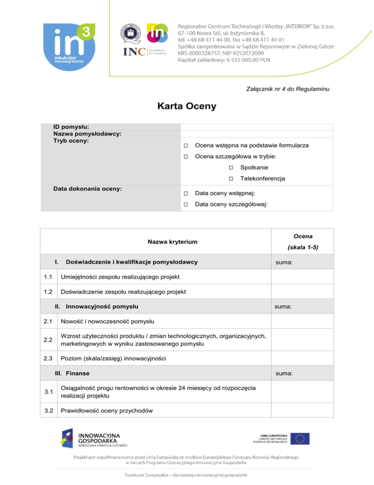 Załącznik nr 4 do Regulaminu Karta Oceny ID pomysłu: Nazwa pomysłodawcy: Tryb oceny: Data dokonania oceny: Ocena wstępna na podstawie formularza Ocena szczegółowa w trybie: Spotkanie Telekonferencja Data oceny wstępnej: Data oceny szczegółowej: Ocena Nazwa kryterium (skala 1-5) I. Doświadczenie i kwalifikacje pomysłodawcy 1.1 Umiejętności zespołu realizującego projekt 1.2 Doświadczenie zespołu realizującego projekt II. Innowacyjność pomysłu 2.1 Nowość i nowoczesność pomysłu 2.2 Wzrost użyteczności produktu / zmian technologicznych, organizacyjnych, marketingowych w wyniku zastosowanego pomysłu 2.3 Poziom (skala/zasięg) innowacyjności III. Finanse 3.1 Osiągalność progu rentowności w okresie 24 miesięcy od rozpoczęcia realizacji projektu 3.2 Prawidłowość oceny przychodów suma: suma: suma: 3.3 Prawidłowość oceny kosztów 3.4 Możliwość osiągnięcia założeń wstępnego biznesplanu i prognoz 3.5 Udział własnego wkładu pomysłodawcy w postaci aktywów (nieruchomość, środki trwałe), w wartości całości projektu 3.6 Udział własnego wkładu pieniężnego pomysłodawcy w wartości całości projektu IV. Marketing 4.1 Skala popytu na usługę 4.2 Możliwość dotarcia do grupy docelowej 4.3 Zagrożenia rynkowe 4.4 Strategia marketingowa 4.5 Bariery wejścia na rynek 4.6 Przewaga konkurencyjna suma: V. Założenia operacyjne suma: 5.1 Potencjał rynkowy pomysłu, prawdopodobieństwo sukcesu biznesowego 5.2 Ekonomiczna zasadność komercjalizacji inwestycji, atrakcyjność modelu biznesowego VI. Założenia strategiczne 6.1 suma: Możliwość wyjścia z inwestycji przez inwestora Suma punktów Maksymalna ilość punktów Ilość zdobytych punktów 2 100 pkt. pkt. Podpis osoby oceniającej Imię i nazwisko: Członek Komitetu Oceniającego: Koordynator projektu Specjalista ds. inwestycyjnych Specjalista ds. technicznych ....................................................................................................... czytelny podpis Data, miejscowość: 3