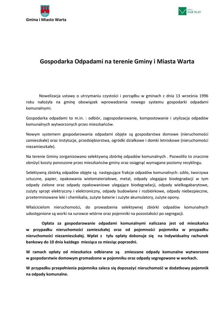 Gospodarka Odpadami na terenie Gminy i Miasta Warta