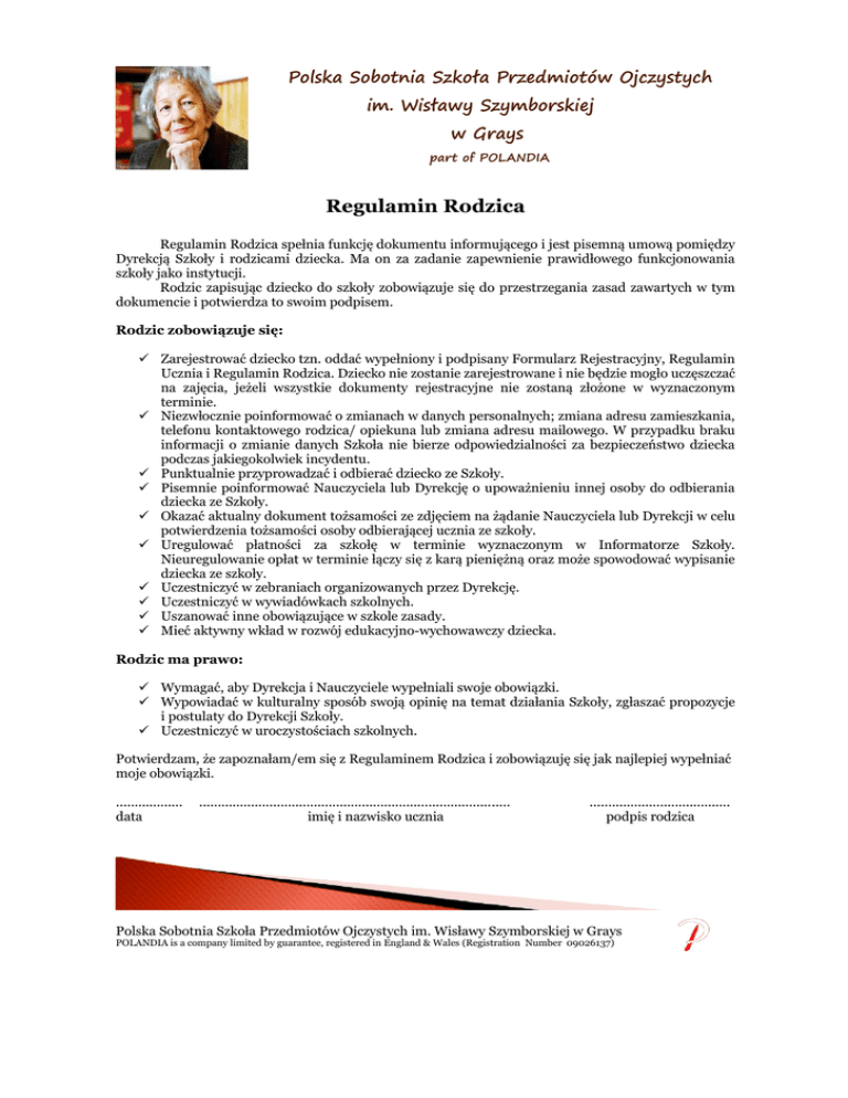 Polska Sobotnia Szkoła Przedmiotów Ojczystych im. Wisławy Szymborskiej w Grays part of POLANDIA Regulamin Rodzica Regulamin Rodzica spełnia funkcję dokumentu informującego i jest pisemną umową pomiędzy Dyrekcją Szkoły i rodzicami dziecka. Ma on za zadanie zapewnienie prawidłowego funkcjonowania szkoły jako instytucji. Rodzic zapisując dziecko do szkoły zobowiązuje się do przestrzegania zasad zawartych w tym dokumencie i potwierdza to swoim podpisem. Rodzic zobowiązuje się: Zarejestrować dziecko tzn. oddać wypełniony i podpisany Formularz Rejestracyjny, Regulamin Ucznia i Regulamin Rodzica. Dziecko nie zostanie zarejestrowane i nie będzie mogło uczęszczać na zajęcia, jeżeli wszystkie dokumenty rejestracyjne nie zostaną złożone w wyznaczonym terminie. Niezwłocznie poinformować o zmianach w danych personalnych; zmiana adresu zamieszkania, telefonu kontaktowego rodzica/ opiekuna lub zmiana adresu mailowego. W przypadku braku informacji o zmianie danych Szkoła nie bierze odpowiedzialności za bezpieczeństwo dziecka podczas jakiegokolwiek incydentu. Punktualnie przyprowadzać i odbierać dziecko ze Szkoły. Pisemnie poinformować Nauczyciela lub Dyrekcję o upoważnieniu innej osoby do odbierania dziecka ze Szkoły. Okazać aktualny dokument tożsamości ze zdjęciem na żądanie Nauczyciela lub Dyrekcji w celu potwierdzenia tożsamości osoby odbierającej ucznia ze szkoły. Uregulować płatności za szkołę w terminie wyznaczonym w Informatorze Szkoły. Nieuregulowanie opłat w terminie łączy się z karą pieniężną oraz może spowodować wypisanie dziecka ze szkoły. Uczestniczyć w zebraniach organizowanych przez Dyrekcję. Uczestniczyć w wywiadówkach szkolnych. Uszanować inne obowiązujące w szkole zasady. Mieć aktywny wkład w rozwój edukacyjno-wychowawczy dziecka. Rodzic ma prawo: Wymagać, aby Dyrekcja i Nauczyciele wypełniali swoje obowiązki. Wypowiadać w kulturalny sposób swoją opinię na temat działania Szkoły, zgłaszać propozycje i postulaty do Dyrekcji Szkoły. Uczestniczyć w uroczystościach szkolnych. Potwierdzam, że zapoznałam/em się z Regulaminem Rodzica i zobowiązuję się jak najlepiej wypełniać moje obowiązki. .................. data .................................................................................... imię i nazwisko ucznia ...................................... podpis rodzica Polska Sobotnia Szkoła Przedmiotów Ojczystych im. Wisławy Szymborskiej w Grays POLANDIA is a company limited by guarantee, registered in England & Wales (Registration Number 09026137)