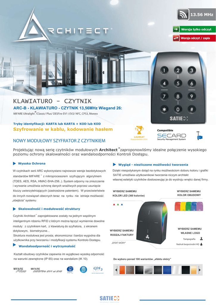 13.56 MHz ® Wersja tylko odczyt Wersja odczyt / zapis KLAWIATURO - CZYTNIK ARC-B - KLAWIATURO - CZYTNIK 13,56MHz Wiegand 26: MIFARE Ultralight®/Classic/ Plus/ DESFire EV1 i EV2/ NFC, CPS3, Moneo Tryby identyfikacji: KARTA lub KARTA + KOD lub KOD Szyfrowanie w kablu, kodowanie hasłem Compatible LAUREAT NOWY MODUŁOWY SZYFRATOR Z CZYTNIKIEM Expoprotection 2014 Security Management System Projektując nową serię czytników modułowych Architect ®zaproponowliśmy idealne połączenie wysokiego poziomu ochrony skalowalności oraz wandaloodporności Kontroli Dostępu. Wysoka Ochrona Wygląd - niezliczone możliwości tworzenia W czytnikach serii ARC wykorzystano najnowsze wersje bezdotykowych Dzięki niespotykanym dotąd na rynku możliwościom doboru koloru i grafiki standardów MIFARE ® z mikroprocesorem szyfrującym algorytmem (TDES, AES, RSA, HMAC-SHA-256..). System odporny na zniszczenie SATIE umożliwia użytkownikowi tworzenie niczym archtekt własnej estetyki czytników dostosowując je do wystroju wnętrz danej firmy. i wyrwanie umożliwia ochronę danych wrażliwych poprzez usunięcie kluczy uwierzytelniających (zastrzeżone patentem). W przeciwieństwie WYBIERZ SAMEMU do innych rozwiązań obecnych teraz na rynku nie istnieje możliwość KOLOR LED (360 kolorów) WYBIERZ SAMEMU KOLOR OBUDOWY „obejścia” systemu Skalowalność i modułowość struktury Czytniki Architect ® zaprojektowane zostały na jednym wspólnym inteligentnym rdzeniu RFID z którym można łączyć wymiennie dowolne moduły: z czytnikiem kart, z klawiaturą do szyfratora, z ekranem dotykowym, biometryczne... WYBIERZ SAMEMU Struktura modułowa jest prosta, ekonomiczna i bardzo wygodna dla RODZAJ FAKTURY użytkownika przy tworzeniu i modyfikacji systemu Kontrolo Dostępu. „EFEKT SKÓRY” Wandaloodporność i wytrzymalość Kształt obudowy czytników zapewnia im wyjątkowo wysoką odporność na warunki zewnętrzne (IP 65) oraz na wandalizm (IK 10). Do wyboru ponad 100 wariantów „efektu skóry” WYBIERZ SAMEMU WŁASNE LOGO Nadruk bezpośredni HQ ARC-B KLAWIATURO-CZYTNIK 13,56MHz aRC-a - Lecteur haute sécurité MIFARE Classic EV1, MIFARE MIFARE ® Classic EV1, MIFARE Plus Plus, DESFire EV1 i EV2, NFC ® , DESFire ® EV1 & EV2, NFC Dane techniczne Częstotliwości / Normy 13.56 MHz. ISO14443 typu A i B, ISO18092 (NFC) Kompatybilny ze standardami MIFARE Ultralight,® MIFARE Ultralight C,® MIFARE Classic & Classic EV1, MIFARE Plus,® MIFARE DESFire ® EV1 & EV2, NFC, SMART MX, CPS3, Moneo, iCLASS,® PicoPass ® Tryb Sam odczyt CSN, z zabezpieczeniem (plik, sektor) i z protokołem zabezpieczonym (Secure Plus) Sam zapis (SSCP et SSCP2) Odległość odczytu* Do 8 cm z kartą MIFARE Classic ® Do 6 cm z kartą MIFARE Plus ® / DESFire Interfejsy komunikacji 2 warianty : - TTL/RS232 : Data Clock (ISO2), Wiegand (z szyfrow. - S31) lub RS232 (z szyfrow. - S32) - TTL/RS485 : Data Clock (ISO2), Wiegand (z szyfrow. - S31) lub RS485 (z szyfrow. - S33) Sposób podłączenia Zaciski rozłączne 10 (5mm) Zaciski rozłączne 2 (5mm) : styki O/C - Wskaźnik wyrwania Wbudowany chip UHF EPC 1 Gen 2 dla ustawienia czytnika (ustawienie parametrów : protokół, LED, buczek…) Wskaźniki wizualne 2 LEDs RVB - 360 kolorów Ustawienie za pomocą karty UHF, soft i sterowanie z zewnątrz (0V) w R3x/S3x poprzez soft w W32/W33 Wskaźniki dźwiękowe Wbudowany buczek Ustawienie za pomocą karty UHF, soft i sterowanie z zewnątrz (0V) w R3x/S3x poprzez soft w W32/W33 Pobór prądu / Tryb „eko” 280 mA/12 VDC. Zasilanie 7 VDC do 28 VDC ® EV1 Wykonanie ABS-PC UL-V0 (czarne) / ASA-PC-UL-V0 UV (białe) Wymiary (h x l x p) 107 x 80 x 26 mm(sam moduł biometryczny) Temperatura pracy - 20°C do + 70°C / Wilgotność : 0 - 95% Sygnalizacja wyrwania Akcelerometryczna detekcja wyrwania z jednoczesnym usunięciem kluczy Stopień ochrony IP65 poza stykami/ struktura wandaloodporna IK10 Sposób mocowania Natynkowy/na puszce elektrycznej (odl. między osiami 60 i 62 mm) Na każdym wsporniku także metalowym bez konieczności dystansowania. Certyfikaty CE i FCC Klawiatura Dotykowa 12 przycisków podświtlanych z aktywacją kartą lub softem Stopień ochrony IP65 poza stykami/ struktura wandaloodporna specjalnie wzmocniona IK 10 Tryb identyfikacji karta lub karta + kod lub kod Sposób komunikacji Wiegand 26, wbudowany czytnik zbliżeniowy, szyfrowana komunikacja z innymi czytnikami. RDZEŃ RFID Klawiaturo - czytnik Czytnik z ekranem Klawiaturo - czytnik Biometryczny Czytnik z ekranem Biometryczny Czytnik Czytnik Biometryczny STRUKTURA MODUŁOWA 6 możliwości tworzenia 1 wspólny rdzeń, 3 wymiennych płyt czołowych, 1 moduł biometryczny SATIE , 02-820 Warszawa, ul. Łączyny 3, tel. 22 462 30 86, fax: 22 314 69 50; mob: 509 849 791 www.satie.pl, [email protected]