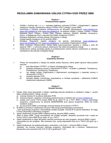 REGULAMIN ZAMAWIANIA USŁUGI CYFRA+VOD PRZEZ SMS Artykuł 1 Postanowienia ogólne 1. 2. 3. 4. 5. 6. 7. CANAL+ Cyfrowy Sp. z o. o. – operator platformy cyfrowej CYFRA+, („Organizator”), ogłasza niniejszym zasady zamawiania usługi CYFRA+VOD („Usługa”) przez SMS. Informacja o Usłudze zostanie zamieszczona na stronach internetowych www.cyfraplus.pl, www.vod.cyfraplus.pl oraz www.ica.cyfraplus.pl, na antenie CANAL+ Polska, CANAL+ Polska Niebieski Sport, CANAL+ Polska Żółty, Planete, AleKino!, ZIGZAP, MiniMini, Kuchnia.tv, Domo, w Magazynie Plus+ (styczeń-luty 2009), biuletynie CYFRY+. Niniejszy Regulamin określa zasady korzystania z Usługi. Usługa będzie dostępna od 22 grudnia 2008 r. Niniejszy Regulamin będzie dostępny na stronie internetowej www.cyfraplus.pl, www.vod.cyfraplus.pl oraz www.ica.cyfraplus.pl i w siedzibie Organizatora Usługi. Dane osobowe Użytkowników Usługi będą wykorzystywane zgodnie z ustawą z dnia 29 sierpnia 1997 r. o ochronie danych osobowych dla celów prowadzenia Usługi. Użytkownicy Usługi wyrażają zgodę na przetwarzanie swoich danych osobowych w zakresie niezbędnym dla potrzeb niniejszej Usługi. Artykuł 2 Uczestnicy Serwisu 1. Prawo do korzystania z Usługi ma każda osoba fizyczna, która spełni łącznie niżej podane warunki: a) jest Abonentem CYFRY+ w trakcie udostępniania Usługi b) posiada podpisaną umowę o abonament CYFRY+ na jeden z pakietów: Tematyczny, Podstawowy, Komfortowy, Prestiżowy c) nie zalega wobec Organizatora z płatnościami wynikającymi z zawartej umowy o abonament CYFRY+ d) posiada dekoder PVR e) posiada telefon komórkowy wyposażony w funkcje wysyłania i odbierania krótkich wiadomości tekstowych (SMS). Artykuł 3 Zasady Serwisu 1. Osoby, które chcą skorzystać z Usługi i spełniają warunki określone w artykule 2 ustęp 1, zwane dalej „Użytkownikami” Usługi, muszą: a) wcisnąć klawisz B na pilocie dekodera PVR b) wybrać program, zgodnie z instrukcją zamieszczoną w Usłudze lub na www.cyfraplus.pl; c) wysłać pod numer 70012 (koszt SMS 50 gr netto/ 61 gr z VAT) SMS z kodem wybranego programu, umieszczony na ekranie ZAMÓWIENIE przy danym programie. SMS nie może zawierać spacji d) po otrzymaniu SMS-a zwrotnego wcisnąć klawisz B na pilocie CYFRY+. 2. W SMS-ie zwrotnym Użytkownik otrzyma informację potwierdzającą zamówienie: „Tytul wybranego programu. Zamowienie zostalo przyjete. Wcisnij B na pilocie dekodera. W ciagu 5 minut otrzymasz zamowiony program.” 3. Jeżeli Użytkownik przyśle SMS z błędną treścią, otrzyma SMS o treści: „Blad w tresci SMS. Twoje zamowienie nie zostalo przyjete. Sprawdz ponownie kod i wyslij na numer 70012 (cena SMS 50 gr netto, 61 gr z VAT).” 4. Jeżeli Użytkownik w ciagu 48 godzin zamówi ponownie ten sam program, otrzyma SMS o treści: „Zamowiles juz ten program. Aby zamowic inny, wyslij odpowiedni kod na nr 70012 (50 gr/61 gr z VAT).” 5. Jeżeli Użytkownik nie spełnia jednego z warunków z art.2 pkt 1, otrzyma SMS o treści: „Niestety, nie mozesz zamowic zadnego programu. Skontaktuj sie z Centrum Telefonicznym Abonentow pod numerem 022 310 47 00 w godzinach 7-22.” 6. Jeżeli Użytkownik zamówi program, który nie jest dostępny w katalogu programów zamieszczonym w Usłudze, otrzyma SMS o treści: „Wybranego przez Ciebie programu nie ma w aktualnej ofercie. Wybierz inny program i wyslij SMS z odpowiednim kodem na nr 70012 (50 gr/61 gr z VAT).” 7. Zamówiony program będzie udostępniony Użytkownikowi na 48 godzin od momentu przyjęcia przez Organizatora Usługi zamówienia. 8. Jeżeli dekoder po wysłaniu SMS-a z zamówieniem będzie wyłączony lub będzie przełączony na inny, niż z którego zostało wysłane zamówienie, kanał, program nie zostanie udostępniony. 9. Usługa jest dostępna tylko na dekoderze, na którym został wygenerowany kod. 10. Organizator Usługi nie ponosi odpowiedzialności za niedotrzymanie określonych w niniejszym Regulaminie terminów udostępniania programów, jeżeli niedotrzymanie tych terminów było rezultatem siły wyższej, rozumianej jako zdarzenie o charakterze nadzwyczajnym, niezależnym od woli Organizatora, nieprzewidywalnym i niemożliwym do zapobieżenia przy zachowaniu należytej staranności. 11. Organizator Usługi nie ponosi odpowiedzialności za nieprawidłowości leżące po stronie operatorów sieci telekomunikacyjnych. 12. Koszt każdego SMS-a wysłanego na numer 70012 wynosi 50 gr netto/61 gr z VAT. 13. Ponowne wysłanie tego samego kodu spowoduje ponowne pobranie opłaty zgodnie z pkt. 12. Artykuł 5 Reklamacje 1. Reklamacje dotyczące spraw związanych z Regulaminem należy składać do Organizatora Usługi w terminie 7 dni od daty zaistnienia przyczyny reklamacji, bezpośrednio do siedziby Organizatora Usługi lub listem poleconym na adres: CANAL+ Cyfrowy Sp. z o.o., al. gen. W. Sikorskiego 9, 02758 Warszawa (w tym przypadku decyduje data stempla pocztowego). 2. Reklamacje przesłane po upływie powyższego terminu nie będą rozpatrywane. 3. Opisane wyżej reklamacje rozpatrywane będą przez Organizatora Usługi w terminie 14 dni od daty ich otrzymania. 4. Decyzja Organizatora Usługi w sprawie reklamacji będzie ostateczna (od decyzji Organizatora Serwisu w sprawie reklamacji nie przysługuje możliwość odwołania). Warszawa, dnia 22.12.2008 r.