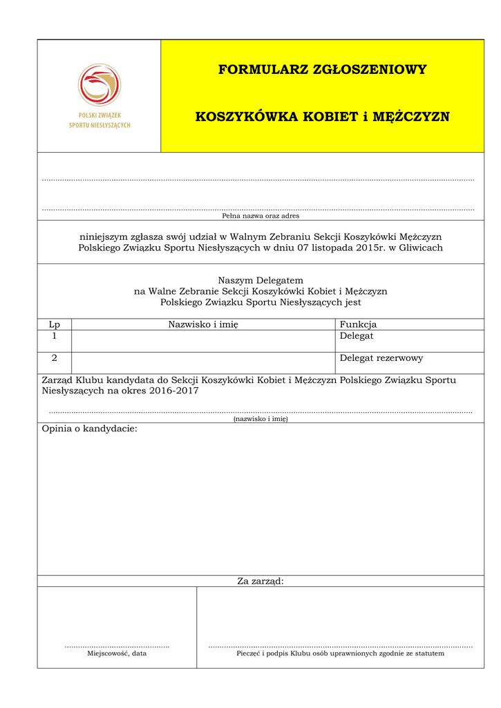 FORMULARZ ZGŁOSZENIOWY KOSZYKÓWKA KOBIET i MĘŻCZYZN …………………………………………………………………………………………………………………………………………………………………………. …………………………………………………………………………………………………………………………………………………………………………. Pełna nazwa oraz adres niniejszym zgłasza swój udział w Walnym Zebraniu Sekcji Koszykówki Mężczyzn Polskiego Związku Sportu Niesłyszących w dniu 07 listopada 2015r. w Gliwicach Naszym Delegatem na Walne Zebranie Sekcji Koszykówki Kobiet i Mężczyzn Polskiego Związku Sportu Niesłyszących jest Lp 1 Nazwisko i imię 2 Funkcja Delegat Delegat rezerwowy Zarząd Klubu kandydata do Sekcji Koszykówki Kobiet i Mężczyzn Polskiego Związku Sportu Niesłyszących na okres 2016-2017 ……………………………………………………………………………………………………………………………………………………………………… (nazwisko i imię) Opinia o kandydacie: Za zarząd: ……………………………………….. Miejscowość, data ………………………………………………………………………………………………………. Pieczęć i podpis Klubu osób uprawnionych zgodnie ze statutem