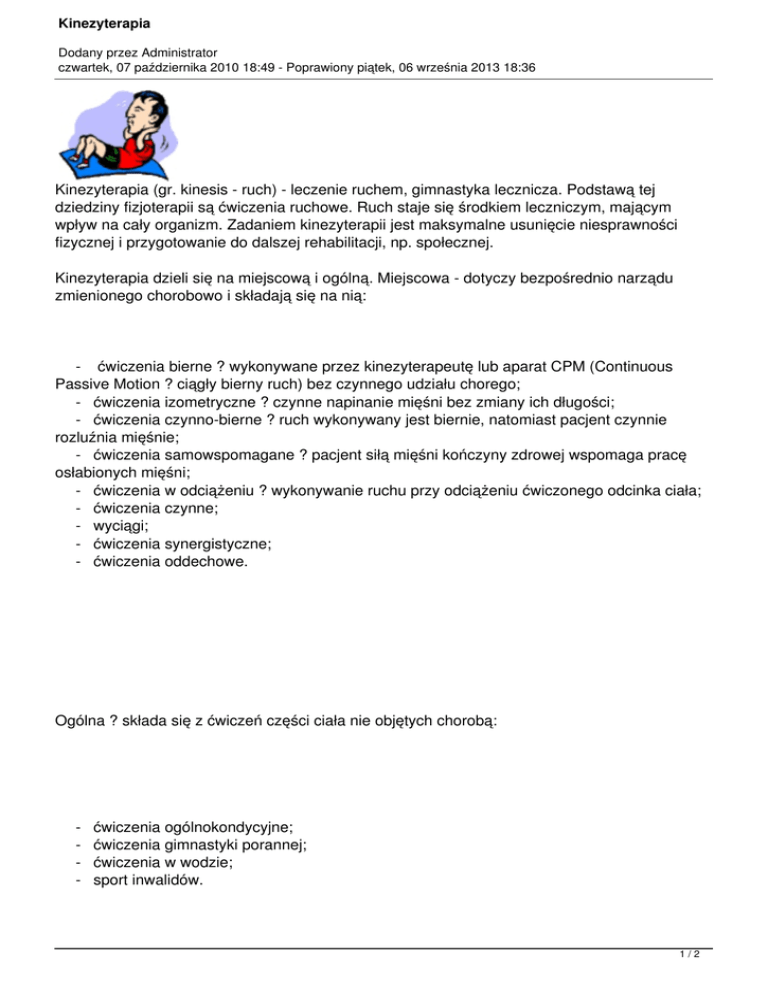 Kinezyterapia Dodany przez Administrator czwartek, 07 października 2010 18:49 - Poprawiony piątek, 06 września 2013 18:36 Kinezyterapia (gr. kinesis - ruch) - leczenie ruchem, gimnastyka lecznicza. Podstawą tej dziedziny fizjoterapii są ćwiczenia ruchowe. Ruch staje się środkiem leczniczym, mającym wpływ na cały organizm. Zadaniem kinezyterapii jest maksymalne usunięcie niesprawności fizycznej i przygotowanie do dalszej rehabilitacji, np. społecznej. Kinezyterapia dzieli się na miejscową i ogólną. Miejscowa - dotyczy bezpośrednio narządu zmienionego chorobowo i składają się na nią: - ćwiczenia bierne ? wykonywane przez kinezyterapeutę lub aparat CPM (Continuous Passive Motion ? ciągły bierny ruch) bez czynnego udziału chorego; - ćwiczenia izometryczne ? czynne napinanie mięśni bez zmiany ich długości; - ćwiczenia czynno-bierne ? ruch wykonywany jest biernie, natomiast pacjent czynnie rozluźnia mięśnie; - ćwiczenia samowspomagane ? pacjent siłą mięśni kończyny zdrowej wspomaga pracę osłabionych mięśni; - ćwiczenia w odciążeniu ? wykonywanie ruchu przy odciążeniu ćwiczonego odcinka ciała; - ćwiczenia czynne; - wyciągi; - ćwiczenia synergistyczne; - ćwiczenia oddechowe. Ogólna ? składa się z ćwiczeń części ciała nie objętych chorobą: - ćwiczenia ogólnokondycyjne; ćwiczenia gimnastyki porannej; ćwiczenia w wodzie; sport inwalidów. 1/2 Kinezyterapia Dodany przez Administrator czwartek, 07 października 2010 18:49 - Poprawiony piątek, 06 września 2013 18:36 Kinezyterapia stosowana jest w schorzeniach i dysfunkcjach narządu ruchu, w zespołach bólowych kręgosłupa, po zabiegach operacyjnych, po udarach mózgu, po zawale serca, a także w okresie ciąży jako przygotowanie do porodu. 2/2