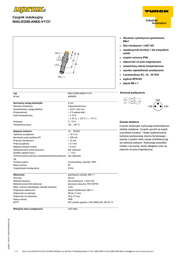 Czujnik indukcyjny NI4U-EG08-AN6X-V1131 ■ Obudowa cylindryczna gwintowana M8x1 ■ Stal nierdzewna 1.4427 SO ■ współczynnik korekcji 1 dla wszystkich metali ■ stopień ochrony IP68 ■ odporność na pola magnetyczne ■ rozszerzony zakres temperaturowy ■ wysoka częstotliwość przełączania ■ 3-przewodowy DC, 10…30 VDC ■ wyjście NPN NO ■ złącze M8 x 1 Typ Nr kat. NI4U-EG08-AN6X-V1131 4600630 Nominalny zasięg detekcjiSn Warunki montażowe Gwarantowany zasięg detekcji Powtarzalność Dryft temperaturowy 4 mm niepowierzchniowy ð (0,81 x Sn) mm ð 2 % pełnej skali ð ± 10 % ð ± 15 %, ð -25 °C v ï +70 °C 3…15 % -30…+85 °C Histereza Temperatura pracy Napięcie zasilania Tętnienia szczątkowe Nominalny prąd zasilania DC Prąd bez obciążenia I0 Prąd szczątkowy Napięcie testowe izolacji Zabezpieczenie przed zwarciem Spadek napięcia przy Ie Ochrona przed przerwą w obwodzie/odwrotną polaryzacją Funkcja wyjścia Klasa ochrony Częstotliwość przełączania 10… 30VDC ð 10 % Uss ð 150 mA ð 15 mA ð 0.1 mA ð 0.5 kV tak/ cykliczne ð 1.8 V tak/ całkowita Wykonanie Wymiary Materiał obudowy Materiał powierzchni aktywnej Maks. moment dokręcający nakrętki obudowy Połączenie elektryczne Odporność na wibracje Odporność na uderzenia Klasa ochrony MTTF gwintowany cylinder, M8 x 1 49 mm stal nierdzewna, 1.4427 SO tworzywo sztuczne, PA12-GF30 5 Nm złącze kołnierzowe, M8 x 1 55 Hz (1 mm) 30 g (11 ms) IP68 874 rok/lata zgodnie z SN 29500 (Ed. 99) 40 °C Wskaźnik stanu przełączenia LED żółta Schemat podłączenia Zasada działania Czujniki indukcyjne wykrywają bezkontaktowo obiekty metalowe. Czujniki uprox® ze współczynnikiem korekcji 1 dzięki opatentowanej budowie pozbawionej rdzenia ferrytowego i opartej o system wielu cewek charakteryzują się wieloma zaletami. Wykrywają wszystkie metale z tej samej, dużej odległości oraz są odporne na pola magnetyczne. Edition • 2016-11-09T18:46:38+01:00 3-przewodowy, styk NO, NPN ÷ 2 kHz 1/3 Hans Turck GmbH & Co.KG ñ D-45472 Mülheim an der Ruhr ñ Witzlebenstraße 7 ñ Tel. 0208 4952-0 ñ Fax 0208 4952-264 ñ [email protected] ñ www.turck.com Czujnik indukcyjny NI4U-EG08-AN6X-V1131 32 mm Dystans W 12 mm Dystans T 32 mm Dystans S 12 mm Dystans G 24 mm Dystans N 8 mm Średnica powierzchni aktywnej B Ø 8 mm Edition • 2016-11-09T18:46:38+01:00 Dystans D 2/3 Hans Turck GmbH & Co.KG ñ D-45472 Mülheim an der Ruhr ñ Witzlebenstraße 7 ñ Tel. 0208 4952-0 ñ Fax 0208 4952-264 ñ [email protected] ñ www.turck.com Czujnik indukcyjny NI4U-EG08-AN6X-V1131 Akcesoria montażowe Typ Nr kat. BST-08B 6947210 Rysunek wymiarowy Klamra montażowa z blokadą dla obudów cylindrycznych, gwintowanych; materiał: PA6 MW-08 6945008 Uchwyt montażowy dla obudów cylindrycznych, gwintowanych; materiał: Stal nierdzewna A2 1.4301 (AISI 304) BSS-08 6901322 Uchwyt montażowy dla obudów cylindrycznych, gładkich i gwintowanych; materiał: Polipropylen MBS80 69479 Uchwyt montażowy dla obudów cylindrycznych, gwintowanych; materiał bloku montażowego: Anodyzowane aluminium Akcesoria - okablowanie Typ Nr kat. PKGV3M-2/TEL 6625385 Rysunek wymiarowy Przewód podłączeniowy, złącze żeńskie M8, proste, 3-pinowe, nakrętka ze stali nierdzewnej, długość: 2 m; materiał otuliny: PVC, czarny; certyfikat cULus; dostępne również inne Edition • 2016-11-09T18:46:38+01:00 długości kabli i typy otuliny, patrz www.turck.com 3/3 Hans Turck GmbH & Co.KG ñ D-45472 Mülheim an der Ruhr ñ Witzlebenstraße 7 ñ Tel. 0208 4952-0 ñ Fax 0208 4952-264 ñ [email protected] ñ www.turck.com