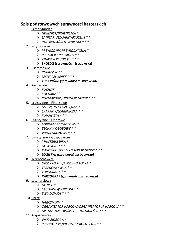 Spis podstawowych sprawności harcerskich: 1. Samarytańskie HIGIENIST/HIGIENISTKA * SANITARIUSZ/SANITARIUSZKA * * RATOWNIK/RATOWNICZKA * * * 2. Przyrodnicze PRZYRODNIK/PRZYRODNICZKA * PRZYJACIEL PRZYRODY * * ZNAWCA PRZYRODY * * * EKOLOG (sprawność mistrzowska) 3. Puszczańskie ROBINSON * * LEŚNY CZŁOWIEK * * * TRZY PIÓRA (sprawność mistrzowska) 4. Kucharskie KUCHCIK * KUCHARZ * * KUCHMISTRZ / KUCHMISTRZYNI * * * 5. Logistyczne – Finansowe OSZCZĘDNY/OSZCZĘDNA * SKARBNIK/SKARBNICZKA * * FINANSISTA * * * 6. Logistyczne – Obozowe SOBIERADEK OBOZOWY * TECHNIK OBOZOWY * * WYGA OBOZOWY * * * 7. Logistyczne – Gospodarcze MAJSTERKLEPKA * GOSPODARZ * * KWATERMISTRZ/KWATERMISTRZYNI * * * LOGISTYK (sprawność mistrzowska) 8. Terenoznawcze OBSERWATOR/OBSERWATORKA * TERENOZNAWCA * * TOPOGRAF * * * KARTOGRAF (sprawność mistrzowska) 9. Łącznościowe GONIEC * ŁĄCZNIK/ŁĄCZNICZKA * * ZWIADOWCA * * * 10. Harce HARCOWNIK * ORGANIZATOR HARCÓW/ORGANIZATORKA HARCÓW * * MISTRZ HARCÓW/MISTRZYNI HARCÓW * * * 11. Krajoznawcze WSKAZIDROGA * PRZEWODNIK/PRZEWODNICZKA PO... * * KRAJOZNAWCA * * * 12. Turystyczne ŁAZIK * TRAMP * * WĘDROWIEC * * * 13. Językowe JĘZYKOZNAWCA * TŁUMACZ/TŁUMACZKA * * POLIGLOTA/POLIGLOTKA * * * 14. Naukowe SZPERACZ * POSZUKIWACZ * * BADACZ/BADACZKA * * * 15. Sportowe SPORTOWIEC * … [NAZWA DYSCYPLINY] np. PIŁKARZ, NARCIARZ * * OLIMPIJCZYK * * * Pływackie MŁODY PŁYWAK/MŁODA PŁYWACZKA * PŁYWAK/PŁYWACZKA * * PŁYWAK DOSKONAŁY/PŁYWACZKA DOSKONAŁA * * * 16. Artystyczne Wokalne ŚPIEWAK/ŚPIEWACZKA * PIEŚNIARZ/PIEŚNIARKA * * WODZIREJ/WODZIREJKA * * * Instrumentalne GRAJEK * * MUZYK/MUZYCZKA * * * ARTYSTA/ARTYSTKA (sprawność mistrzowska) 17. Społeczne MŁODY OBYWATEL MŁODA OBYWATELKA * OBYWATEL OBYWATELKA * * OBYWATEL RZECZYPOSPOLITEJ OBYWATELKA RZECZYPOSPOLITEJ * * * 18. Komputerowe KOMPUTEROWIEC * ZNAWCA KOMPUTERÓW ZNAWCZYNI KOMPUTERÓW * * INFORMATYK * * * Spis dodatkowych sprawności harcerskich- wspierające program ZHP BARWY PRZYSZŁOŚCI ZNAWCZYNI WŁASNEJ MIEJSCOWOŚCI/ZNAWCA WŁASNEJ MIEJSCOWOŚCI * * PRZEWODNICZKA PO REGIONIE/PRZEWODNIK PO REGIONIE ** ZNAWCZYNI REGIONU/ZNAWCA REGIONU *** ETNOGRAFKA/ETNOGRAF *** MŁODA EUROPEJKA/MŁODY EUROPEJCZYK * EUROPEJKA/ EUROPEJCZYK ** OBYWATELKA EUROPY/OBYWATEL EUROPY *** ZNAWCZYNI EUROPY/ZNAWCA EUROPY (sprawność mistrzowska) ZNAWCZYNI PRAW CZŁOWIEKA/ZNAWCA PRAW CZŁOWIEKA ** OBROŃCA PRAW CZŁOWIEKA *** MŁODY WYBORCA *** WYBORCA (SPRAWNOŚĆ MISTRZOWSKA) NEGOCJATORKA/NEGOCJATOR *** ORGANIZATORKA NAUKI/ORGANIZATOR NAUKI * ORGANIZATORKA CZASU/ORGANIZATOR CZASU ** PLANISTA *** STARSZA SIOSTRA/STARSZY BRAT * PIASTUNKA/PIASTUN ** POMOCNA DŁOŃ * UCZYNNA/UCZYNNY ** DOMOWNICZKA/DOMOWNIK * GOSPODYNI/GOSPODARZ ** PANI DOMU/PAN DOMU *** OPIEKUN CHORYCH/OPIEKUNKA CHORYCH ** HISTORYK RODZINNY ** BANKIER * BANKOWIEC ** ZNAWCZYNI BANKOWOŚCI/ZNAWCA BANKOWOŚCI *** MŁODY PRACOWNIK *** PRZEWODNICZKA PO RYNKU PRACY/PRZEWODNIK PO RYNKU PRACY (sprawność mistrzowska) MAKLER *** MAKLER (sprawność mistrzowska) Spis dodatkowych sprawności harcerskich- wyrobienie harcerskie ZNAWCZYNI OBRZĘDÓW I ZWYCZAJÓW DRUŻYNY/ZNAWCA OBRZĘDÓW I ZWYCZAJÓW DRUŻYNY * ZNAWCA ZWYCZAJÓW I TRADYCJI HARCERSTWA ** BI-PI * LILIA I KONICZYNA ** ZNAWCZYNI SKAUTINGU/ZNAWCA SKAUTINGU *** RZECZNICZKA DRUŻYNY/RZECZNIK DRUŻYNY *** RZECZNIK HARCERSTWA (sprawność mistrzowska) ZNAWCZYNI MUSZTRY/ZNAWCA MUSZTRY ** MISTRZYNI MUSZTRY /MISTRZ MUSZTRY *** WARTOWNICZKA/WARTOWNIK ** DOWÓDCA WARTY *** OGNIK * STRAŻNICZKA OGNIA/STRAŻNIK OGNIA ** MISTRZYNI OGNISK/MISTRZ OGNISK *** Spis dodatkowych sprawności harcerskich- wspierające wychowanie duchowe i religijne BETLEJEMSKIE ŚWIATŁO POKOJU* OPIEKUNKA BETLEJEMSKIEGO ŚWIATŁA POKOJU/OPIEKUN BETLEJEMSKIEGO ŚWIATŁA POKOJU** STRAŻNICZKA BETLEJEMSKIEGO ŚWIATŁA POKOJU/STRAŻNIK BETLEJEMSKIEGO ŚWIATŁA POKOJU*** PRZEWODNIK DUCHOWY *** MŁODY PIELGRZYM ** PIELGRZYM *** PRZYJACIEL LITURGII(DO WYBORU: KATOLICKIEJ, PRAWOSŁAWNEJ, PROTESTANCKIEJ, ITD) ** ZNAWCZYNI LITURGII/ZNAWCA LITURGII (DO WYBORU: KATOLICKIEJ, PRAWOSŁAWNEJ, PROTESTANCKIEJ, ITD.) *** POCZĄTKUJĄCY RELIGIOZNAWCA ** RELIGIOZNAWCA *** MŁODY EKUMENISTA *** EKUMENISTA *** POSZUKUJĄCA WARTOŚCI/POSZUKUJĄCY WARTOŚCI ** POSZUKUJĄCY AUTORYTETU *** SZARA LILIJKA ** MĘŻNY ** CHWAT *** Spis dodatkowych sprawności harcerskich- hobby PRZYJACIEL ROŚLIN * ZIELARKA/ZIELARZ ** BOTANIK *** KWIACIARKA/KWIACIARZ * MIŁOŚNICZKA KWIATÓW/MIŁOŚNIK KWIATÓW ** LEŚNIK *** OGRODNICZKA/ OGRODNIK *** SADOWNICZKA/SADOWNIK *** PRZYJACIEL ZWIERZĄT * ZNAWCZYNI ZWIERZĄT/ZNAWCA ZWIERZĄT ** ZOOLOG *** PSZCZELARZ *** HODOWCA /GOŁĘBI, KRÓLIKÓW, RYBEK, DROBIU/ ** PRZYJACIEL KSIĄŻKI * BIBLIOTEKARKA/BIBLIOTEKARZ ** BIBLIOFIL *** KRONIKARKA/KRONIKARZ * REPORTERKA/REPORTER ** DZIENNIKARKA/DZIENNIKARZ *** WYDAWCA (sprawność mistrzowska) MIŁOŚNICZKA ARCHITEKTURY/ MIŁOŚNIK ARCHITEKTURY ** ARCHITEKT *** PLASTYCZKA/ PLASTYK * DEKORATORKA/DEKORATOR ** SCENOGRAFKA/SCENOGRAF *** RECYTATORKA/RECYTATOR * AKTORKA/AKTOR ** LALKARKA/LALKARZ ** GAWĘDZIARKA/GAWĘDZIARZ ** REŻYSER *** TANCERKA/TANCERZ * MISTRZYNI TAŃCA/MISTRZ TAŃCA ** FOTOAMATORKA/FOTOAMATOR * FOTOGRAF ** MISTRZYNI OBIEKTYWU/MISTRZ OBIEKTYWU *** GIMNASTYCZKA/GIMNASTYK * MISTRZYNI GIMNASTYKI/MISTRZ GIMNASTYKI ** LIDER ZDROWIA *** MISTRZYNI RĘCZNYCH ROBÓTEK/MISTRZ RĘCZNYCH ROBÓTEK ** IGIEŁKA * KRAWCOWA/KRAWIEC ** MISTRZYNI IGŁY/MISTRZ IGŁY *** PROJEKTANTKA MODY/PROJEKTANT MODY ** ROWERZYSTKA/ROWERZYSTA * CYKLISTA ** ZNAWCZYNI RUCHU DROGOWEGO/ZNAWCA RUCHU DROGOWEGO *** KOLEKCJONERKA/KOLEKCJONER *** STRAŻNICZKA BEZPIECZEŃSTWA/STRAŻNIK BEZPIECZEŃSTWA ** INTERNAUTKA/INTERNAUTA ** MISTRZYNI INTERNETU/MISTRZ INTERNETU *** WEBMASTER (sprawność mistrzowska) DTP-OWIEC *** GRAFIK KOMPUTEROWY (sprawność mistrzowska) PROGRAMISTKA/PROGRAMISTA .... (sprawność mistrzowska) ZNAWCA .... *** Spis dodatkowych sprawności harcerskich- sprawności drużyn specjalnościowych 1. Łączno