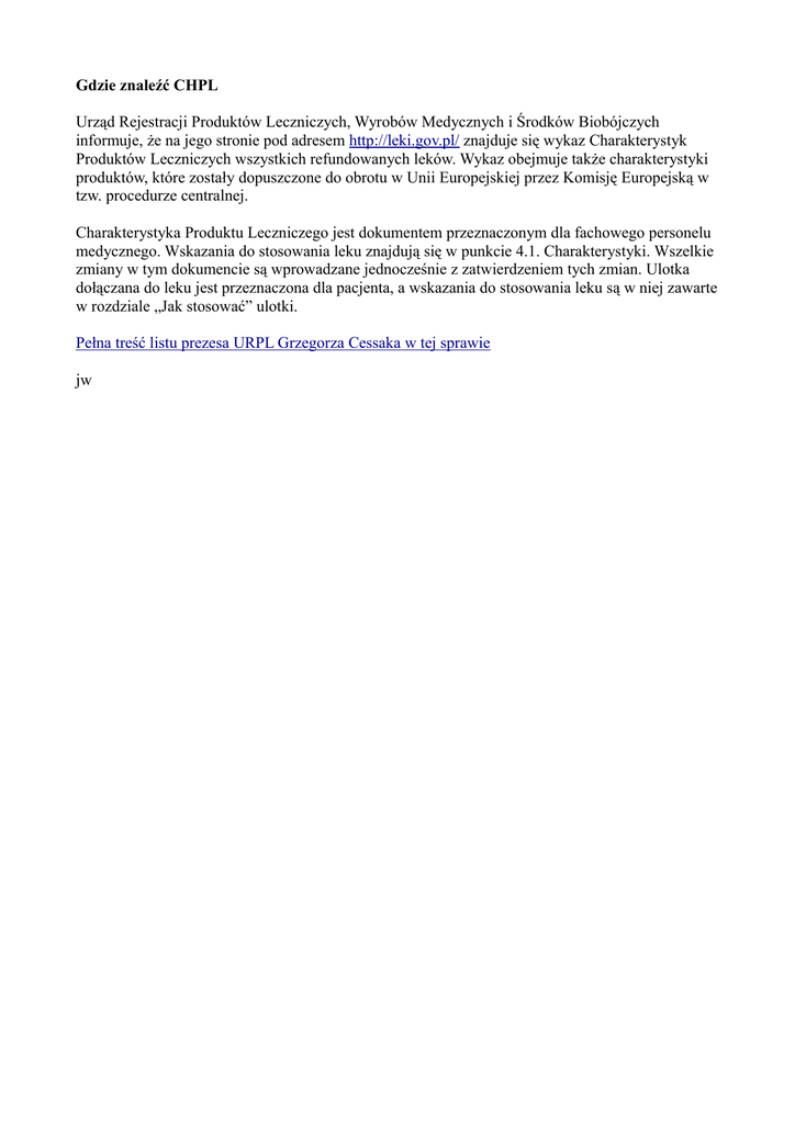 Gdzie znaleźć CHPL Urząd Rejestracji Produktów Leczniczych, Wyrobów Medycznych i Środków Biobójczych informuje, że na jego stronie pod adresem http://leki.gov.pl/ znajduje się wykaz Charakterystyk Produktów Leczniczych wszystkich refundowanych leków. Wykaz obejmuje także charakterystyki produktów, które zostały dopuszczone do obrotu w Unii Europejskiej przez Komisję Europejską w tzw. procedurze centralnej. Charakterystyka Produktu Leczniczego jest dokumentem przeznaczonym dla fachowego personelu medycznego. Wskazania do stosowania leku znajdują się w punkcie 4.1. Charakterystyki. Wszelkie zmiany w tym dokumencie są wprowadzane jednocześnie z zatwierdzeniem tych zmian. Ulotka dołączana do leku jest przeznaczona dla pacjenta, a wskazania do stosowania leku są w niej zawarte w rozdziale „Jak stosować” ulotki. Pełna treść listu prezesa URPL Grzegorza Cessaka w tej sprawie jw