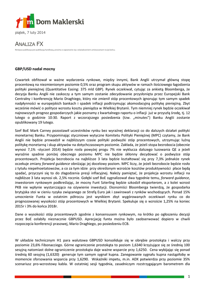 piątek, 7 luty 2014 ANALIZA FX Niniejsza publikacja jest publikacją handlową, prosimy o zapoznanie się z oświadczeniem umieszczonym na jej końcu. GBP/USD nadal mocny Czwartek obfitował w ważne wydarzenia rynkowe, między innymi, Bank Anglii utrzymał główną stopę procentową na niezmienionym poziomie 0,5% oraz program skupu aktywów w ramach ilościowego łagodzenia polityki pieniężnej (Quantitative Easing: 375 mld GBP). Rynek oczekiwał, cytując za ankietą Bloomberga, że decyzja Banku Anglii nie zaskoczy a tym samym zostanie zdecydowanie przysłonięta przez Europejski Bank Centralny i konferencję Mario Draghiego, który nie zmienił stóp procentowych ignorując tym samym spadek nadpłynności w europejskich bankach i spadek inflacji podtrzymując akomodacyjną politykę pieniężną. Zbyt wcześnie mówić o polityce wzrostu kosztu pieniądza w Wielkiej Brytanii. Tym niemniej rynek będzie oczekiwał najnowszych prognoz gospodarczych jakie poznamy z kwartalnego raportu o inflacji już w przyszłą środę, tj. 12 lutego o godzinie 10:30. Raport z wczorajszego posiedzenia (tzw. „minutes”) Banku Anglii zostanie opublikowany 19 lutego. Szef BoE Mark Carney pozostawił uczestników rynku bez wyraźnej deklaracji co do dalszych działań polityki monetarnej Banku. Przypominając styczniowe wytyczne Komitetu Polityki Pieniężnej (MPC) czytamy, że Bank Anglii nie będzie prowadził w najbliższym czasie polityki podwyżki stóp procentowych, utrzymując luźną politykę monetarną i skup aktywów na dotychczasowym poziomie. Zakłada, że jeżeli stopa bezrobocia (obecnie wynosi 7,1% -styczeń 2014) będzie rosła powyżej progu 7% nie wyklucza dalszego luzowania QE a jeżeli wyraźnie spadnie poniżej obecnego poziomu MPC nie będzie skłonny decydować o podwyżce stóp procentowych. Projekcja bezrobocia na najbliższe 3 lata będzie kształtować się przy 7,3% jednakże rynek oczekuje zmiany forward guidance obniżając jej docelowy poziom. MPC liczy, że jeżeli bezrobocie będzie rosło z tytułu niepełnoetatowców, a co za tym idzie przy określonym wzroście kosztów produktywności płace będą spadać, przyczyni się to do złagodzenia presji inflacyjnej. Należy pamiętać, że projekcja wzrostu inflacji na najbliższe 3 lata wynosi ok. 2,5% rocznie. Gołębi szef BoE sygnalizował dwa tygodnie temu, forward guidance, inwestorom rynkowym podkreślając, że mocny Funt Szterling będzie szkodził eksporterom, a z kolei wzrost PKB nie wpłynie wystarczająco na ożywienie inwestycji. Ekonomiści Bloomberga twierdzą, że gospodarka brytyjska stoi w cieniu ryzyka związanego ze Strefą Euro jak i zawirowań z rynków wschodzących. Ponad 15% umocnienie Funta w ostatnim półroczu jest wynikiem zbyt wygórowanych oczekiwań rynku co do prognozowanej wysokości stóp procentowych w Wielkiej Brytanii. Spekuluje się o wzroście 1,25% na koniec 2015r i 3% do końca 2018r. Dane o wysokości stóp procentowych zgodnie z konsensusem rynkowym, na krótko po ogłoszeniu decyzji przez BoE osłabiły nieznacznie GBPUSD. Aprecjację funta można było zaobserwować dopiero w chwili rozpoczęcia konferencji prasowej, Mario Draghiego, po posiedzeniu ECB. W układzie technicznym H1 para walutowa GBPUSD konsoliduje się w obrębie prostokąta i walczy przy poziomie 23,6% Fibonacciego. Górne ograniczenie prostokąta to poziom 1,6340 krzyżujące się ze średnią 100 sesyjną natomiast dolne ograniczenie prostokąta daje ważne wsparcie przy 1,6250. Cena wybijając się ponad średnią 60 sesyjną (1,6320) generuje tym samym sygnał kupna. Zanegowanie sygnału kupna nastąpiłoby w momencie sforsowania wsparcia przy 1,6290. Wskaźniki impetu, m.in. ADX potwierdza przy poziomie 35% scenariusz pro-wzrostowy kabla. W ostatniej sesji tygodnia, zasadniczym rozstrzygającym barometrem dla 1 GBPUSD będzie dzisiejsza reakcja na dane Non Farm Payrolls 0 14:30 (zmiana zatrudnienia w sektorze pozarolniczym w USA) i reakcji waluty kwotowanej USD. WYKRES: GBP/USD , interwał godzinowy: Anna Nagiewicz, Dom Maklerski mBanku mforex.pl [email protected] Niniejsza publikacja przygotowana przez Dom Maklerski mBanku S.A. z siedzibą w Warszawie, przy ul. Wspólnej 47/49, jest publikacją handlową, została przygotowana wyłącznie w celach informacyjnych, nie stanowi rekomendacji w rozumieniu przepisów „Rozporządzenia Ministra Finansów z dnia 19 października 2005 r. w sprawie informacji stanowiących rekomendacje dotyczące instrumentów finansowych lub ich emitentów lub wystawców (Dz. U. nr 206 z 2005 r.), nie stanowi porady inwestycyjnej, nie stanowi oferty zbycia lub nabycia wymienionych w niej instrumentów finansowych, nie stanowi podstawy do zawarcia jakiejkolwiek umowy lub powstania jakiegokolwiek zobowiązania. Informacje zawarte w niniejszej publikacji oparte są na danych uzyskanych ze źródeł, które Dom Maklerski mBanku S.A., działając w dobrej wierze, uważa za wiarygodne. Dom Maklerski mBanku S.A. nie gwarantuje jednak dokładności, kompletności ani trafności tych informacji. Dom Maklerski mBanku S.A., jego organy zarządcze, organy nadzorcze, ani pracownicy nie ponoszą odpowiedzialności za wszelkie skutki finansowe i niefinansowe powstałe w wyniku wykorzystania niniejszej publikacji lub zawartych w niej informacji. Wszelkie opinie, prognozy, kalkulacje i szacunki zawarte w niniejszej publikacji stanowią jedynie wyraz subiektywnej oceny autora na moment jej wydania i mogą być zmieniane bez uprzedzenia. Opinie wyrażone w niniejszej publikacji nie pozostają w jakiejkolwiek zależności od rekomendacji przygotowywanych przez Dom Maklerski mBanku S.A.. Dom Maklerski mBanku S.A. nie jest zobowiązany do aktualizowania ani modyfikowania niniejszej publikacji, ani do informowania jej odbiorców w przypadku, gdy jakakolwiek poruszona w niej kwestia lub zawarta w niej opinia, prognoza, kalkulacja lub szacunek ulegnie zmianie lub stanie się nieaktualne. Dom Makler