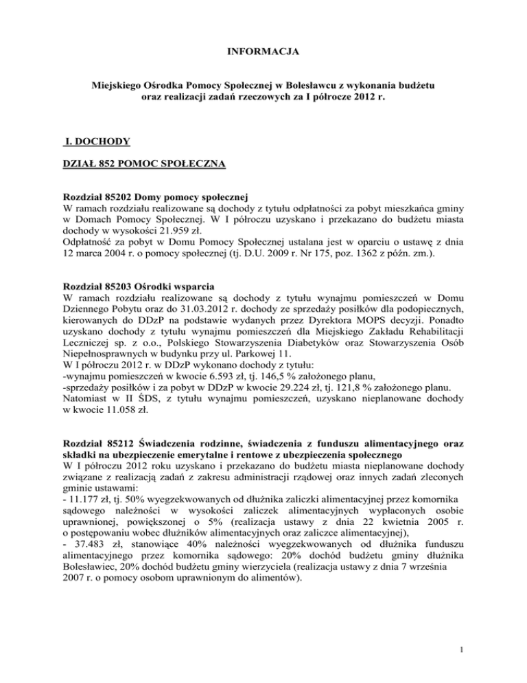 INFORMACJA Miejskiego Ośrodka Pomocy Społecznej w Bolesławcu z wykonania budżetu oraz realizacji zadań rzeczowych za I półrocze 2012 r. I. DOCHODY DZIAŁ 852 POMOC SPOŁECZNA Rozdział 85202 Domy pomocy społecznej W ramach rozdziału realizowane są dochody z tytułu odpłatności za pobyt mieszkańca gminy w Domach Pomocy Społecznej. W I półroczu uzyskano i przekazano do budżetu miasta dochody w wysokości 21.959 zł. Odpłatność za pobyt w Domu Pomocy Społecznej ustalana jest w oparciu o ustawę z dnia 12 marca 2004 r. o pomocy społecznej (tj. D.U. 2009 r. Nr 175, poz. 1362 z późn. zm.). Rozdział 85203 Ośrodki wsparcia W ramach rozdziału realizowane są dochody z tytułu wynajmu pomieszczeń w Domu Dziennego Pobytu oraz do 31.03.2012 r. dochody ze sprzedaży posiłków dla podopiecznych, kierowanych do DDzP na podstawie wydanych przez Dyrektora MOPS decyzji. Ponadto uzyskano dochody z tytułu wynajmu pomieszczeń dla Miejskiego Zakładu Rehabilitacji Leczniczej sp. z o.o., Polskiego Stowarzyszenia Diabetyków oraz Stowarzyszenia Osób Niepełnosprawnych w budynku przy ul. Parkowej 11. W I półroczu 2012 r. w DDzP wykonano dochody z tytułu: -wynajmu pomieszczeń w kwocie 6.593 zł, tj. 146,5 % założonego planu, -sprzedaży posiłków i za pobyt w DDzP w kwocie 29.224 zł, tj. 121,8 % założonego planu. Natomiast w II ŚDS, z tytułu wynajmu pomieszczeń, uzyskano nieplanowane dochody w kwocie 11.058 zł. Rozdział 85212 Świadczenia rodzinne, świadczenia z funduszu alimentacyjnego oraz składki na ubezpieczenie emerytalne i rentowe z ubezpieczenia społecznego W I półroczu 2012 roku uzyskano i przekazano do budżetu miasta nieplanowane dochody związane z realizacją zadań z zakresu administracji rządowej oraz innych zadań zleconych gminie ustawami: - 11.177 zł, tj. 50% wyegzekwowanych od dłużnika zaliczki alimentacyjnej przez komornika sądowego należności w wysokości zaliczek alimentacyjnych wypłaconych osobie uprawnionej, powiększonej o 5% (realizacja ustawy z dnia 22 kwietnia 2005 r. o postępowaniu wobec dłużników alimentacyjnych oraz zaliczce alimentacyjnej), - 37.483 zł, stanowiące 40% należności wyegzekwowanych od dłużnika funduszu alimentacyjnego przez komornika sądowego: 20% dochód budżetu gminy dłużnika Bolesławiec, 20% dochód budżetu gminy wierzyciela (realizacja ustawy z dnia 7 września 2007 r. o pomocy osobom uprawnionym do alimentów). 1 Rozdział 85214 Zasiłki i pomoc w naturze oraz składki na ubezpieczenia emerytalne i rentowe W I półroczu 2012 r. uzyskano i przekazano do budżetu miasta nieplanowane dochody: - z tytułu zwrotu zasiłków celowych dotyczących lat ubiegłych w wysokości 12.953 zł, - pozostałe opłaty (koszty upomnień) w wysokości 62 zł. Rozdział 85215 Dodatki mieszkaniowe W okresie sprawozdawczym uzyskano i przekazano do budżetu miasta nieplanowane dochody w wysokości 88 zł z tytułu nienależnie pobranych dodatków mieszkaniowych. Rozdział 85219 Ośrodki pomocy społecznej W I półroczu 2012 r. uzyskano i przekazano do budżetu miasta: - nieplanowane dochody w kwocie 308 zł, stanowiące wynagrodzenie płatnika z tytułu terminowego przekazywania podatków do budżetu państwa - nieplanowane dochody w kwocie 32 zł stanowiące odsetki od środków utrzymywanych na rachunku bankowym, Rozdział 85228 Usługi opiekuńcze i specjalistyczne usługi opiekuńcze W ramach rozdziału 85228 realizowane są dochody własne gminy. Na 2012 r. zaplanowano 75.000 zł. W analizowanym okresie wykonano i przekazano do budżetu miasta kwotę 41.434 zł, tj. 55,2 % planowanych dochodów, która wynika z wyższych dochodów podopiecznych a tym samym wyższej odpłatności za te usługi. 2 II. WYDATKI: WYDATKI BIEŻĄCE DZIAŁ 852 POMOC SPOŁECZNA Miejski Ośrodek Pomocy Społecznej w Bolesławcu jest samodzielną jednostką budżetową Gminy Miejskiej, która realizuje zadania ustawy o pomocy społecznej w ramach zadań własnych gminy i zadań zleconych przez administrację rządową. Ośrodek realizuje także zadania w zakresie świadczeń rodzinnych oraz zaliczki alimentacyjnej, a także dodatków mieszkaniowych. Do 31 marca 2012 r. w strukturach Miejskiego Ośrodka Pomocy Społecznej funkcjonowały też ośrodki wsparcia, tj. środowiskowe formy pomocy półstacjonarnej służące utrzymaniu osoby w jej naturalnym środowisku i przeciwdziałaniu instytucjonalizacji. Do ośrodków tych należą: - Dom Dziennego Pobytu z siedzibą przy ul. Staroszkolnej 6c, - Środowiskowy Dom Samopomocy z siedzibą w budynku Szpitala Wojewódzkiego przy ul. Aleja 1000-lecia, - II Środowiskowy Dom Samopomocy z siedzibą przy ul. Parkowej 11 w Bolesławcu. Ponadto w I półroczu br. wydatkowano środki finansowe z tytułu dodatkowego wynagrodzenia rocznego dla byłych pracowników Świetlicy Terapeutycznej. Rozdział 85202 Domy pomocy społecznej Plan po zmianach – 579.636 zł, wykonanie 358.290, tj. 61,8 % planu. Mieszkańcy Bolesławca, których stan zdrowia bezwzględnie wymaga skierowania do placówki zapewniającej całodobową opiekę, kierowani są do domów pomocy społecznej w najbliższej okolicy jak i do nowo otwartego Domu Pomocy Społecznej w Bolesławcu. W analizowanym okresie w domach pomocy społecznej przebywało 47 osób, za pobyt których poniesiono odpłatność w kwocie 358,290 zł. W związku z wykonaniem planu finansowego na poziomie 61,8%, znacznym, w stosunku do analogicznego okresu roku ubiegłego, wzrostem liczby osób objętych tą formą wsparcia i planowanym w II półroczu 2012 wzrostem do 59 osób, ustalonych na podstawie wprowadzonych do bazy danych, decyzji obligujących Gminę Miejską Bolesławiec do ponoszenia odpłatności za pobyt w Domach Pomocy Społecznej należy jednoznacznie stwierdzić, że zaplanowane środki są niewystarczające i bez dodatkowego zasilenia nie gwarantują właściwej realizacji zadania w tym rozdziale. Należy nadmienić, że pobyt w DPS-ach jest na