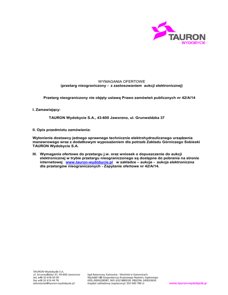 WYMAGANIA OFERTOWE (przetarg nieograniczony - z zastosowaniem aukcji elektronicznej) Przetarg nieograniczony nie objęty ustawą Prawo zamówień publicznych nr 42/A/14 I. Zamawiający: TAURON Wydobycie S.A., 43-600 Jaworzno, ul. Grunwaldzka 37 II. Opis przedmiotu zamówienia: Wyłonienie dostawcy jednego sprawnego technicznie elektrohydraulicznego urządzenia manewrowego wraz z dodatkowym wyposażeniem dla potrzeb Zakładu Górniczego Sobieski TAURON Wydobycie S.A. III. Wymagania ofertowe do przetargu j.w. oraz wniosek o dopuszczenie do aukcji elektronicznej w trybie przetargu nieograniczonego są dostępne do pobrania na stronie internetowej www.tauron-wydobycie.pl w zakładce – aukcje - aukcja elektroniczna dla przetargów nieograniczonych - Zapytanie ofertowe nr 42/A/14.