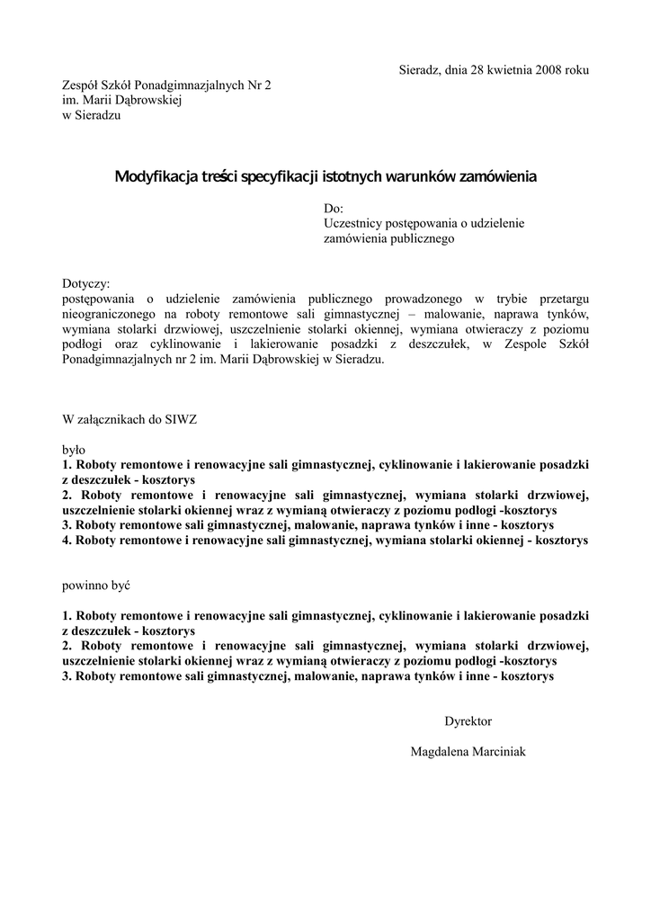 Sieradz, dnia 28 kwietnia 2008 roku Zespół Szkół Ponadgimnazjalnych Nr 2 im. Marii Dąbrowskiej w Sieradzu Modyfikacja treści specyfikacji istotnych warunków zamówienia Do: Uczestnicy postępowania o udzielenie zamówienia publicznego Dotyczy: postępowania o udzielenie zamówienia publicznego prowadzonego w trybie przetargu nieograniczonego na roboty remontowe sali gimnastycznej – malowanie, naprawa tynków, wymiana stolarki drzwiowej, uszczelnienie stolarki okiennej, wymiana otwieraczy z poziomu podłogi oraz cyklinowanie i lakierowanie posadzki z deszczułek, w Zespole Szkół Ponadgimnazjalnych nr 2 im. Marii Dąbrowskiej w Sieradzu. W załącznikach do SIWZ było 1. Roboty remontowe i renowacyjne sali gimnastycznej, cyklinowanie i lakierowanie posadzki z deszczułek - kosztorys 2. Roboty remontowe i renowacyjne sali gimnastycznej, wymiana stolarki drzwiowej, uszczelnienie stolarki okiennej wraz z wymianą otwieraczy z poziomu podłogi -kosztorys 3. Roboty remontowe sali gimnastycznej, malowanie, naprawa tynków i inne - kosztorys 4. Roboty remontowe i renowacyjne sali gimnastycznej, wymiana stolarki okiennej - kosztorys powinno być 1. Roboty remontowe i renowacyjne sali gimnastycznej, cyklinowanie i lakierowanie posadzki z deszczułek - kosztorys 2. Roboty remontowe i renowacyjne sali gimnastycznej, wymiana stolarki drzwiowej, uszczelnienie stolarki okiennej wraz z wymianą otwieraczy z poziomu podłogi -kosztorys 3. Roboty remontowe sali gimnastycznej, malowanie, naprawa tynków i inne - kosztorys Dyrektor Magdalena Marciniak