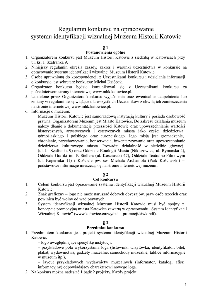 Regulamin konkursu na opracowanie systemu identyfikacji wizualnej Muzeum Historii Katowic 1. 2. 3. 4. 5. 6. 1. 2. 3. §1 Postanowienia ogólne Organizatorem konkursu jest Muzeum Historii Katowic z siedzibą w Katowicach przy ul. ks. J. Szafranka 9. Niniejszy regulamin określa zasady, zakres i warunki uczestnictwa w konkursie na opracowanie systemu identyfikacji wizualnej Muzeum Historii Katowic. Osobą uprawnioną do korespondencji z Uczestnikami konkursu i udzielania informacji o konkursie jest sekretarz konkursu: Michał Dzióbek. Organizator konkursu będzie komunikował się z Uczestnikami konkursu za pośrednictwem strony internetowej www.mhk.katowice.pl. Udzielone przez Organizatora konkursu wyjaśnienia oraz ewentualne uzupełnienia lub zmiany w regulaminie są wiążące dla wszystkich Uczestników z chwilą ich zamieszczenia na stronie internetowej www.mhk.katowice.pl. Informacje o muzeum: Muzeum Historii Katowic jest samorządową instytucją kultury i posiada osobowość prawną. Organizatorem Muzeum jest Miasto Katowice. Do zakresu działania muzeum należy dbanie o dokumentację przeszłości Katowic oraz upowszechnianie wartości historycznych, artystycznych i estetycznych miasta jako części dziedzictwa górnośląskiego i polskiego oraz europejskiego. Jego misją jest gromadzenie, chronienie, przechowywanie, konserwacja, inwentaryzowanie oraz upowszechnianie dziedzictwa kulturowego miasta. Prowadzi działalność w siedzibie głównej (ul. J. Szafranka 9) oraz Oddziale Etnologii Miasta (Nikiszowiec, ul. Rymarska 4), Oddziale Grafiki im. P. Stellera (ul. Kościuszki 47), Oddziale Teatralno-Filmowym (ul. Kopernika 11) i Kościele pw. św. Michała Archanioła (Park Kościuszki) – podstawowe informacje mieszczą się na stronie internetowej muzeum. §2 Cel konkursu Celem konkursu jest opracowanie systemu identyfikacji wizualnej Muzeum Historii Katowic. Znak graficzny – logo nie może naruszać dobrych obyczajów, praw osób trzecich oraz powinien być wolny od wad prawnych. System identyfikacji wizualnej Muzeum Historii Katowic musi być spójny z koncepcją promocyjną miasta Katowice zawartą w opracowaniu „System Identyfikacji Wizualnej Katowic” (www.katowice.eu/wydzial_promocji/siwk.pdf). §3 Przedmiot konkursu 1. Przedmiotem konkursu jest projekt systemu identyfikacji wizualnej Muzeum Historii Katowic: – logo uwzględniające specyfikę instytucji, – przykładowe pola wykorzystania loga (listownik, wizytówka, identyfikator, bilet, plakat, wydawnictwa, gadżety muzealne, samochody muzealne, tablice informacyjne w muzeum itp.), – layout przykładowych wydawnictw muzealnych (informator, katalog, afisz informacyjny) odpowiadający charakterowi nowego loga. 2. Na konkurs można nadesłać 1 bądź 2 projekty. Każdy projekt: 1 3. 4. 5. 6. – powinien być przedstawiony w wersji kolorowej, czarno-białej oraz na tle białym i tle czarnym, – należy zapisać na podpisanej płycie CD – wymagane pliki (do wyboru): Adobe Ilustrator, CorelDraw do wersji 11, EPS, TIFF (w rozdzielczości minimum 300 DPI), CMYK. Czcionki użyte w projekcie muszą być zamienione na krzywe. Obligatoryjnie do każdej wersji projektu muszą być dołączone wydruki komputerowe. Wydruki, na formacie A4, powinny zawierać: znak mieszczący się w polu 15 cm x 15 cm i zmniejszoną wersję 1,5 cm x 1,5 cm. Projekt znaku graficznego – logo powinien zawierać napis: Muzeum Historii Katowic, który należy traktować jako nazwę własną. Dopuszczalny jest indywidualny zapis graficzny tej nazwy. Znak graficzny – logo powinien być pozytywny, czytelny, uniwersalny, zrozumiały zarówno przez Polaków, jak i obcokrajowców. §4 Charakter i uczestnicy konkursu 1. Konkurs ma charakter ogólnopolski i jest adresowany do osób pełnoletnich: twórców, studentów wyższych szkół artystycznych, artystów plastyków, agencji reklamowych i PR z wyłączeniem pracowników i najbliższych członków rodziny (zstępni i wstępni) Muzeum Historii Katowic. 2. Każdy Uczestnik konkursu może zgłosić tylko 2 projekty systemu identyfikacji wizualnej Muzeum Historii Katowic. 3. Wszelkie koszty związane z uczestnictwem w konkursie oraz przygotowaniem projektu ponosi Uczestnik konkursu. §5 Warunki konkursu 1. Warunkiem uczestnictwa w konkursie jest: a) akceptacja i przestrzeganie regulaminu konkursu, b) dostarczenie pracy konkursowej zgodnie z wymaganiami, c) dostarczenie wraz z pracą konkursową prawidłowo wypełnionego formularza zgłoszeniowego (stanowiącego załącznik nr 1 do regulaminu) i oświadczenia autora (§ 8 punkt 3). 2. Nadesłanie prac konkursowych jest równoznaczne z akceptacją warunków konkursu. 1. 2. 3. 4. 5. §6 Przebieg konkursu Konkurs składa się z jednego etapu. Uczestnicy przesyłają prace konkursowe przygotowane zgodnie z wymogami opisanymi w § 3 wraz z formularzem zgłoszeniowym i oświadczeniem autora w terminie określonym w § 8 niniejszego regulaminu. Praca konkursowa musi być oznaczona 8-elementowym kodem identyfikacyjnym złożonym z 4 cyfr i 4 liter, który powinien znajdować się w prawym górnym rogu pracy konkursowej. W przypadku wpłynięcia do siedziby Organizatora konkursu kilku prac konkursowych o takim samym kodzie indentyfikacyjnym, Organizator nada im własny 8-elementowy kod identyfikacyjny złożony z 4 cyfr i 4 liter. Uczestnicy konkursu zostaną wpisani do protokołu przyjęcia prac konkursowych, który zostanie zamieszczony na stronie internetowej mhk.katowice.pl w terminie 7 dni od daty końcowej składania prac konkursowych. 2 6. 7. 8. 9. 10. Jury powołane przez Organizatora wybierze zwycięzcę konkursu i przyzna mu nagrodę pieniężną. Po wyborze zwycięskiej pracy nastąpi jej rozkodowanie. Organizator ogłasza zwycięzcę i przekazuje nagrodę, stanowiącą zarazem wynagrodzenie za przeniesienie na Organizatora praw autorskich do zwycięskiej pracy. Sposób przekazania praw własności do pracy konkursowej oraz wypłacenia nagrody 