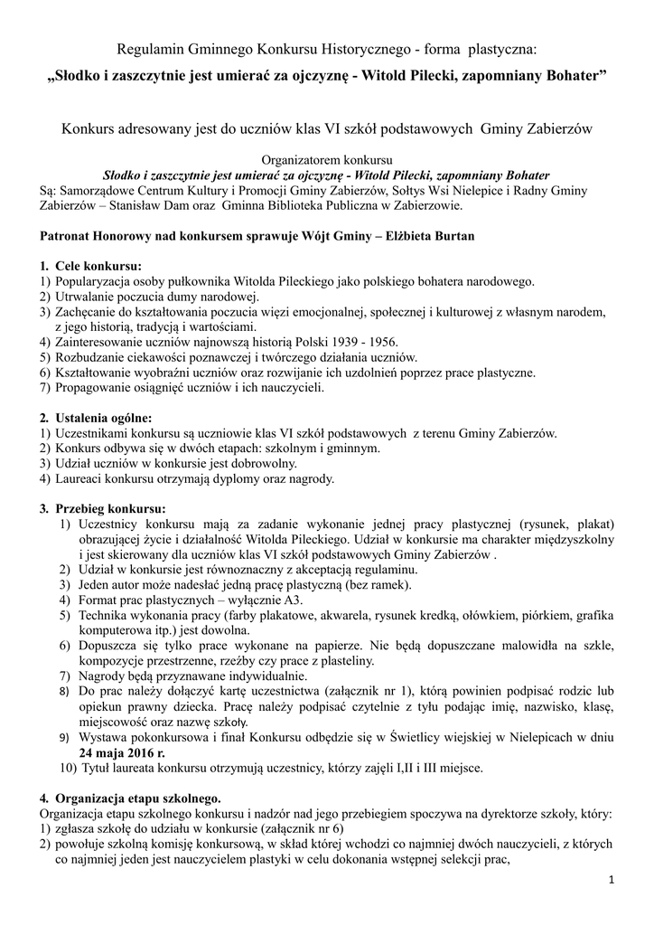 Regulamin Gminnego Konkursu Historycznego - forma plastyczna: „Słodko i zaszczytnie jest umierać za ojczyznę - Witold Pilecki, zapomniany Bohater” Konkurs adresowany jest do uczniów klas VI szkół podstawowych Gminy Zabierzów Organizatorem konkursu Słodko i zaszczytnie jest umierać za ojczyznę - Witold Pilecki, zapomniany Bohater Są: Samorządowe Centrum Kultury i Promocji Gminy Zabierzów, Sołtys Wsi Nielepice i Radny Gminy Zabierzów – Stanisław Dam oraz Gminna Biblioteka Publiczna w Zabierzowie. Patronat Honorowy nad konkursem sprawuje Wójt Gminy – Elżbieta Burtan 1. 1) 2) 3) 4) 5) 6) 7) Cele konkursu: Popularyzacja osoby pułkownika Witolda Pileckiego jako polskiego bohatera narodowego. Utrwalanie poczucia dumy narodowej. Zachęcanie do kształtowania poczucia więzi emocjonalnej, społecznej i kulturowej z własnym narodem, z jego historią, tradycją i wartościami. Zainteresowanie uczniów najnowszą historią Polski 1939 - 1956. Rozbudzanie ciekawości poznawczej i twórczego działania uczniów. Kształtowanie wyobraźni uczniów oraz rozwijanie ich uzdolnień poprzez prace plastyczne. Propagowanie osiągnięć uczniów i ich nauczycieli. 2. 1) 2) 3) 4) Ustalenia ogólne: Uczestnikami konkursu są uczniowie klas VI szkół podstawowych z terenu Gminy Zabierzów. Konkurs odbywa się w dwóch etapach: szkolnym i gminnym. Udział uczniów w konkursie jest dobrowolny. Laureaci konkursu otrzymają dyplomy oraz nagrody. 3. Przebieg konkursu: 1) Uczestnicy konkursu mają za zadanie wykonanie jednej pracy plastycznej (rysunek, plakat) obrazującej życie i działalność Witolda Pileckiego. Udział w konkursie ma charakter międzyszkolny i jest skierowany dla uczniów klas VI szkół podstawowych Gminy Zabierzów . 2) Udział w konkursie jest równoznaczny z akceptacją regulaminu. 3) Jeden autor może nadesłać jedną pracę plastyczną (bez ramek). 4) Format prac plastycznych – wyłącznie A3. 5) Technika wykonania pracy (farby plakatowe, akwarela, rysunek kredką, ołówkiem, piórkiem, grafika komputerowa itp.) jest dowolna. 6) Dopuszcza się tylko prace wykonane na papierze. Nie będą dopuszczane malowidła na szkle, kompozycje przestrzenne, rzeźby czy prace z plasteliny. 7) Nagrody będą przyznawane indywidualnie. 8) Do prac należy dołączyć kartę uczestnictwa (załącznik nr 1), którą powinien podpisać rodzic lub opiekun prawny dziecka. Pracę należy podpisać czytelnie z tyłu podając imię, nazwisko, klasę, miejscowość oraz nazwę szkoły. 9) Wystawa pokonkursowa i finał Konkursu odbędzie się w Świetlicy wiejskiej w Nielepicach w dniu 24 maja 2016 r. 10) Tytuł laureata konkursu otrzymują uczestnicy, którzy zajęli I,II i III miejsce. 4. Organizacja etapu szkolnego. Organizacja etapu szkolnego konkursu i nadzór nad jego przebiegiem spoczywa na dyrektorze szkoły, który: 1) zgłasza szkołę do udziału w konkursie (załącznik nr 6) 2) powołuje szkolną komisję konkursową, w skład której wchodzi co najmniej dwóch nauczycieli, z których co najmniej jeden jest nauczycielem plastyki w celu dokonania wstępnej selekcji prac, 1 3) na etap gminny konkursu szkoła przesyła 10 najwyżej ocenionych prac, 4) uzyskanie zgody rodziców (prawnych opiekunów) uczniów biorących udział w etapie gminnym konkursu na przetwarzanie do celów konkursu danych osobowych oraz zgodę na udostępnieni wizerunku dzieci na stronach www (załączniki nr 2 i 3), 5) przesyła na adres e-mail koordynatora konkursu wersję elektroniczną protokołu z przebiegu eliminacji szkolnych, 6) przestrzega, określonych w harmonogramie konkursu terminów (załącznik nr 5). Prace uczestników konkursu, którzy przeszli do etapu gminnego należy dostarczyć do SCKiPGZ lub GBP w Zabierzowie do 10.05.2016 r. 5. Organizacja etapu gminnego. Za organizację i przebieg etapu Gminnego Konkursu odpowiada koordynator konkursu – Anna Nowecka 1) Do zadań koordynatora należy: a) ogłoszenie na stronach internetowych Gminy, SCKiPGZ, GBP listy uczniów zakwalifikowanych do etapu gminnego wraz z wynikami punktowymi wszystkich uczestników etapu szkolnego, b) zorganizowanie i przeprowadzenie etapu gminnego, c) przygotowanie wystawy pokonkursowej, d) przygotowanie dyplomów dla uczestników etapu gminnego i laureatów, e) przygotowanie podziękowań dla nauczycieli pracujących w komisjach szkolonych, f) sporządzenie sprawozdania z przebiegu gminnego etapu konkursu. 6. Zasady oraz procedury sprawdzania i oceniania prac. 1) Prace plastyczne oceniane będą według następujących kryteriów (załącznik nr 4) a) zgodność pracy z tematem konkursu, b) samodzielność wykonania pracy, c) wartość artystyczna, d) estetyka, e) pomysłowość. 2) Na etapie szkolnym prace uczniów są oceniane przez nauczycieli szkoły - członków komisji szkolnej. 3) Na etapie gminnym p.o. Dyrektor SCKiPGZ Anna Domagała powoła komisję konkursową. 4) Ogłoszenie wyników konkursu. 5) O wynikach konkursu na etapie gminnym i terminie rozdania nagród podczas finału Gminnego Konkursu Historycznego: Słodko i zaszczytnie jest umierać za ojczyznę - Witold Pilecki, zapomniany Bohater, który odbędzie w Świetlicy Wiejskiej w Nielepicach szkoły zostaną poinformowane oddzielnym e-mailem. 6) Decyzje komisji szkolnej i gminnej są ostateczne i nie przysługuje od nich odwołanie. 7) Z chwilą nadesłania prace przechodzą na własność Organizatora. Udział w konkursie jest jednoznaczny z wyrażeniem zgody na bezpłatne wykorzystywanie nadesłanych prac konkursowych w ramach działalności Organizatora. 8) Prace wykonane niezgodnie z regulaminem nie będą brane pod uwagę. a) wykaz literatury: • PILECKI. Śladami mojego taty, Z Andrzejem Pileckim rozmawiają Mirosław Krzyszkowski i Bogdan Wasztyl, Kraków, Wyd. Znak – Horyzont, 2015. • Literatura uzupełniająca Ochotnik do Auschwitz: Witold Pilecki (1901-1948), Adam Cyra, Oświęcim, Chrześcijańskie Stowarzyszenie Rodzin Oświęcimsk