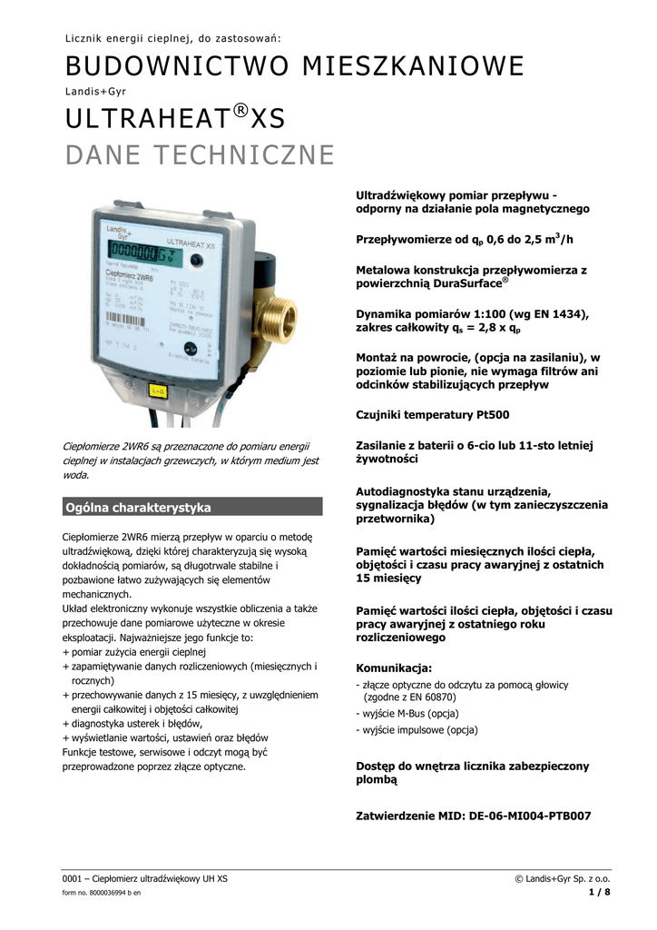 Licznik energii cieplnej, do zastosowań: B U D O W NI C T W O MI E S Z K A NI O W E Landis+Gyr U L T R A H EA T ® X S D A N E T EC H N I C Z N E Ultradźwiękowy pomiar przepływu odporny na działanie pola magnetycznego Przepływomierze od qp 0,6 do 2,5 m3/h Metalowa konstrukcja przepływomierza z powierzchnią DuraSurface® Dynamika pomiarów 1:100 (wg EN 1434), zakres całkowity qs = 2,8 x qp MontaŜ na powrocie, (opcja na zasilaniu), w poziomie lub pionie, nie wymaga filtrów ani odcinków stabilizujących przepływ Czujniki temperatury Pt500 Ciepłomierze 2WR6 są przeznaczone do pomiaru energii cieplnej w instalacjach grzewczych, w którym medium jest woda. Ogólna charakterystyka Ciepłomierze 2WR6 mierzą przepływ w oparciu o metodę ultradźwiękową, dzięki której charakteryzują się wysoką dokładnością pomiarów, są długotrwale stabilne i pozbawione łatwo zuŜywających się elementów mechanicznych. Układ elektroniczny wykonuje wszystkie obliczenia a takŜe przechowuje dane pomiarowe uŜyteczne w okresie eksploatacji. NajwaŜniejsze jego funkcje to: + pomiar zuŜycia energii cieplnej + zapamiętywanie danych rozliczeniowych (miesięcznych i rocznych) + przechowywanie danych z 15 miesięcy, z uwzględnieniem energii całkowitej i objętości całkowitej + diagnostyka usterek i błędów, + wyświetlanie wartości, ustawień oraz błędów Funkcje testowe, serwisowe i odczyt mogą być przeprowadzone poprzez złącze optyczne. Zasilanie z baterii o 6-cio lub 11-sto letniej Ŝywotności Autodiagnostyka stanu urządzenia, sygnalizacja błędów (w tym zanieczyszczenia przetwornika) Pamięć wartości miesięcznych ilości ciepła, objętości i czasu pracy awaryjnej z ostatnich 15 miesięcy Pamięć wartości ilości ciepła, objętości i czasu pracy awaryjnej z ostatniego roku rozliczeniowego Komunikacja: - złącze optyczne do odczytu za pomocą głowicy (zgodne z EN 60870) - wyjście M-Bus (opcja) - wyjście impulsowe (opcja) Dostęp do wnętrza licznika zabezpieczony plombą Zatwierdzenie MID: DE-06-MI004-PTB007 0001 – Ciepłomierz ultradźwiękowy UH XS form no. 8000036994 b en © Landis+Gyr Sp. z o.o. 1/8 Informacje ogólne Ciepłomierz ULTRAHEAT® XS jest przyrządem pomiarowym przeznaczonym do pomiaru i rejestracji zuŜycia ciepła. Do wyznaczenia ilości energii cieplnej ciepłomierz wykorzystuje dwie wielkości fizyczne: + objętościowe natęŜenie przepływu medium (wody) + róŜnicę temperatur w punktach zasilania i powrotu Przepływ objętościowy jest mierzony bez stosowania elementów ruchomych – w oparciu o ultradźwiękową metodę pomiaru. Metoda wykorzystuje zjawisko propagacji fal ultradźwiękowych w płynącej wodzie i jej zaleŜność od dwóch czynników: + prędkości fal ultradźwiękowych w wodzie, + prędkości przepływu wody RóŜnica czasu pomiedzy impulsem ultradźwiękowym wysyłanym zgodnie z kierunkiem przepływu i przeciwnie, pozwala wyznaczyć prędkość wody w odcinku pomiarowym, dalej przeliczaną na objętość. Woda przepływa przez przetwornik przepływu. Po stronie dopływu i odpływu przetwornika, w odległości „l” zainstalowane są przetworniki ultradźwiękowe. Dwa przetworniki na przemian wytwarzają fale ultradźwiękowe, które wysyłane są w kierunku zgodnym i przeciwnym do kierunku przepływu wody a następnie są odbierane przez przeciwległy przetwornik. Przetworniki ultradźwiękowe są pobudzane krótkimi impulsami prostokątnymi o częstotliwości ok. 1,25 MHz. Sygnały te są wytwarzane przez ASIC, w którym wbudowany jest teŜ układ elektroniczny analizujący odbierany sygnał. PrzeciąŜenie przepływu (>qs) jest mierzone do wartości granicznej 2.8 * qp. Wartość ta jest wyświetlana, nawet jeśli natęŜenie przepływu przekroczy ją. Pomiar przepływu Pomiary są dokonywane poprzez analizę fal ultradźwiękowych. Mierzone są na przemian: czas propagacji fal ultradźwiękowych wysyłanych w kierunku przecinym tup oraz czas propagacji fal wysyłanych w kierunku zgodnym tdown. Im większa jest prędkość przepływu nośnika ciepła, tym większa jest róŜnica czasów ∆t = tup - tdown. W oparciu o zmierzone wartości tup oraz tdown, stały przekrój poprzeczny A przetwornika, oraz odległość l między nadajnikami ultradźwięków - mikroprocesor oblicza natęŜenie przepływu według wzoru: (tup - tdown ) x l x A q = –––––––––––-----2 x tup x tdown Przy zastosowaniu tej metody nie jest konieczny pomiar prędkości dźwięku w nośniku, poniewaŜ jest ona pośrednio uwzględniona w czasach propagacji tup i tdown. Pomiary są dokonywane w okresach 8s. © Landis+Gyr Sp. z o.o. 2/8 Pomiar temperatury Wartości temperatur w punkcie zasilania i powrotu są mierzone dwoma platynowymi czujnikami temperatury (rezystancyjnymi). Temperatury wody na zasilaniu i powrocie są mierzone przy uŜyciu czujników platynowych. Licznik ciepła 2WR6 jest wyposaŜony w czujniki temperatury podłączone na stałe. Usterki występujące przy wyznaczaniu wielkości mierzonych (przerwany obwód, zwarcie, itp.) są wykrywane przez licznik i wyświetlane jako błędy. Przetwarzanie analogowo-cyfrowe jest dokonywane z reguły w okresach 60s (opcjonalnie w odstępach 8s.), przy uŜyciu przetwornika typu sigma-detla wbudowanego w ASIC. Obliczanie energii Układ elektroniczny oblicza ilość energii cieplnej według wzoru: E = k x ∆t x V E k ∆t V = = = = energia cieplna ciepło właściwe wody róŜnica temperatur na zasilaniu i powrocie objętość Wskazania przelicznika Ciepłomierz UHXS posiada duŜy ciekłokrystaliczny wyświetlacz, zawierający 7 cyfr i oznaczenie jednostki. Dla ułatwienia identyfikacji wartości po przecinku dodatkowo zaznaczone są ramką. Nawigacja pomiędzy wskazaniami odbywa się za pomocą przycisku umieszczonego na panelu ciepłomierza. Komunikaty wyświetlacza składają się z kilku poziomów. Niniejsza instrukcja opisuje ustawienia standardowe. KaŜde krótkie