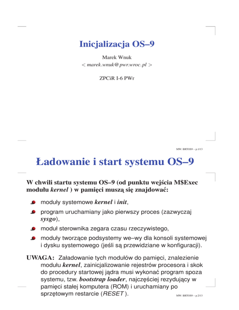 Inicjalizacja OS–9 Marek Wnuk < [email protected] > ZPCiR I-6 PWr MW: BRTOS9 – p.1/13 Ładowanie i start systemu OS–9 W chwili startu systemu OS–9 (od punktu wejścia M$Exec modułu kernel ) w pami˛eci musza˛ si˛e znajdować: moduły systemowe kernel i init, program uruchamiany jako pierwszy proces (zazwyczaj sysgo), moduł sterownika zegara czasu rzeczywistego, moduły tworzace ˛ podsystemy we–wy dla konsoli systemowej i dysku systemowego (jeśli sa˛ przewidziane w konfiguracji). UWAGA: Załadowanie tych modułów do pamieci, ˛ znalezienie modułu kernel, zainicjalizowanie rejestrów procesora i skok do procedury startowej jadra ˛ musi wykonać program spoza systemu, tzw. bootstrap loader, najcz˛eściej rezydujacy ˛ w pamieci ˛ stałej komputera (ROM) i uruchamiany po sprz˛etowym restarcie (RESET ). MW: BRTOS9 – p.2/13 Budowa i funkcje programu bootstrap plik procedura wykonywane zadania SysInit poczatkowa ˛ inicjalizacja sprz˛etu źródłowy sysinit.a boot.a budowa tablic skoków do procedur obsługi wyjatków ˛ boot.a określenie MPUType (typu procesora) sysinit.a SInitTwo dokończenie inicjalizacji sprz˛etu – odblokowanie przerwań boot.a poszukiwanie pamieci ˛ i budowa listy pamieci ˛ RAM i ROM sysboot.a boot.a SysBoot ładowanie systemu (dołaczenie ˛ obszaru do listy ROM) i poszukiwanie modułu kernel ustawienie rejestrów i skok do miejsca startu kernel-a (M$Exec) MW: BRTOS9 – p.3/13 Pami˛eć przed startem jadra ˛ systemu Obszar zmiennych w pami˛eci RAM o wielkości 8 kB: 0 – 2539 – tablica skoków do procedur obsługi wyjatków ˛ (2540 bajtów), 2540 – 4095 – obszar na stos roboczy bootloader-a (wskazywany przez rejestr wskaźnika stosu a7), 4096-8191 – obszar na globalne zmienne systemowe (D_), wskazywany przez a6. UWAGA: Tablica skoków zawiera 254 elementy stanowiace ˛ indywidualne punkty wejścia procedur obsługi błedów: ˛ PEA JMP #N*4 BadExcpt adres wektora na stos skok do obslugi w boot.a W sytuacji wyjatkowej ˛ na stosie składowany jest adres wektora i nastepuje skok do procedury obslugi (poczatkowo ˛ wszystkie prowadza˛ do procedury BadExcpt z pliku boot.a). MW: BRTOS9 – p.4/13 Lista RAM i ROM (bootstrap) Znalezione bloki RAM – łaczone ˛ w list˛e wskazywana˛ przez a4: a4 ⇒ next_block ⇒ ... ⇒ 0 block_size block_size ... ... Znalezione bloki ROM – zapami˛etywane na stosie (a7): a7 ⇒ last_block_addr last_block_size ... 1-st_block_addr 1-st_block_addr MW: BRTOS9 – p.5/13 Przygotowanie rejestrów dla kernel-a d0.l = ilość wolnej pamieci ˛ RAM d1.b = typ procesora (MPUType) d2.b = flaga debugger-a (0=brak) d3.l = typ restartu 0-cold (1-quick) d4.l = 0 d5.l = 0 d6.l = 0 d7.l = 0 (a0) = adres startu znalezionego modułu kernel (a1) = adres startu bootstrap (przy błedzie ˛ fatalnym) (a2) = 0 (a3) = 0 (a4) = wskaźnik listy wolnej pamieci ˛ RAM (a5) = adres tablicy skoków dla wyjatków ˛ (a6) = adres obszaru zmiennych globalnych(D_) (a7) = mapa pamieci ˛ ROM MW: BRTOS9 – p.6/13 Start jadra ˛ systemu (kernel) 1. Poszukiwanie modułów w pamieci ˛ ROM (z listy na stosie), sprawdzanie ich poprawności (CRC) i dodawanie ich do systemowej kartoteki modułów. 2. Dołaczenie ˛ (F$Link) do modułu konfiguracyjnego init (jego brak jest błedem ˛ fatalnym). 3. Zainicjalizowanie wszystkich tablic i struktur systemowych, otwarcie domyślnych ścieżek we–wy systemowych (zazwyczaj /term ) i domyślnych katalogów na dysku systemowym (zazwyczaj /dd ). 4. Uruchomienie (F$Fork) pierwszego procesu (zazwyczaj sysgo ). 5. Uruchomienie procesu systemowego (kod w kernel, ID=1), niewidocznego dla użytkownika, obsługujacego ˛ funkcje czasu rzeczywistego (przerwania od RTC). 6. Koniec procedury startowej. MW: BRTOS9 – p.7/13 Moduł konfiguracyjny init typedef struct { struct modhcom _mh; long _mmaxmem; ushort _mpollsz, _mdevcnt, _mprocs, _mpaths, _msysparam, _msysgo, _msysdrive, /* /* /* /* /* /* /* /* /* /* /* common header info */ top limit of free ram */ number of IRQ polling tbl entries */ number of device table entries */ number of process table entries */ number of path table entries */ offset to parameter string for _msysgo */ /* offset to initial module name */ /* offs. to sys. dev. name */ MW: BRTOS9 – p.8/13 Moduł konfiguracyjny init _mconsol, _mextens, _mclock, _mslice, _mip_id; long _msite; ushort _minstal; long _mcputyp; char _mos9lvl[4]; ushort _mos9rev, _msyspri, _mminpty, _maxage; /* offset to console name */ /* offset to customization module name list */ /* offset to clock module name */ /* number of clock ticks per time slice */ /* interprocessor identif. */ /* installation site code */ /* installation name offs. */ /* cpu class (000/.../070) */ /* system lvl/ver./edition */ /* offs. to lvl/rev string */ /* initial system priority */ /* initial min. executable priority */ /* initial maximum natural process age */MW: BRTOS9 – p.9/13 Moduł konfiguracyjny init long _mmdirsz; ushort _mevents; /* nbr of moddir entries */ /* number of system event table entries */ char _mcompat, /* ver. change byte #1 */ _mcompat2; /* ver. change byte #2*/ ushort _mmemlist, /* offs. to col. mem. list */ _stacksz, /* IRQ stack size (lwords) */ _mcoldretrys, /* coldstart chd retry ctr */ _mreserved[10];/* reserved space */ }mod_config; MW: BRTOS9 – p.10/13 Typowy program startowy sysgo Entry lea os9 * WELCOME En0 move.w move.l lea os9 * F$STime move.l move.l os9 bcc.s move move.l lea os9 Intercpt(pc),a0 F$Icpt message #1,d0 std IO path #Msg1Siz,d1 Msg1Str(pc),a0 I$WritLn #$00080000,d0 #$07c30000,d1 F$STime En1 #1,d0 #TimESiz,d1 TimEStr(pc),a0 I$WritLn 00hhmmss yyyymmdd rtc --> mm = 0: set from chip MW: BRTOS9 – p.11/13 Typowy program startowy sysgo * shell -p=" sh> " En4 moveq #0,d0 any type module moveq #0,d1 default memory size moveq #ShellPSiz,d2 parmameter size moveq #3,d3 copy std IÓ paths move.w #Priority,d4 medium priority lea ShellStr(pc),a0 process to create lea ShellPar(pc),a1 parameter stri